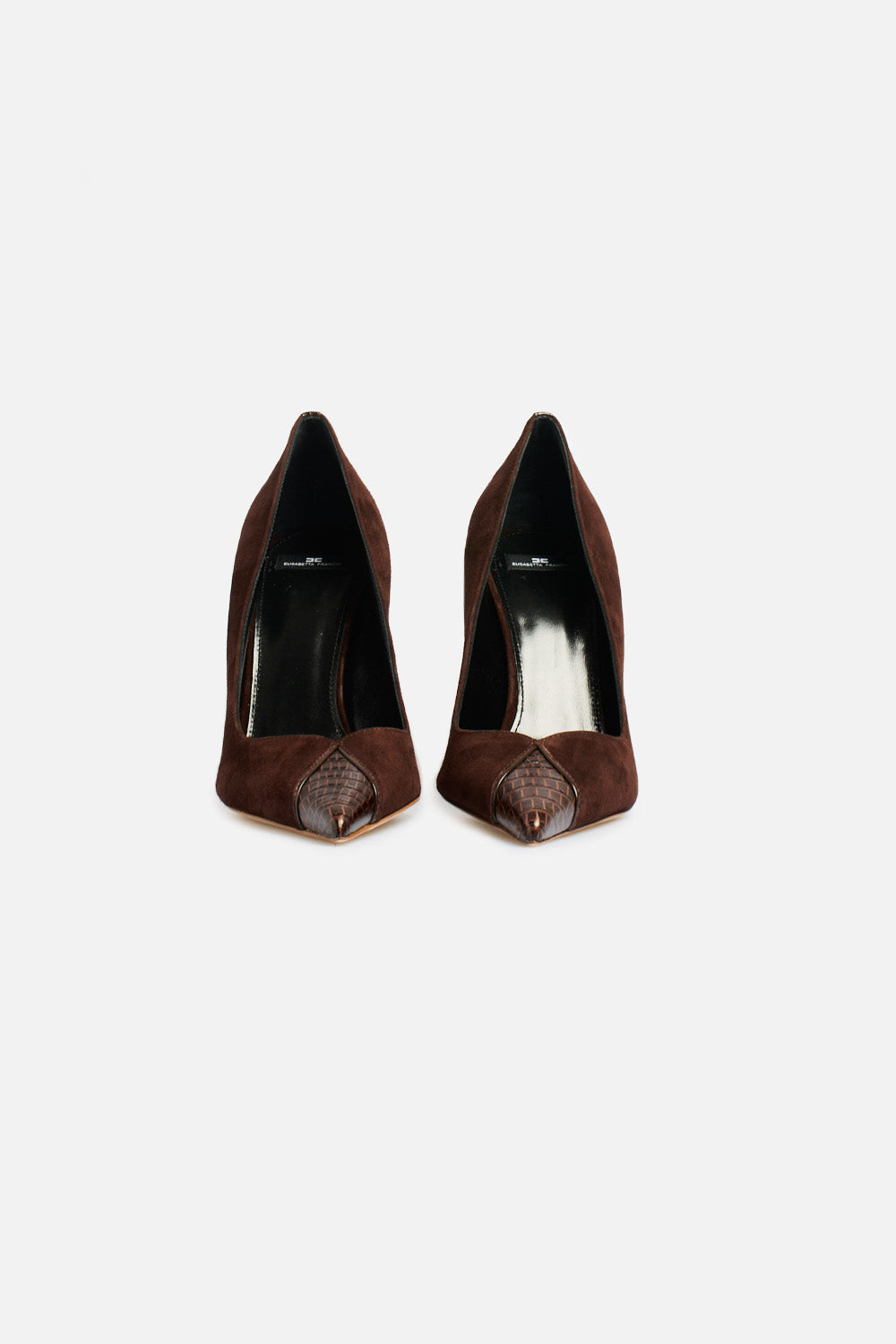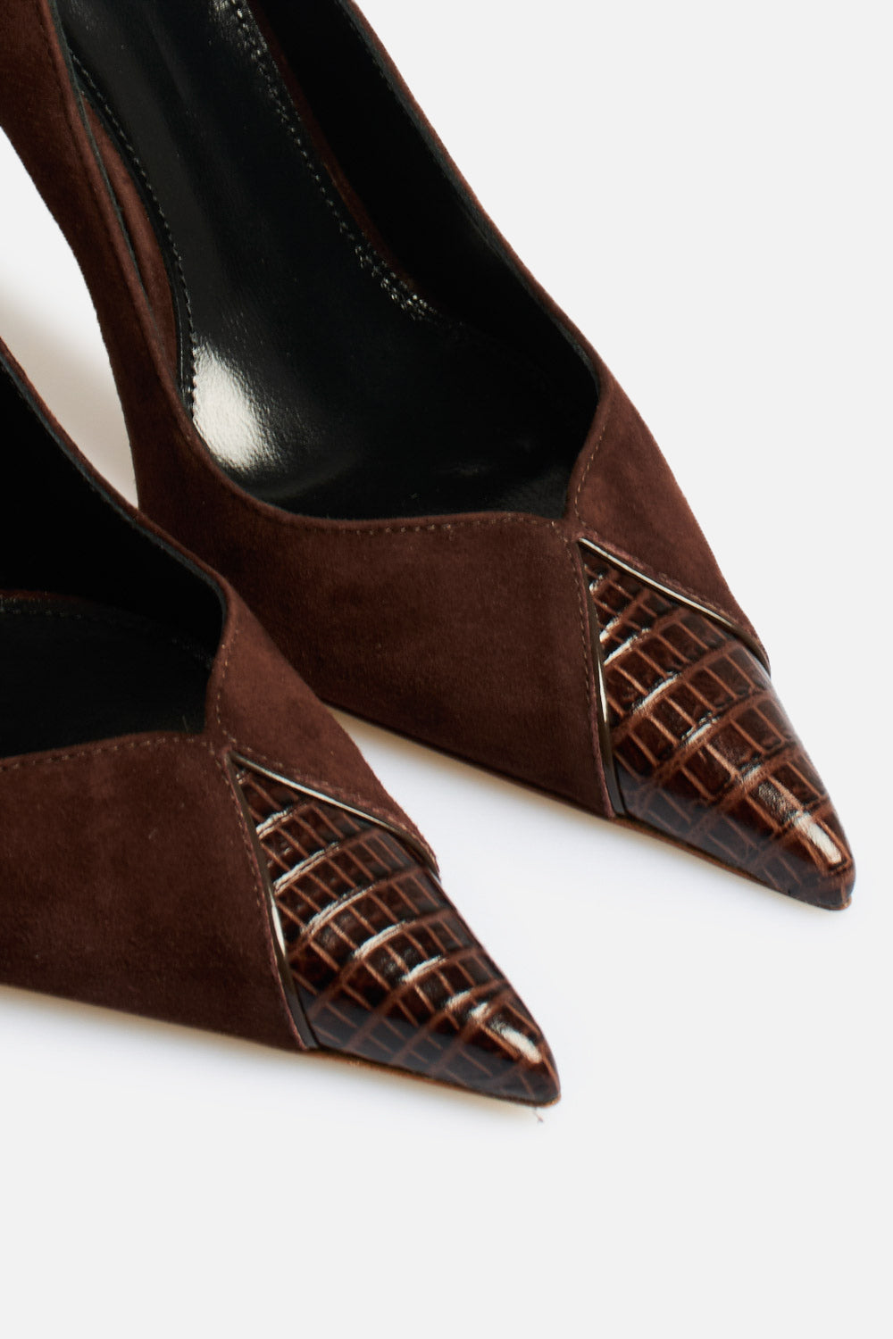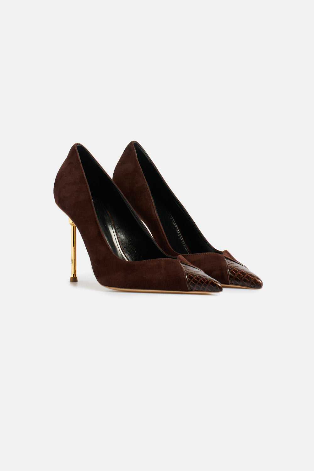 Leather pumps by Elisabetta Franchi, sculptural heel with gold finish that slims the figure and gives a geometric line, leather sole