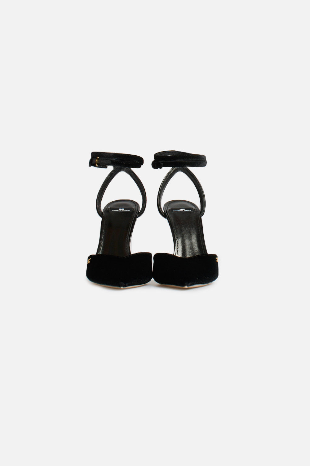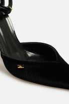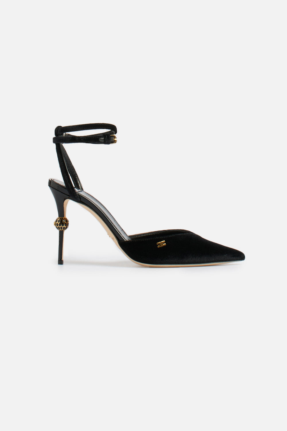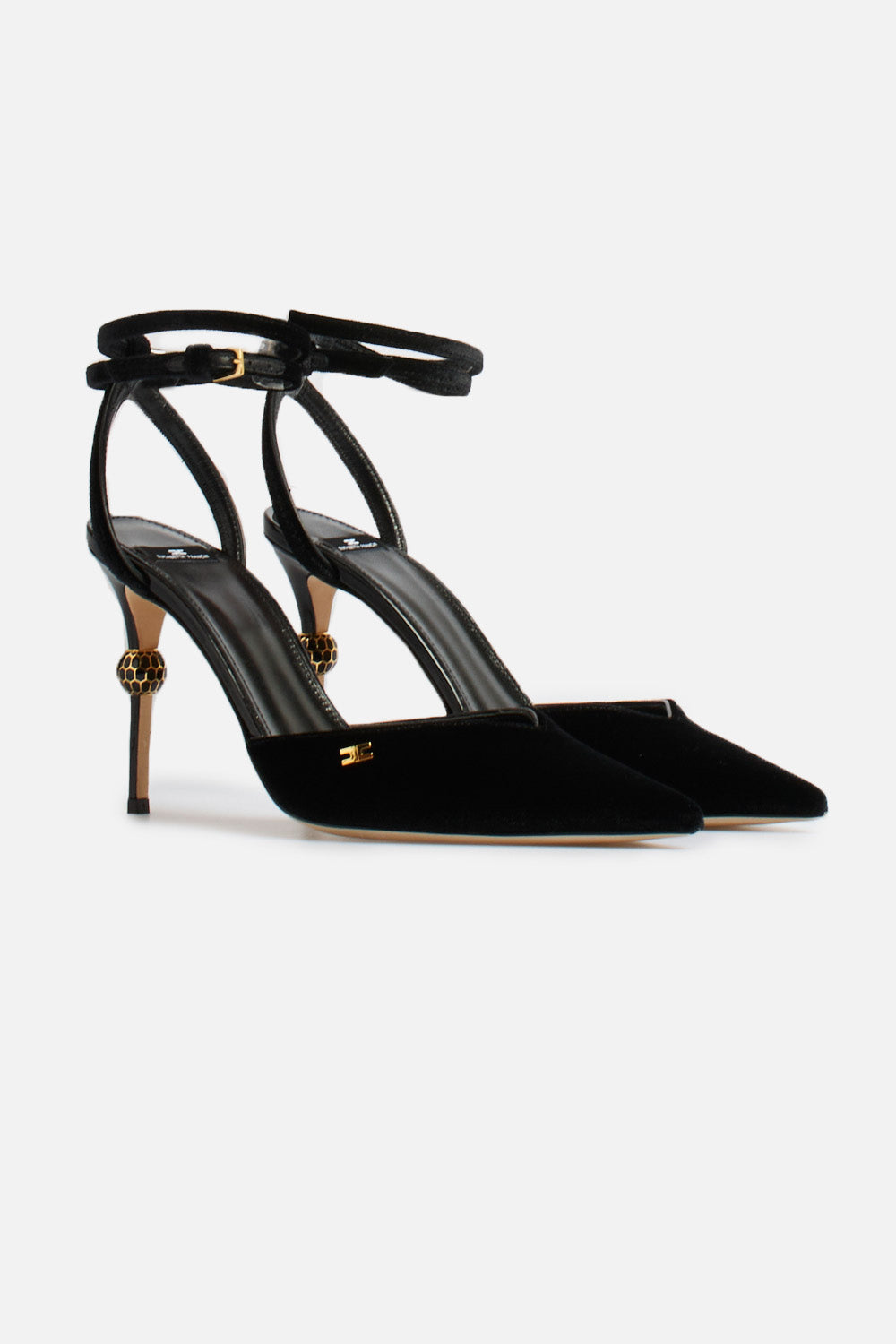 Pointed-toe slingbacks made of velvet-effect material, with a tapered construction and smooth upper. The model features a double ankle strap with an adjustable buckle and a gold-tone metal logo on the outside. The stiletto heel is embellished with an enameled ball with a geometric design inspired by snakeskin textures.