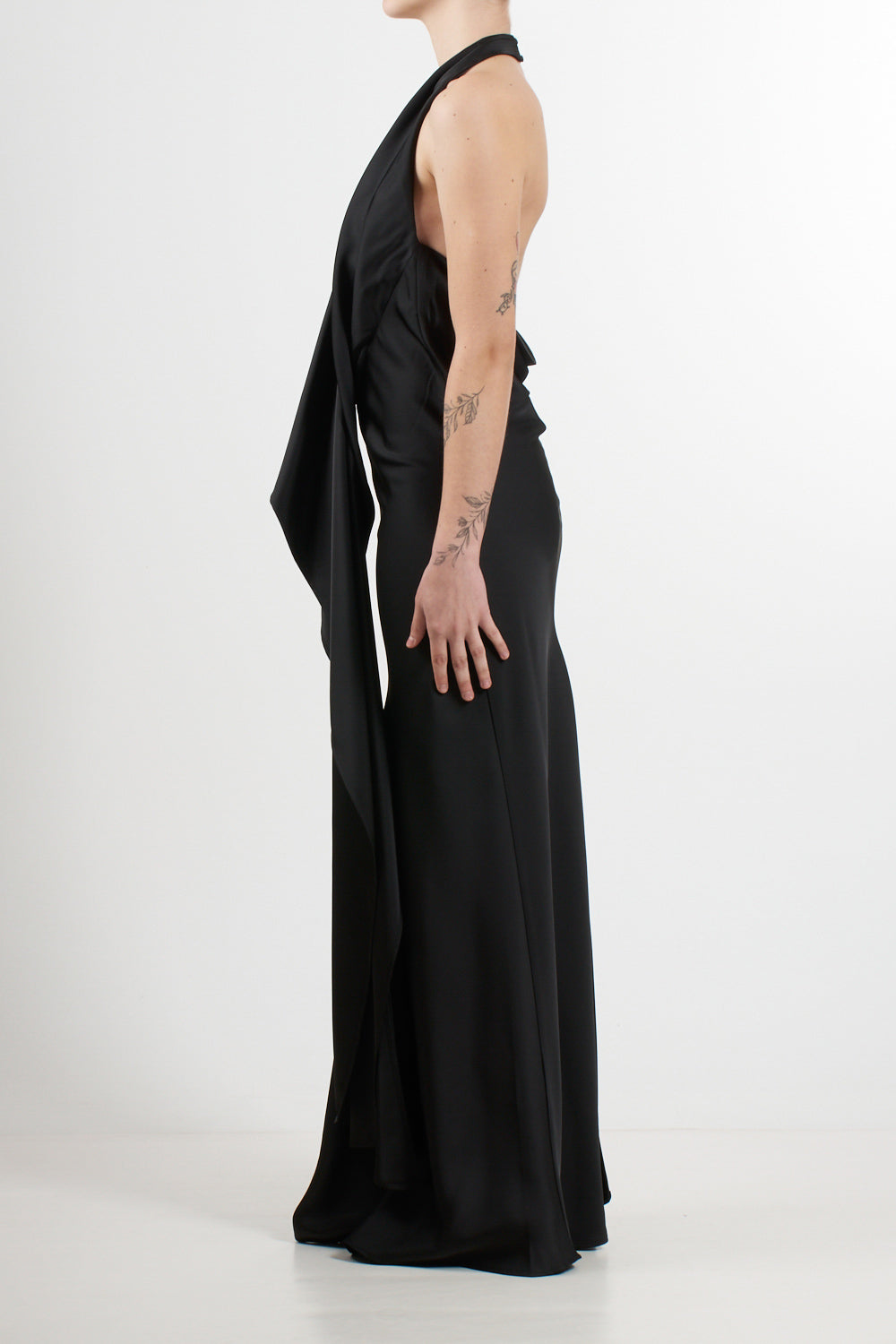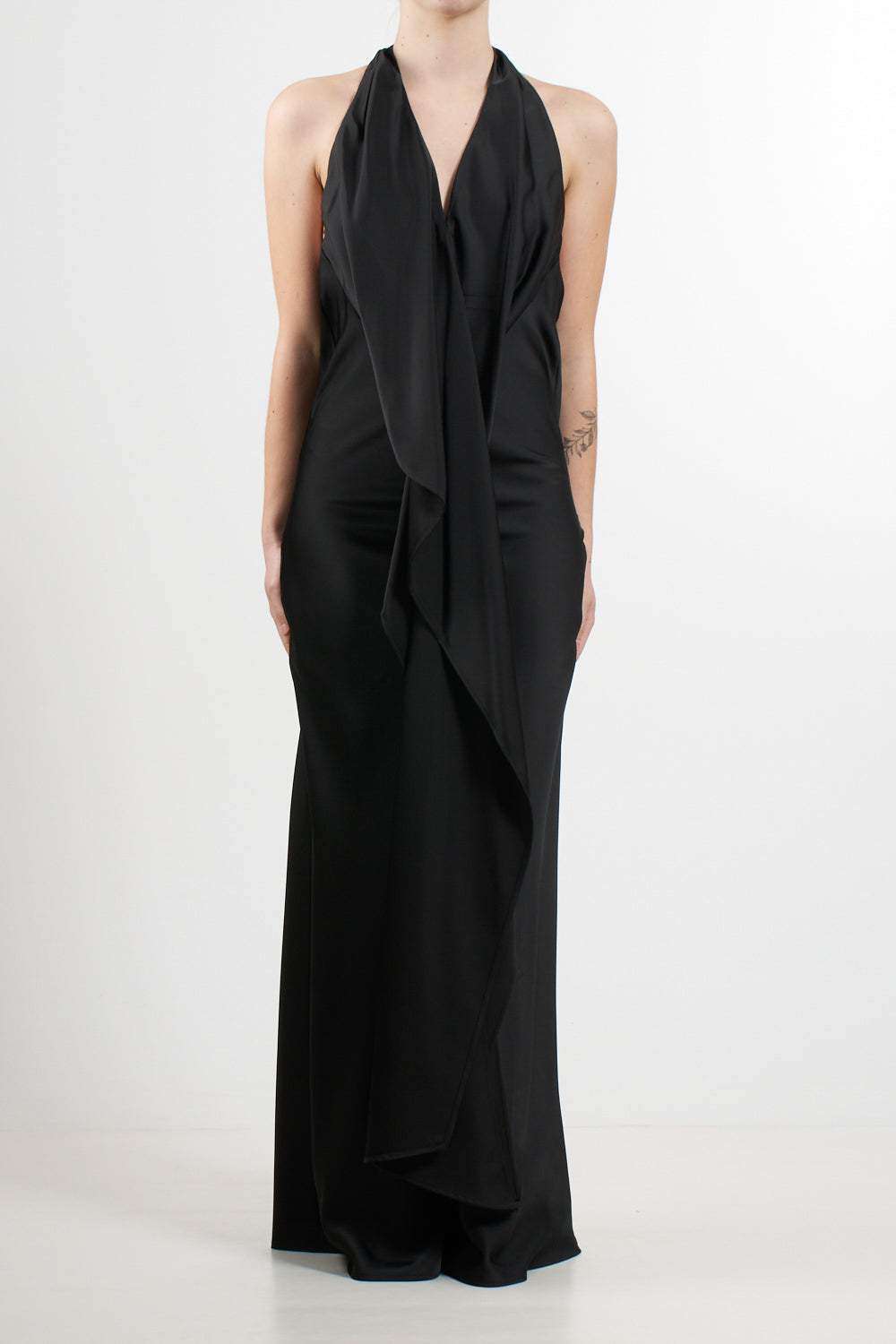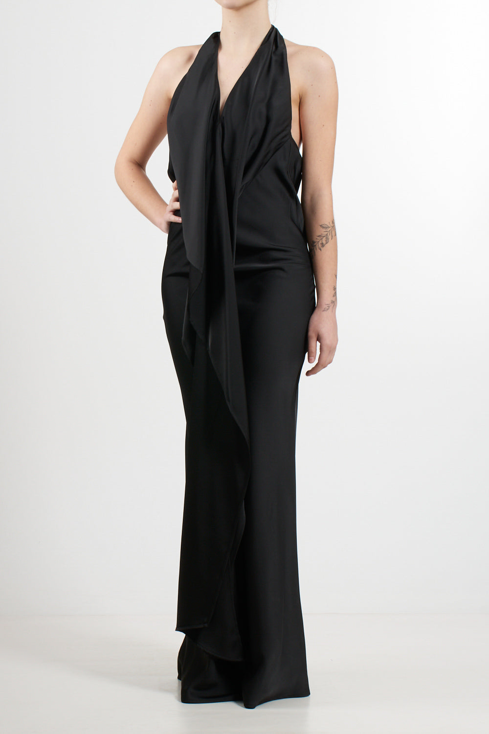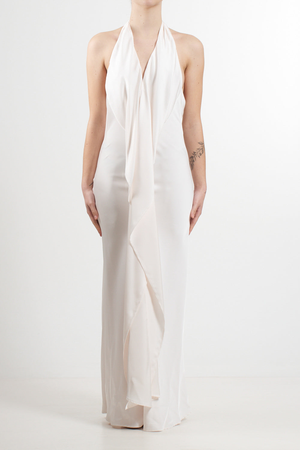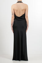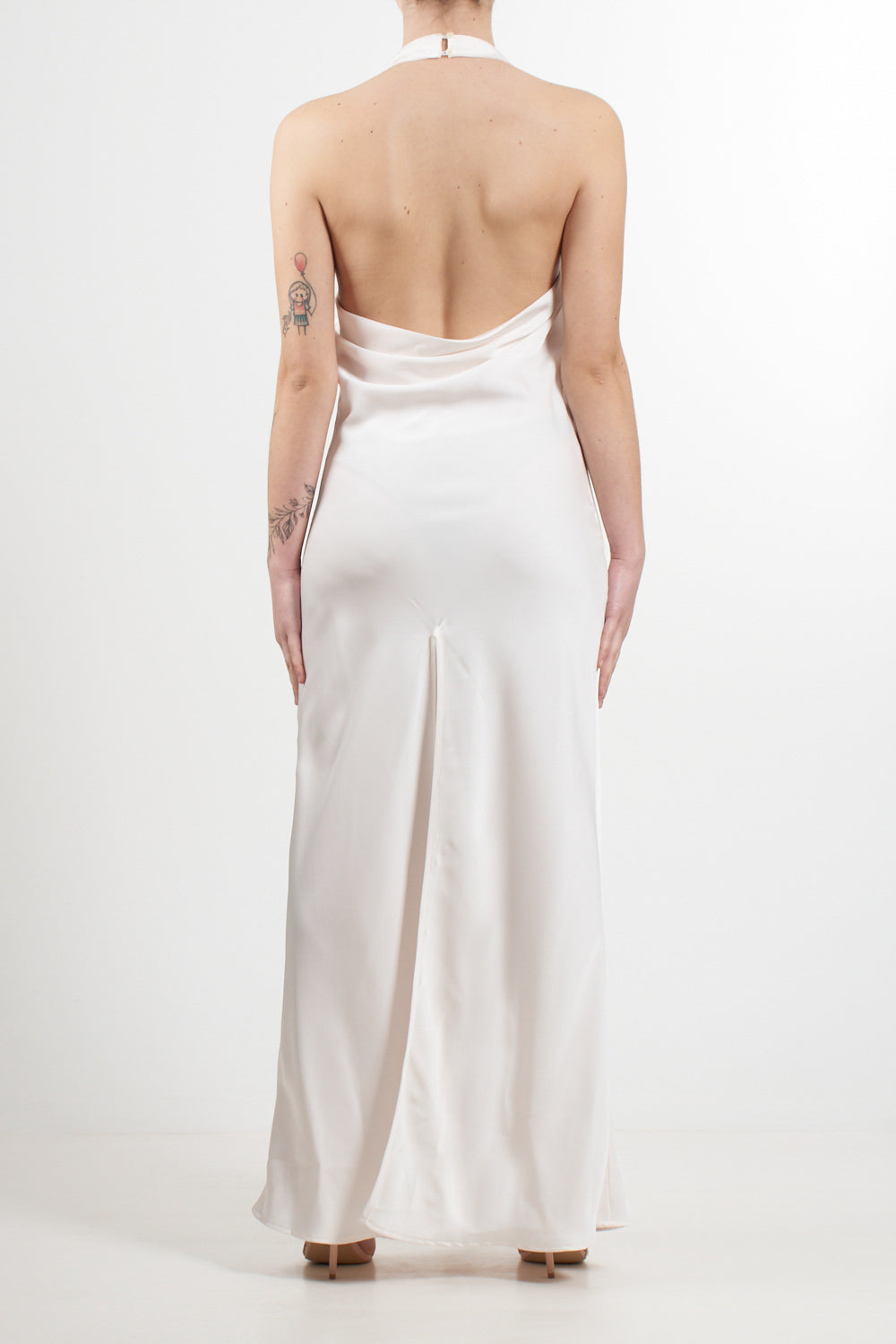 Long dress in flowing fabric, featuring a halterneck, open back and back slit. The elegant design and fitted silhouette make it ideal for special occasions and sophisticated looks.
