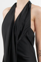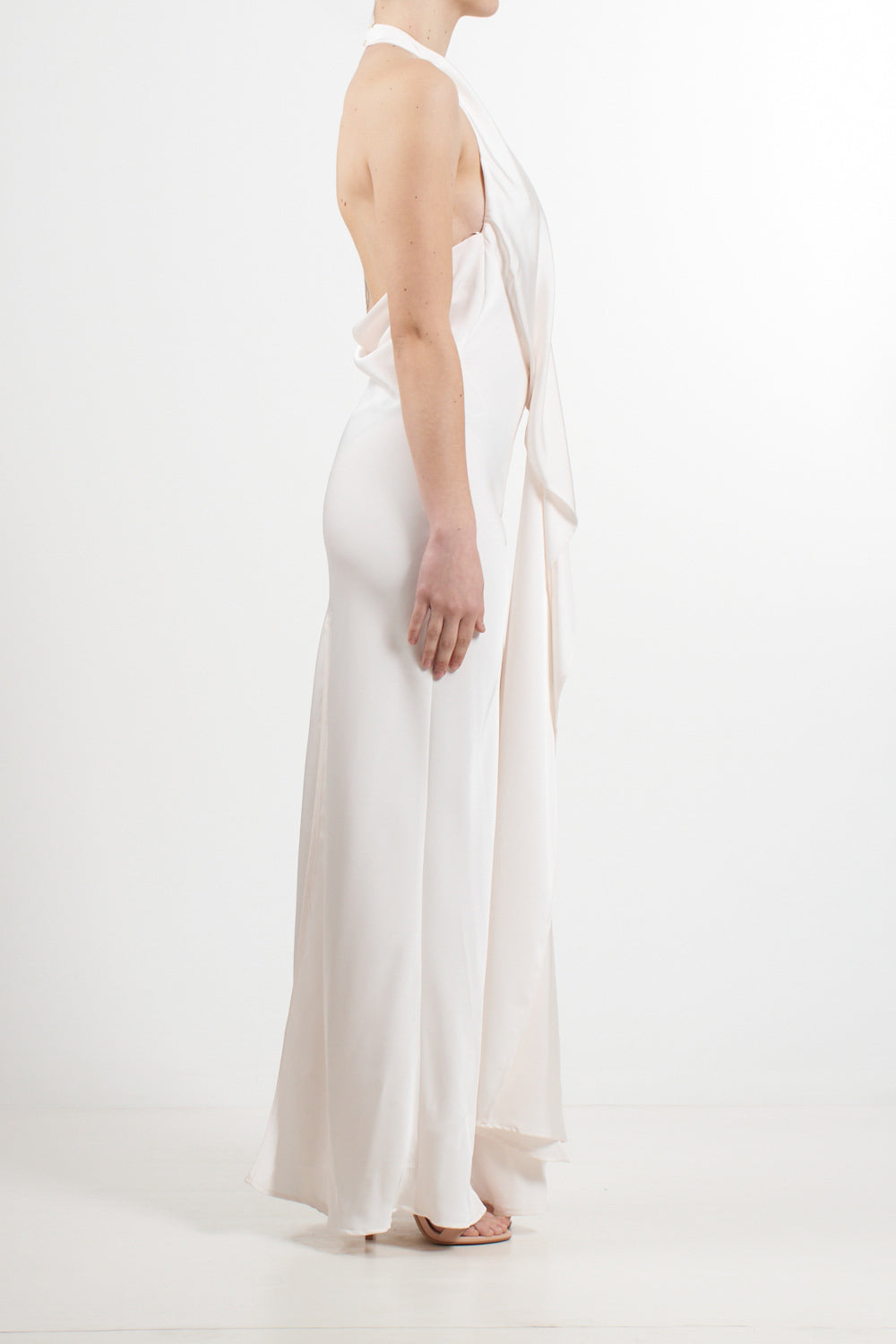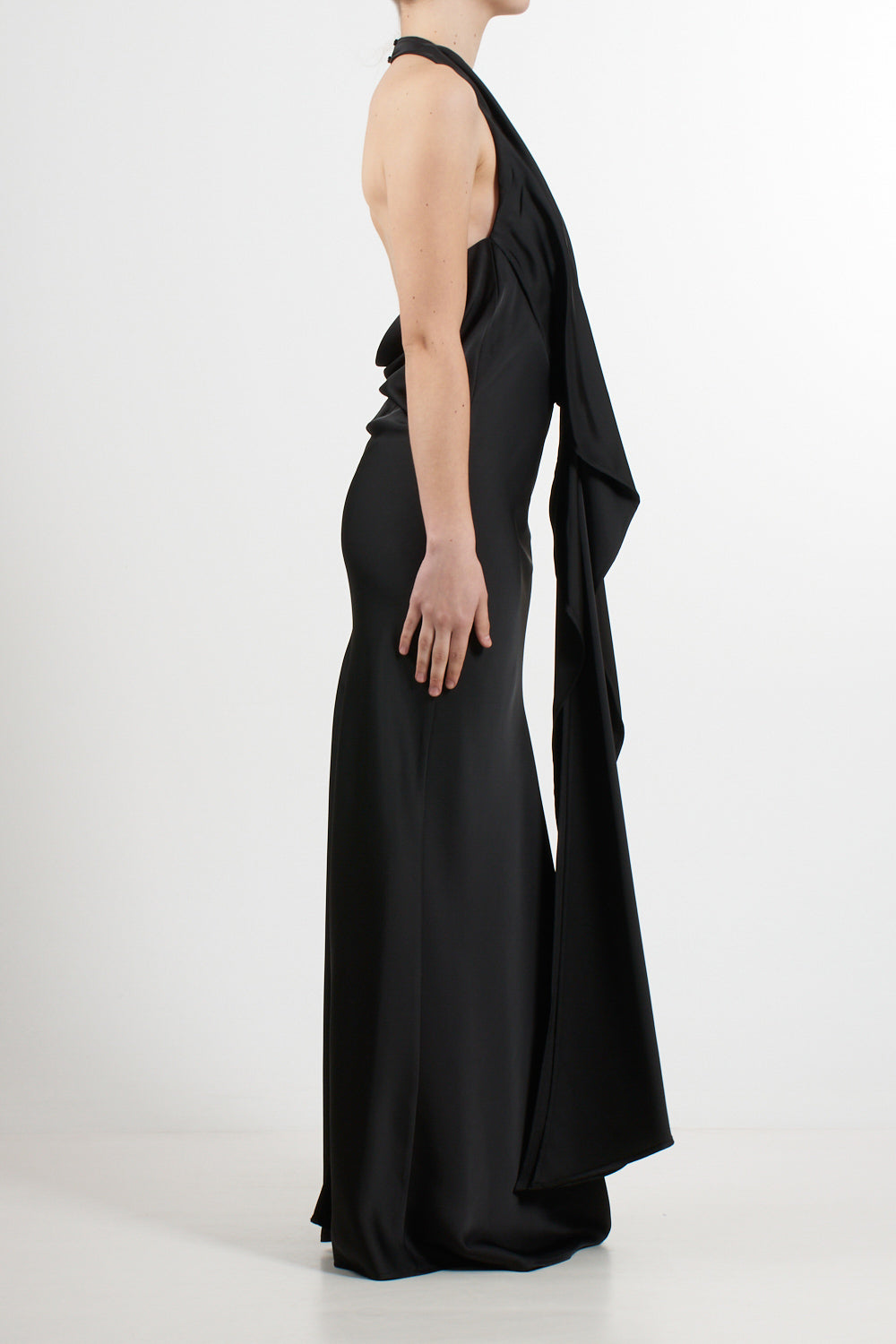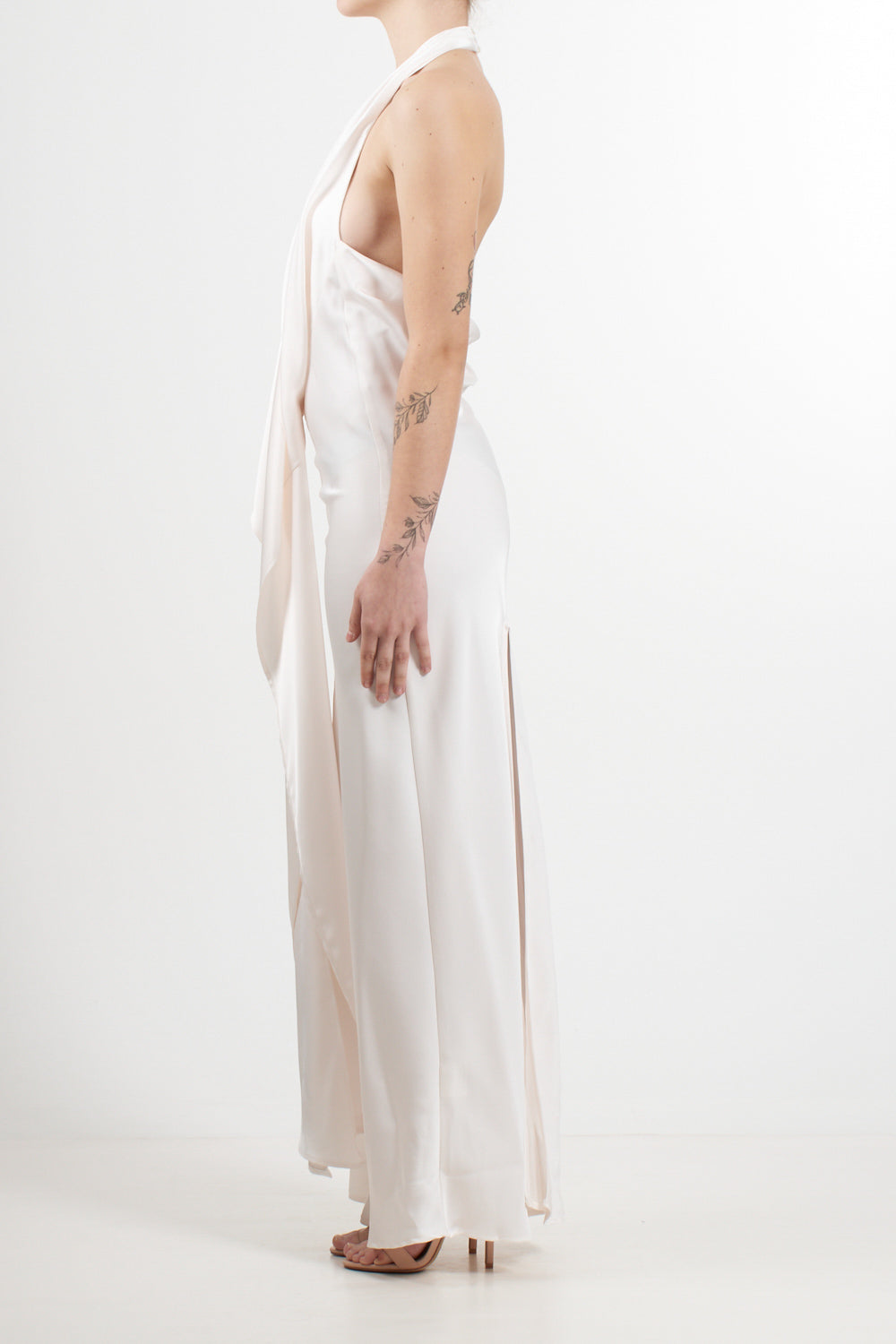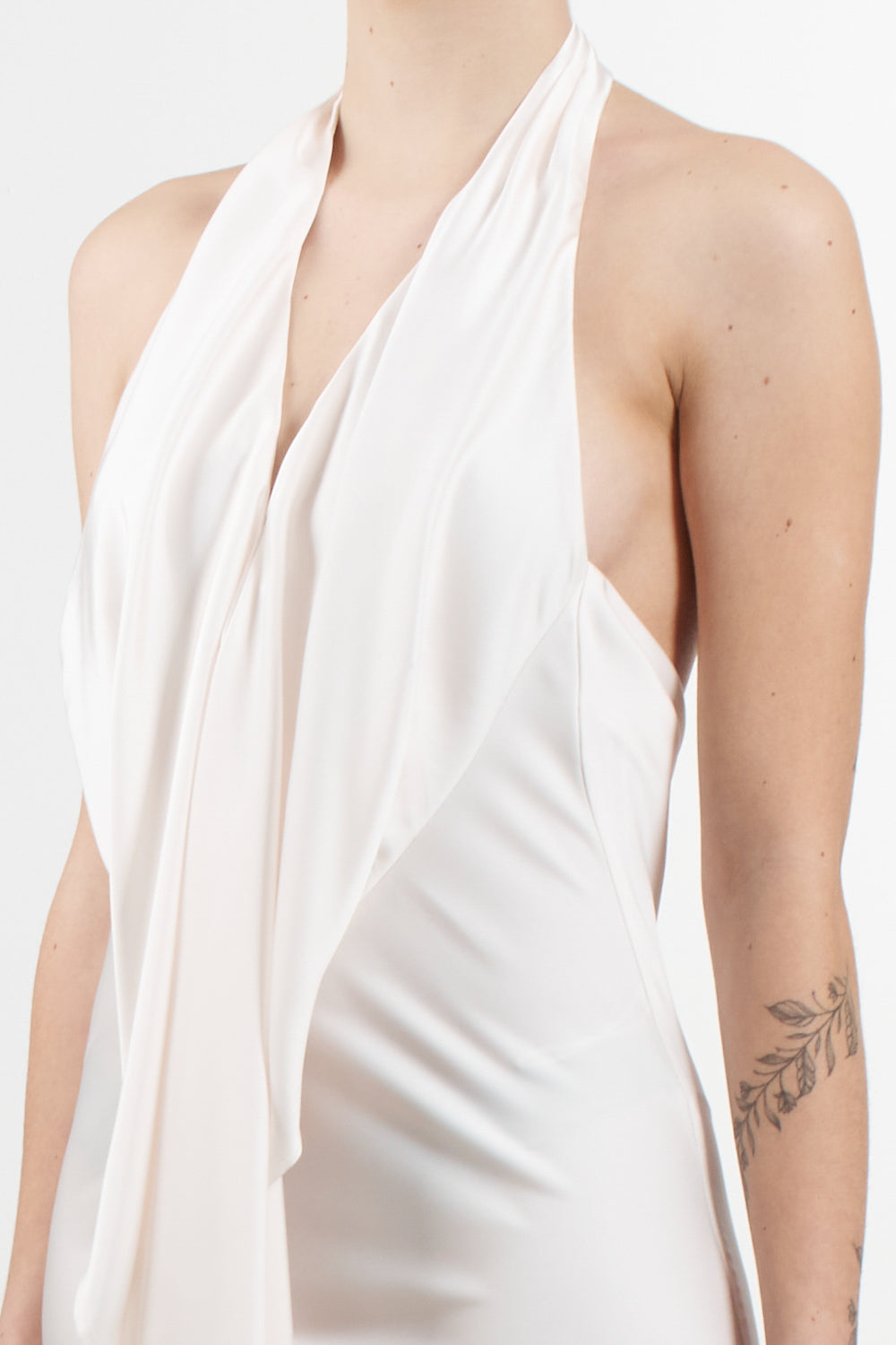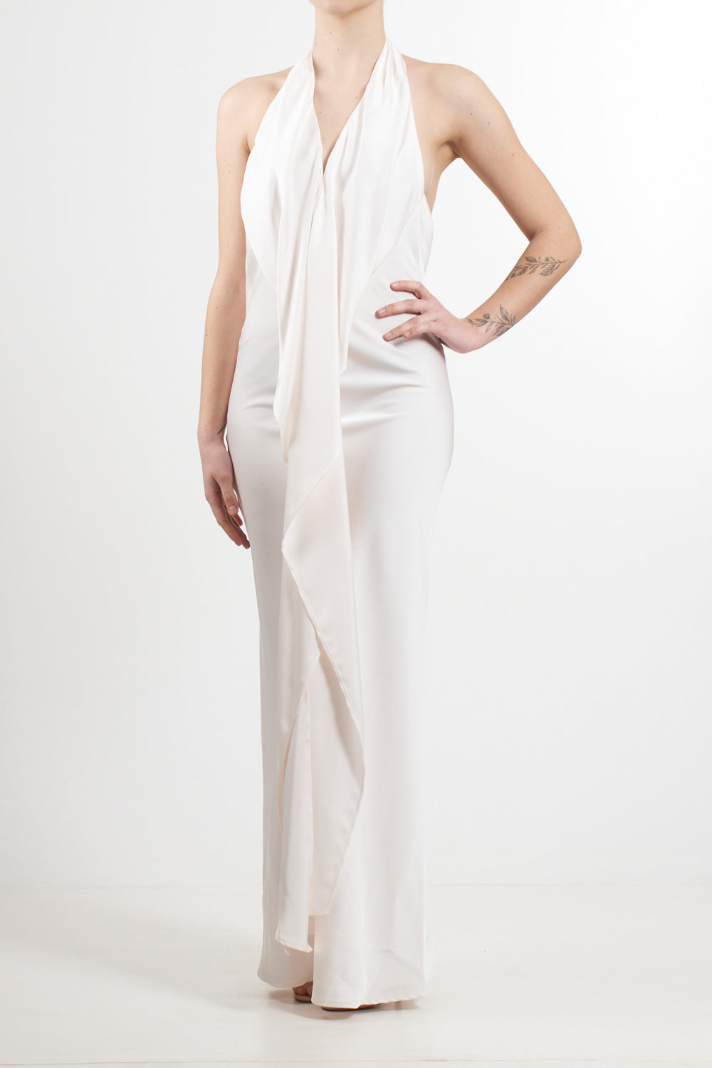 Long dress in flowing fabric, featuring a halterneck, open back and back slit. The elegant design and fitted silhouette make it ideal for special occasions and sophisticated looks.