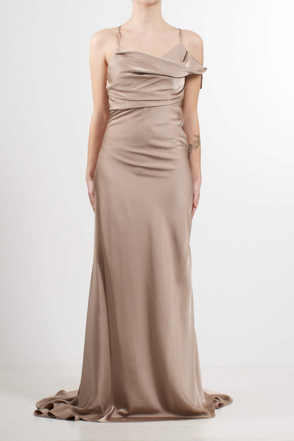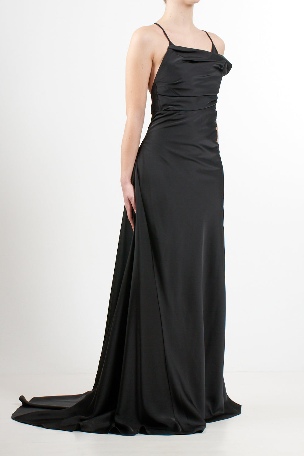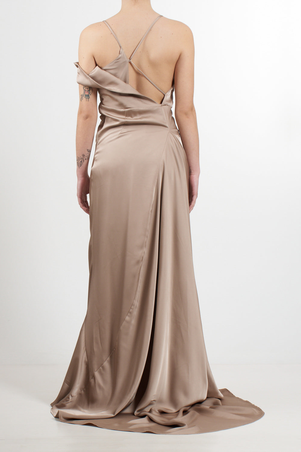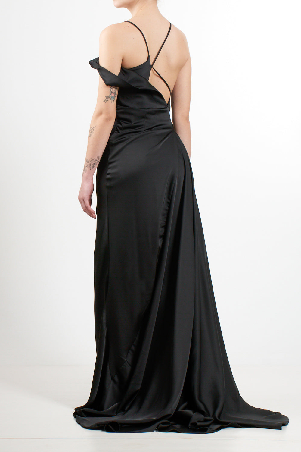 Long dress in light fabric, characterized by thin straps, draped bodice and slightly rolled sleeves in an asymmetrical way. The long skirt with train and the open back give the garment a refined and contemporary elegance.