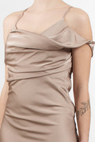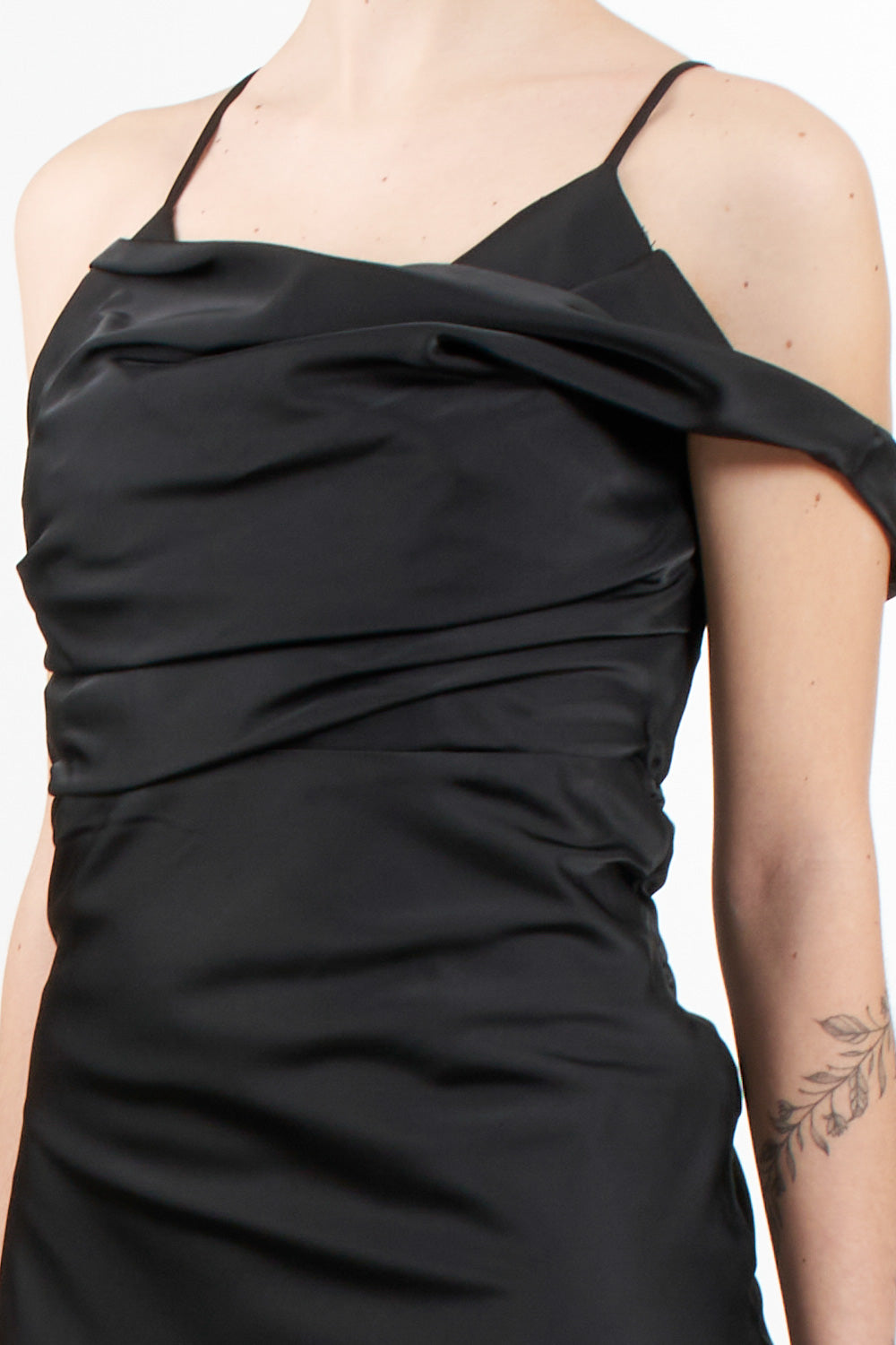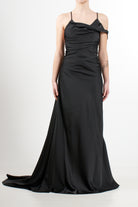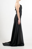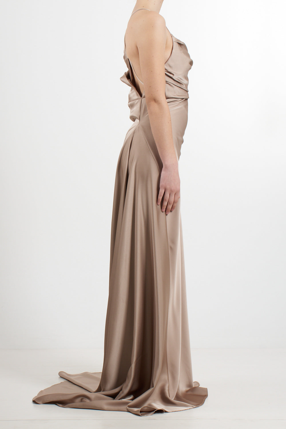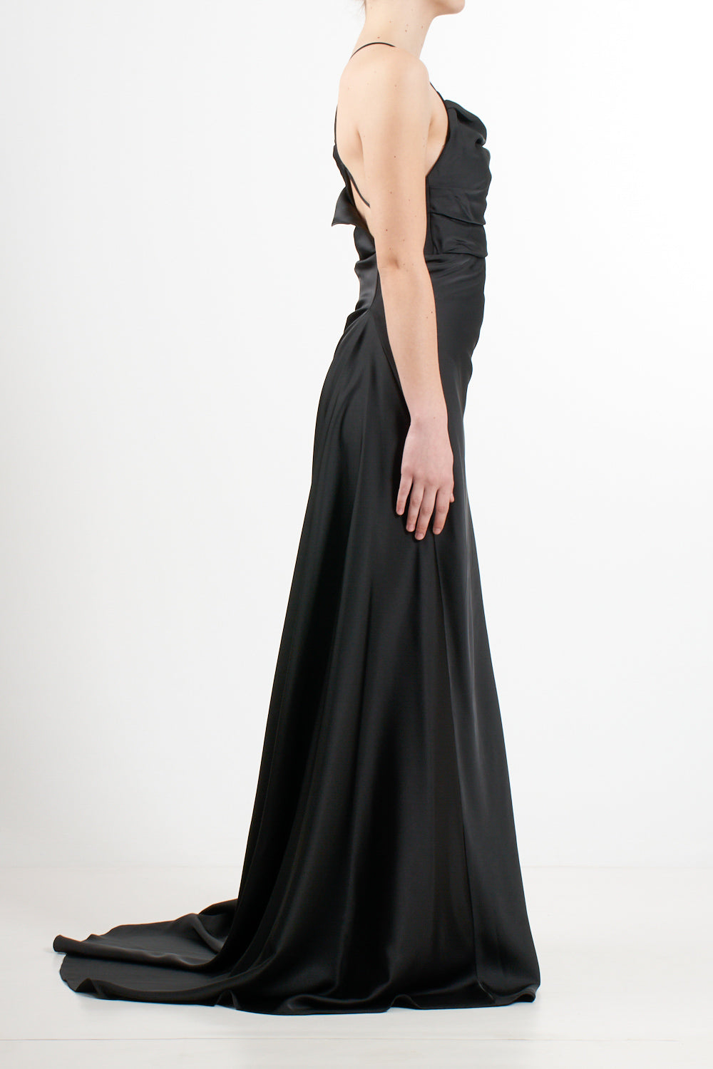 Long dress in light fabric, characterized by thin straps, draped bodice and slightly rolled sleeves in an asymmetrical way. The long skirt with train and the open back give the garment a refined and contemporary elegance.