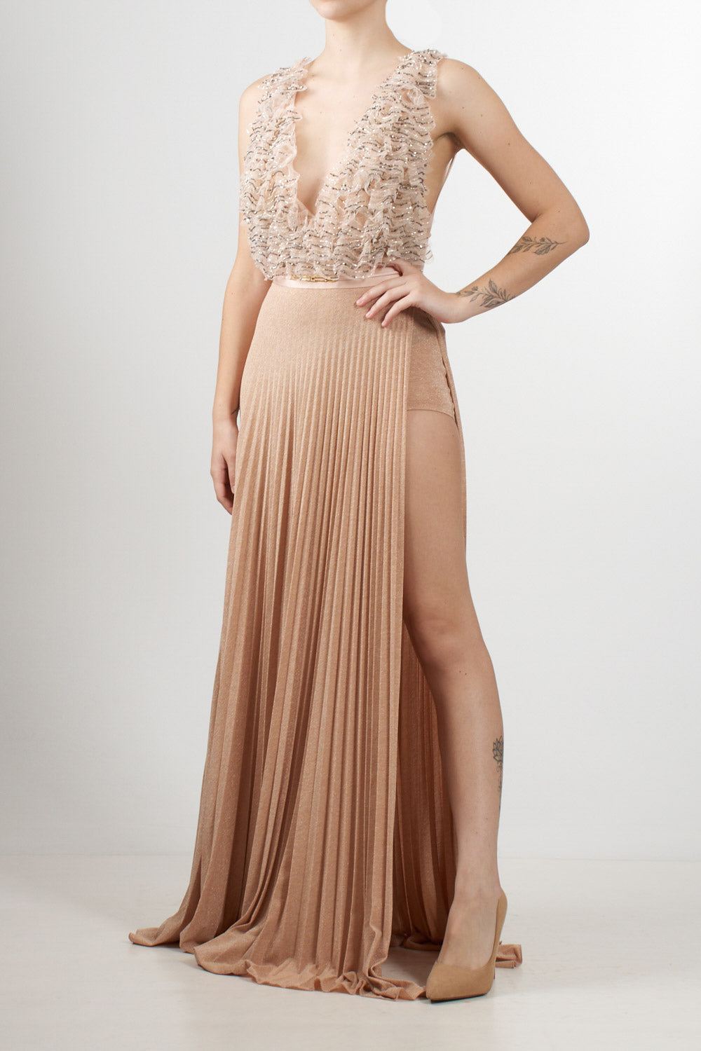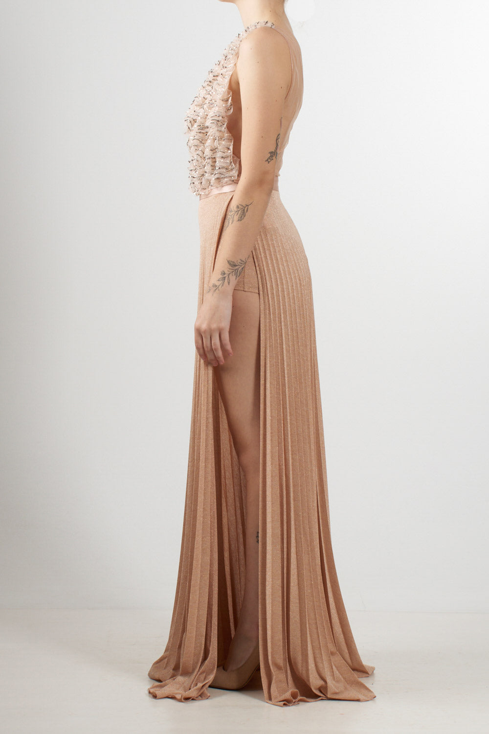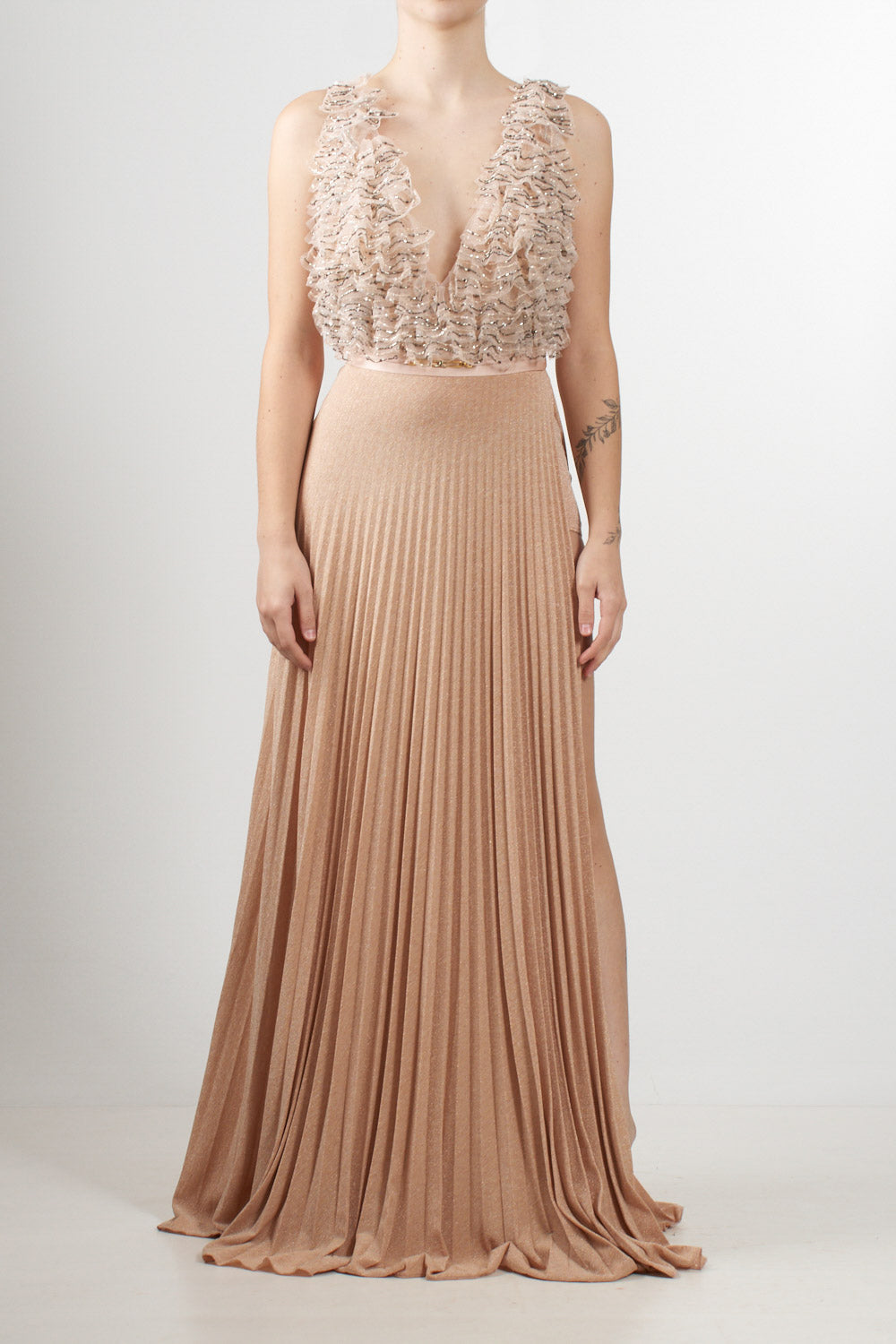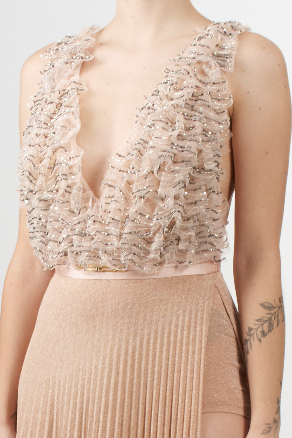 Elegant, slim-fit dress with a tulle bodice embellished with small ruffles and hand-embroidered crystals. The pleated jersey skirt is accented by a deep side slit that adds movement and sensuality. A gold jewel detail with logo and rhinestones illuminates the waist, adding a touch of refined elegance.