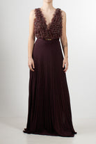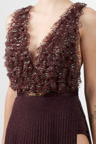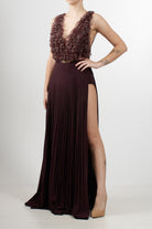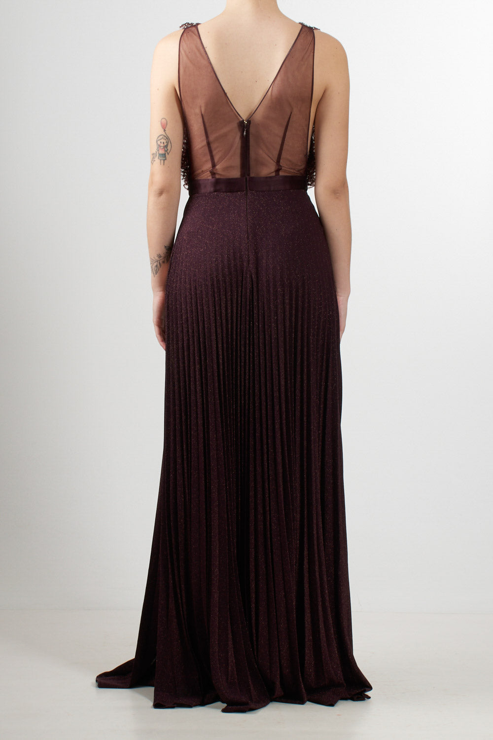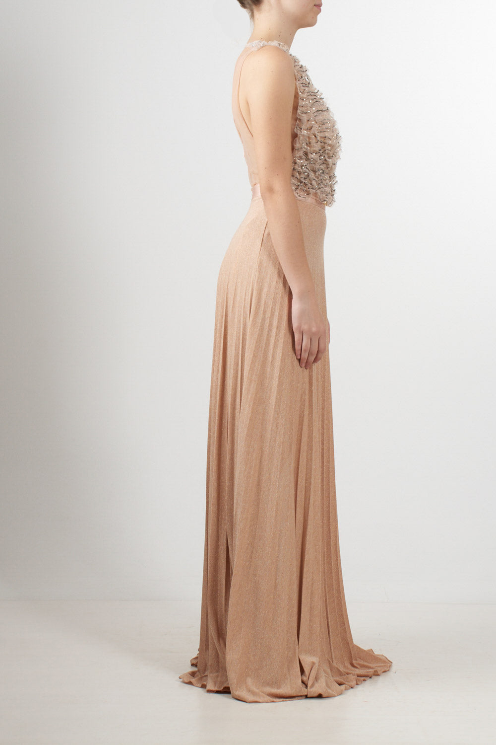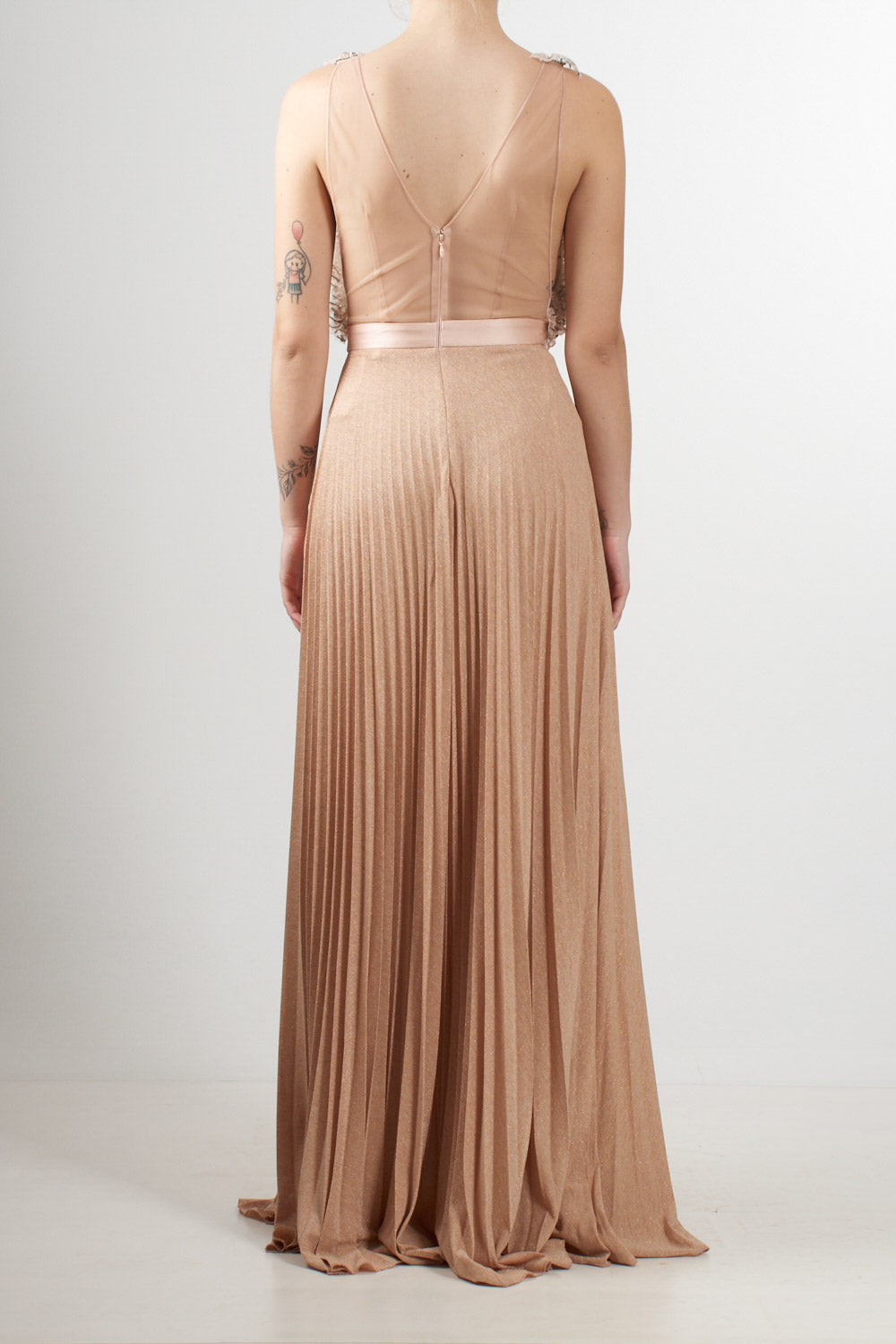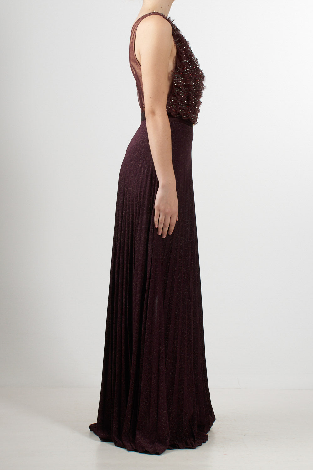 Elegant, slim-fit dress with a tulle bodice embellished with small ruffles and hand-embroidered crystals. The pleated jersey skirt is accented by a deep side slit that adds movement and sensuality. A gold jewel detail with logo and rhinestones illuminates the waist, adding a touch of refined elegance.