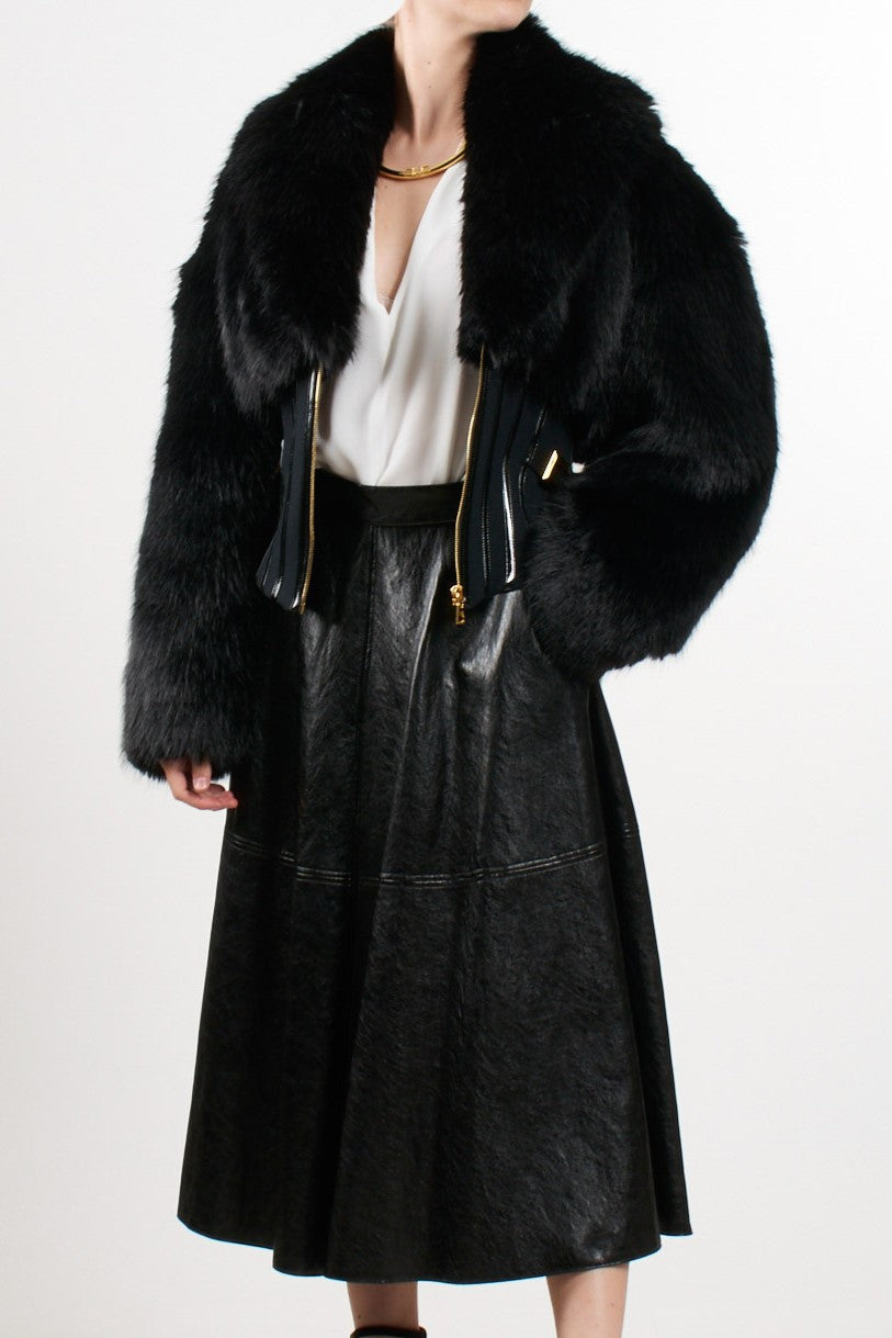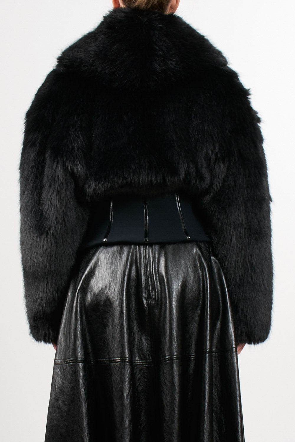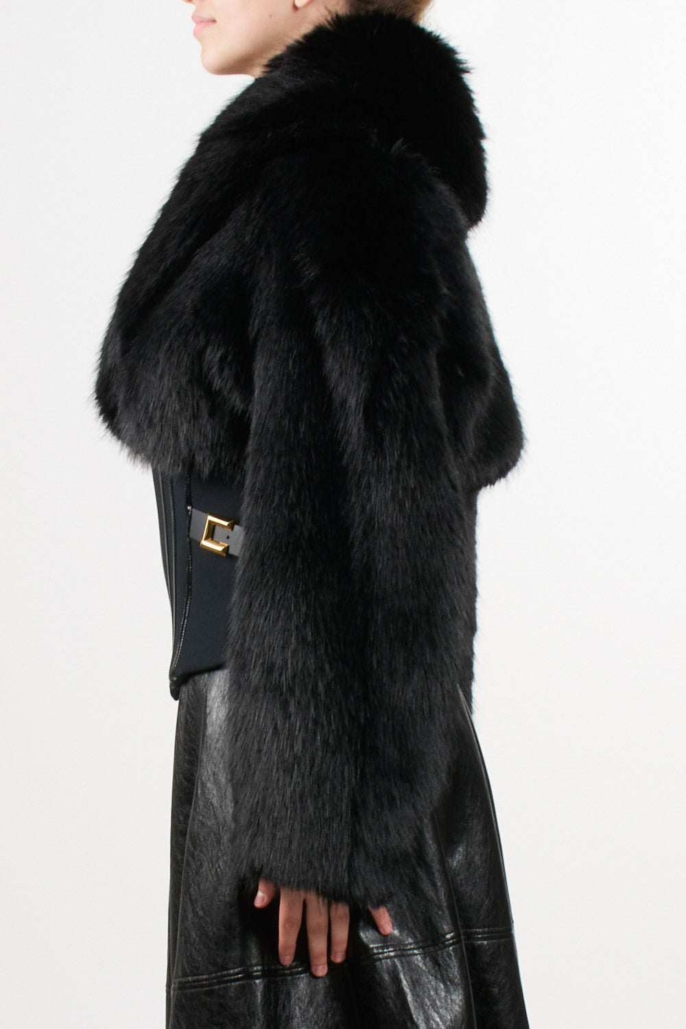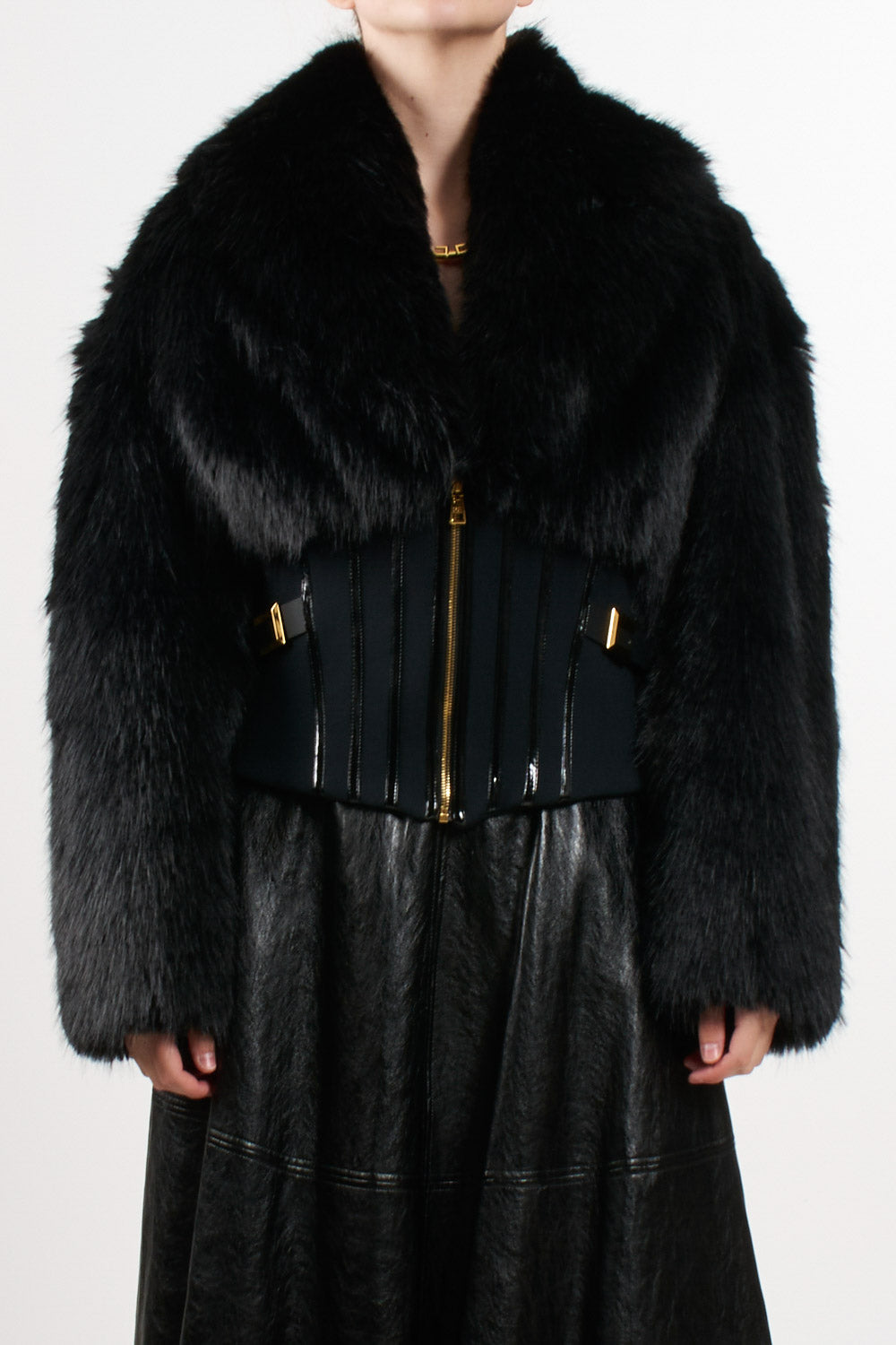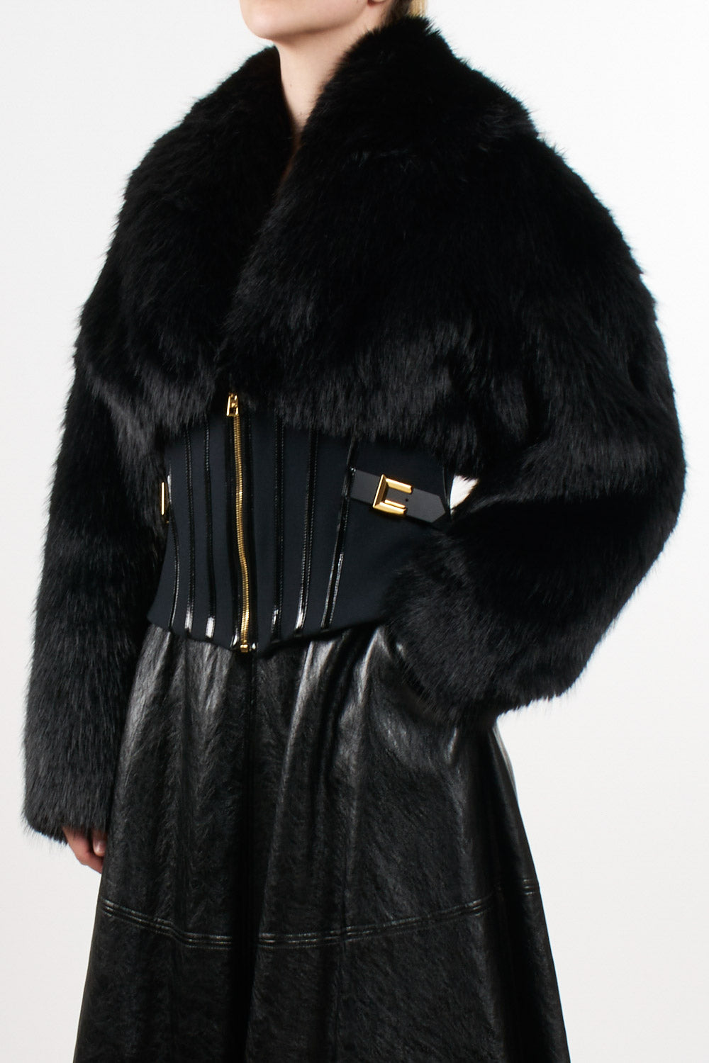 Fur-effect textured jacket featuring an oversized fit and a refined construction that combines softness and character. The wrap-around collar and sleeves define the waistline with a double crepe bustier construction, featuring vinyl inserts and decorative toggles at the sides.