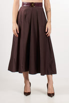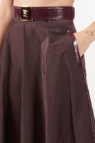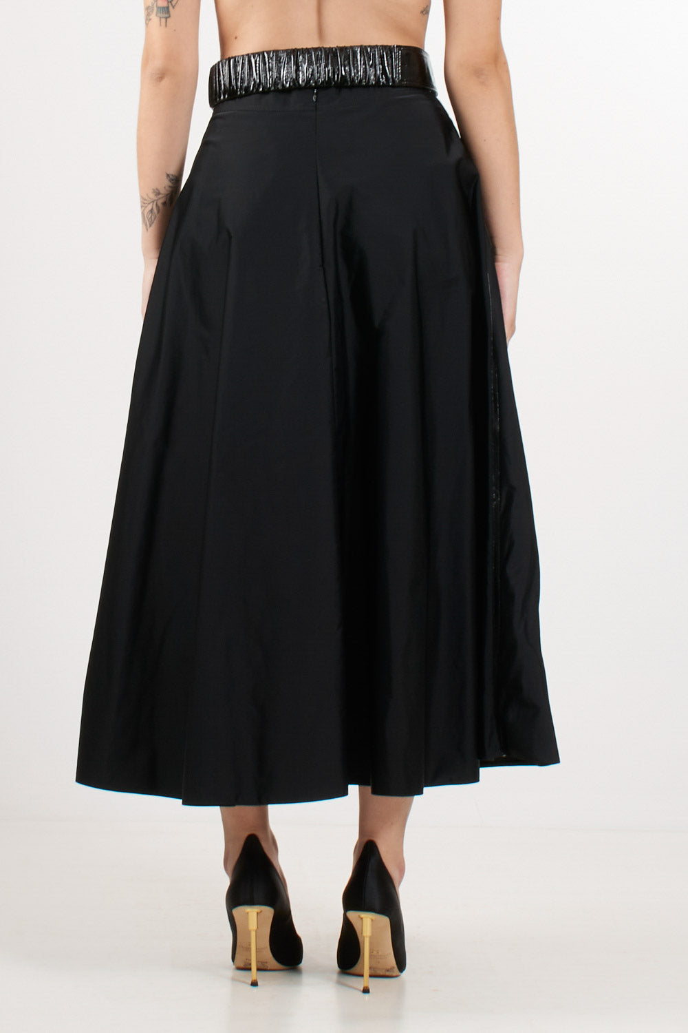Midi skirt in sail fabric with a loose, lightweight construction. The flared cut flatters the figure, the waist is accentuated by a shiny vinyl belt with a gold metal logo buckle, and side pockets.