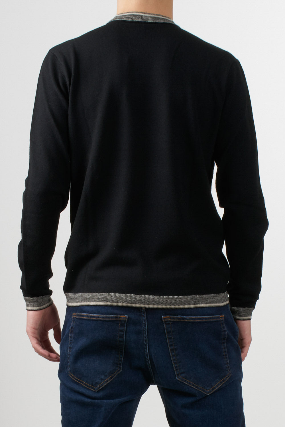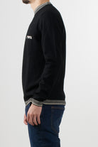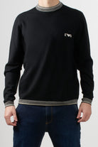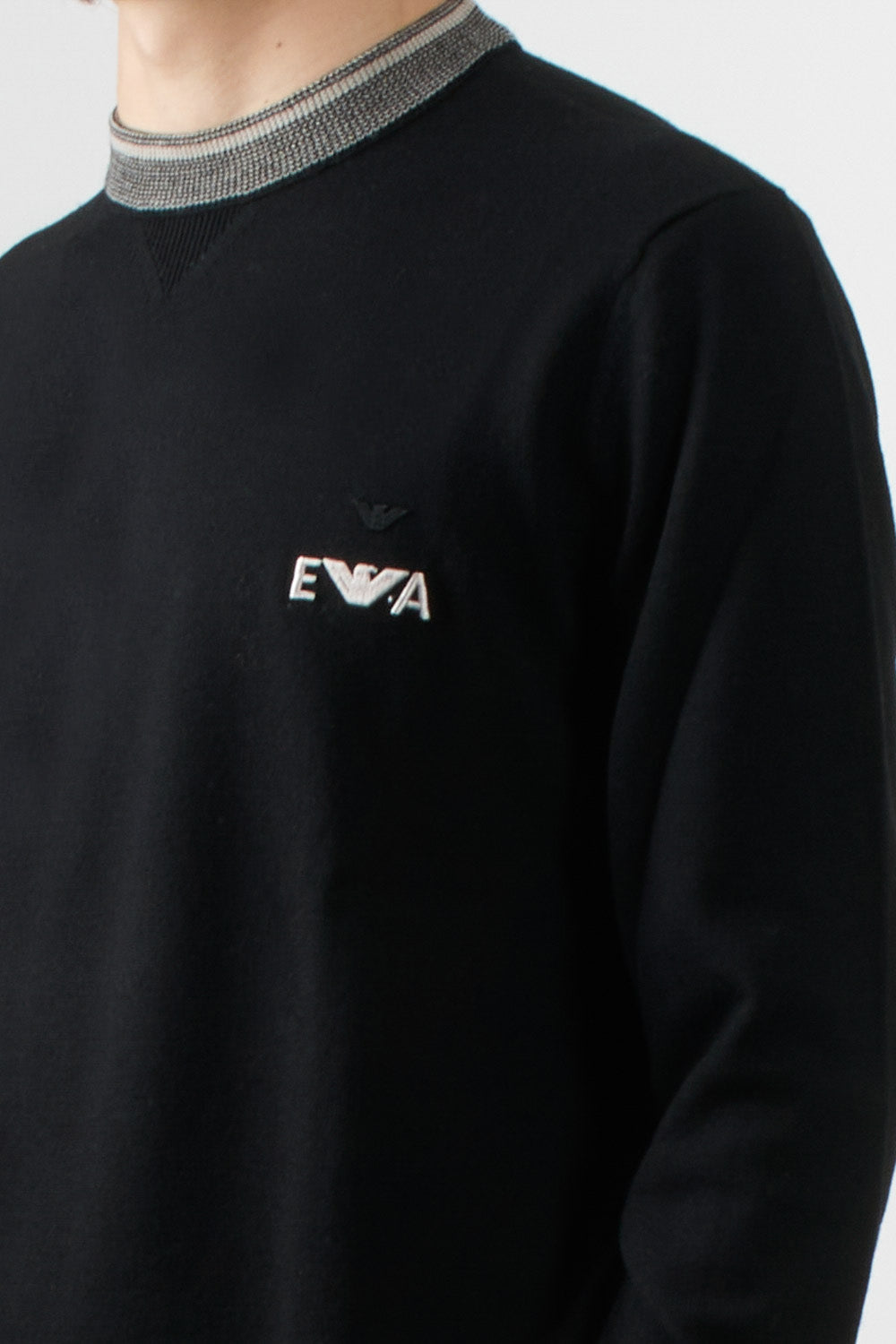 Emporio Armani crewneck sweater featuring a clean cut and contrasting details on the collar, cuffs, and hem. The embroidered Emporio Armani logo on the chest adds a distinctive touch to the clean design.