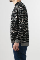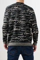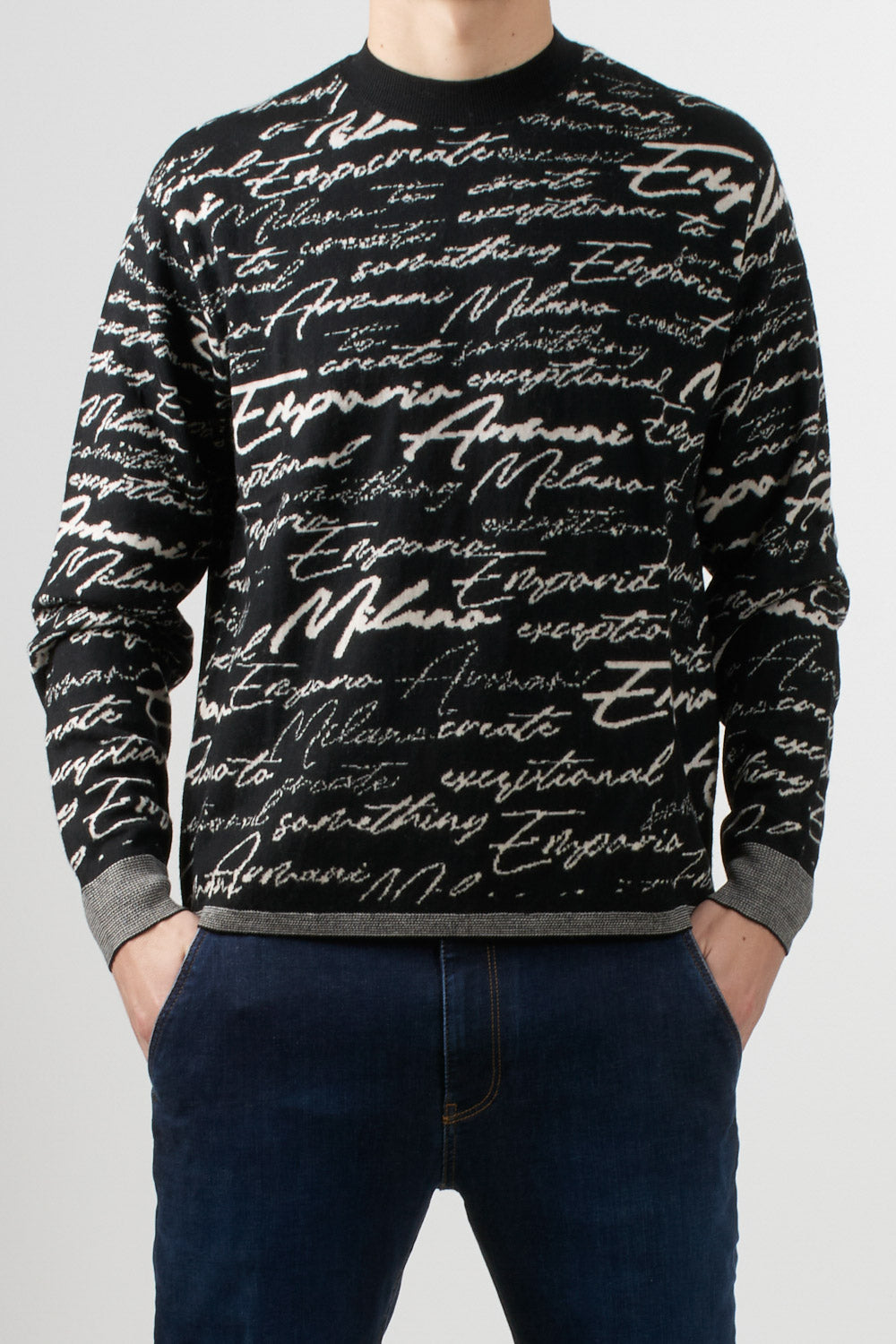 Crewneck sweater in pure virgin wool with an all-over jacquard weave. The handwritten "Emporio Armani" logo motif adorns the entire piece, lending a distinctive, contemporary touch.