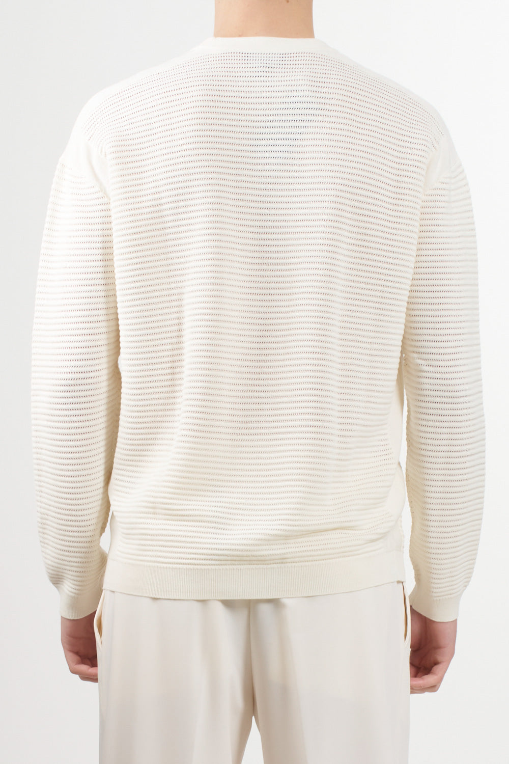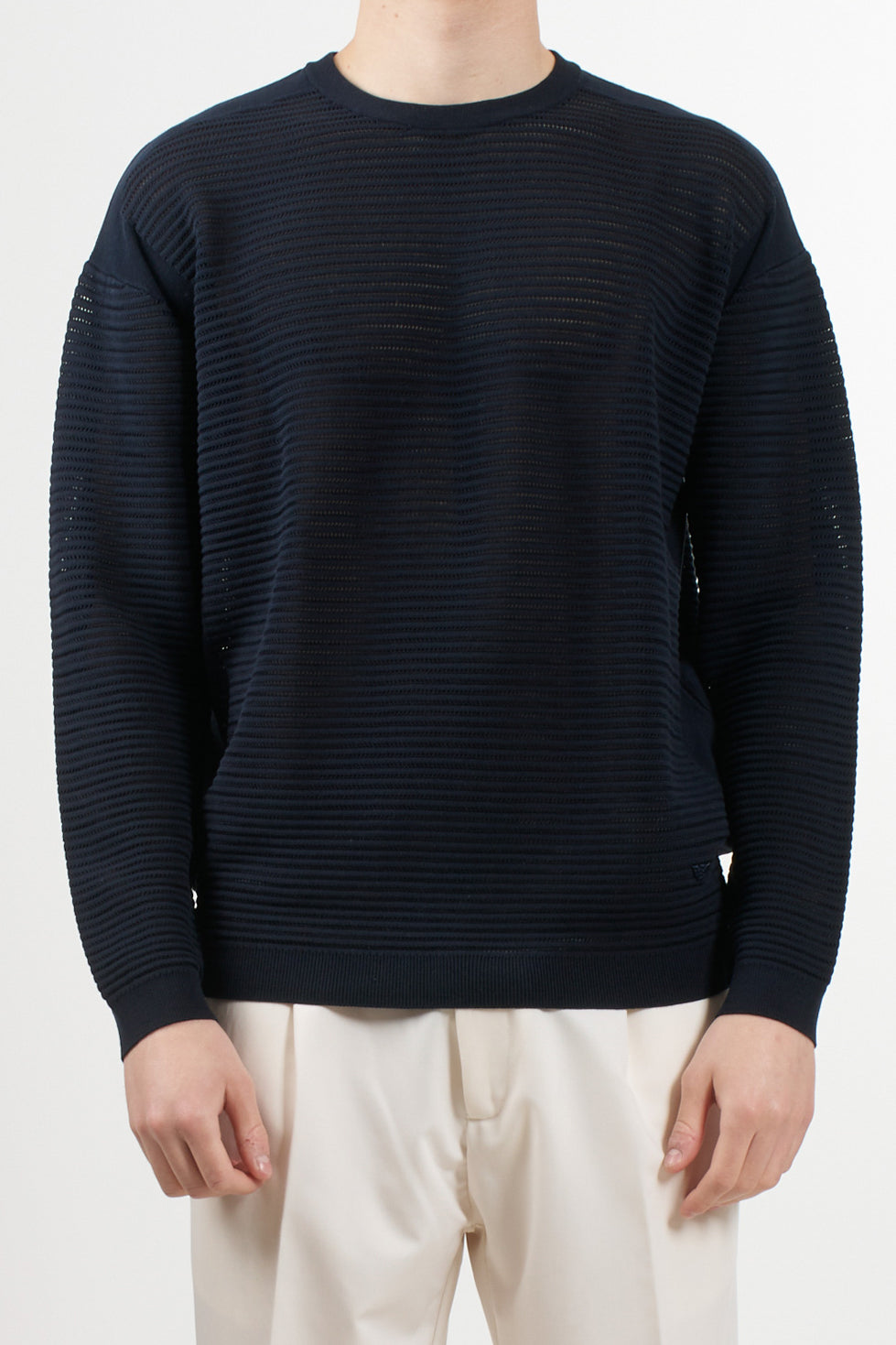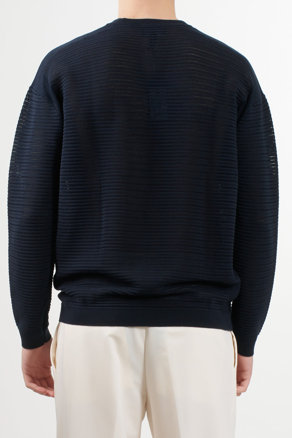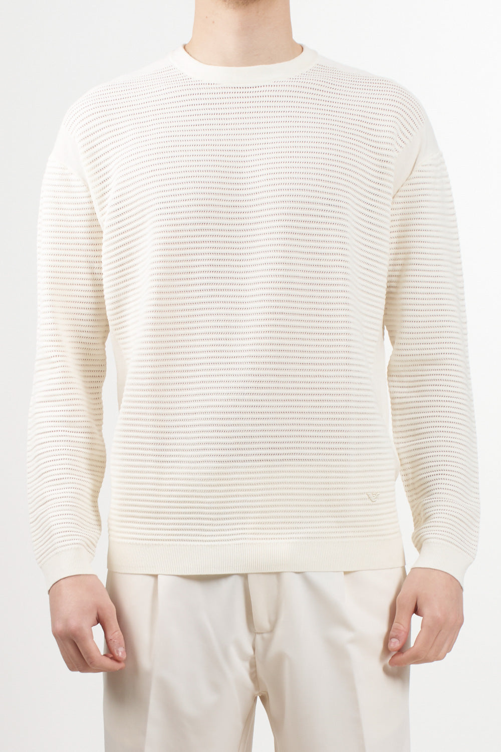 Long-sleeved sweater with an essential and sophisticated style, signed by Emporio Armani. Made of pure cotton, it features a particular perforated striped workmanship that gives the garment lightness and a refined texture. A must-have for the spring/summer season.
