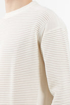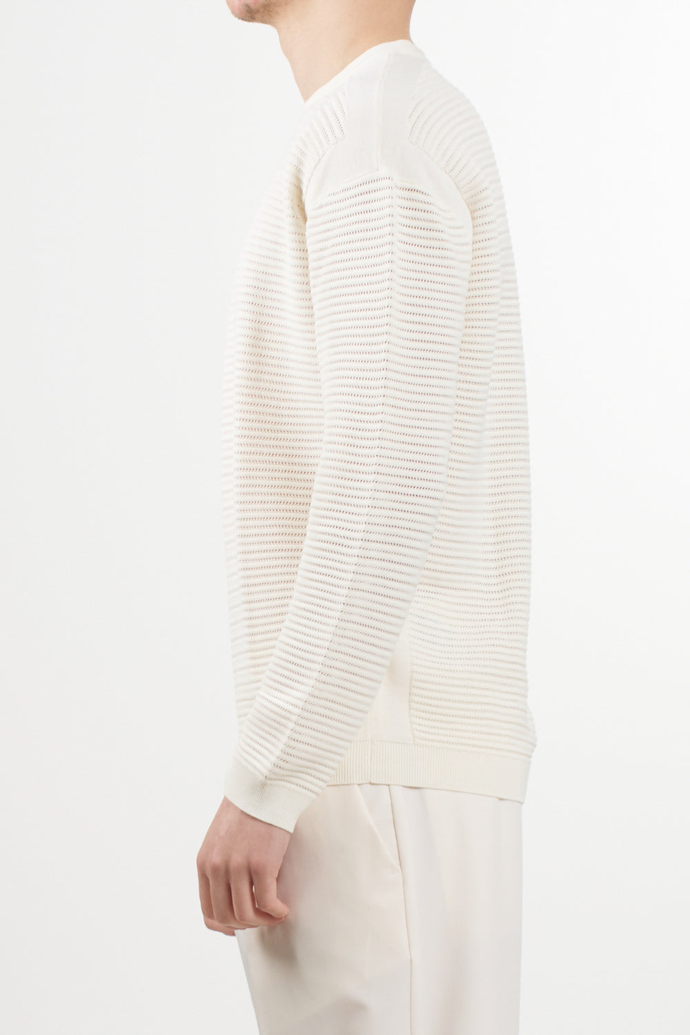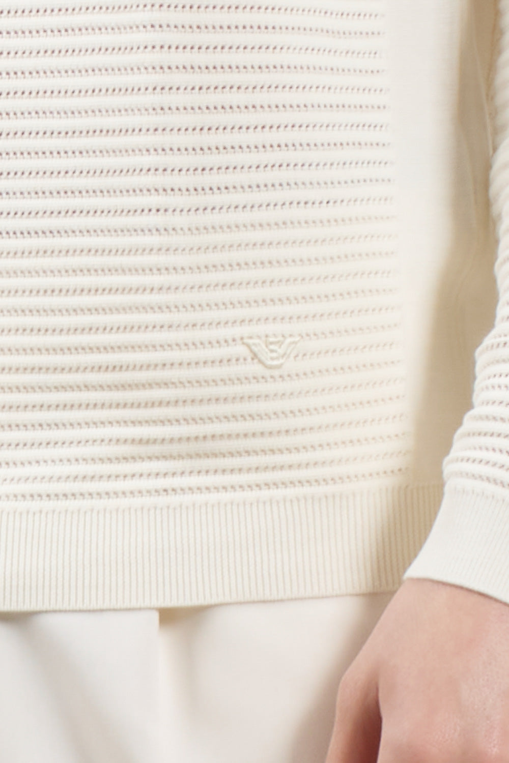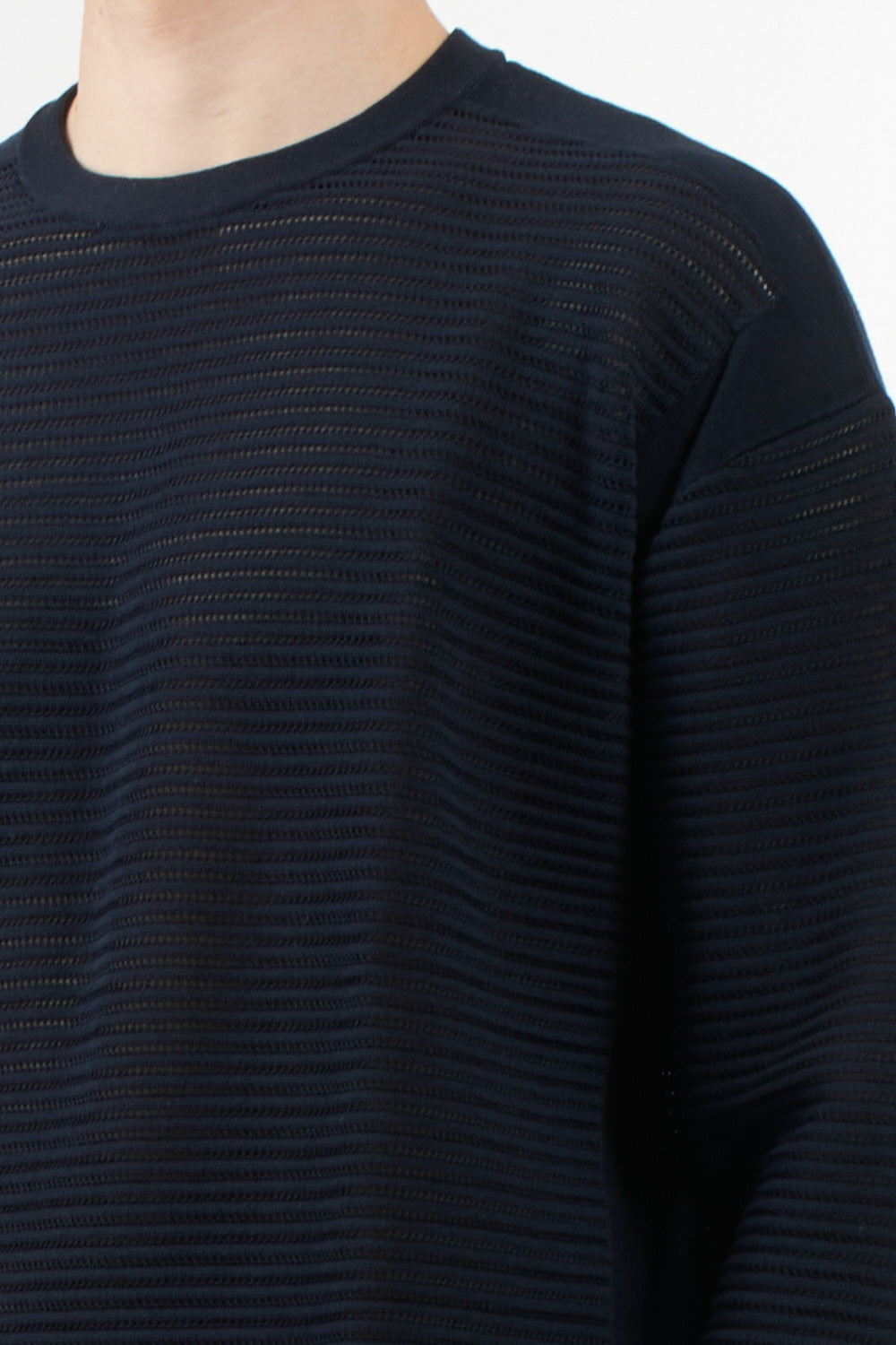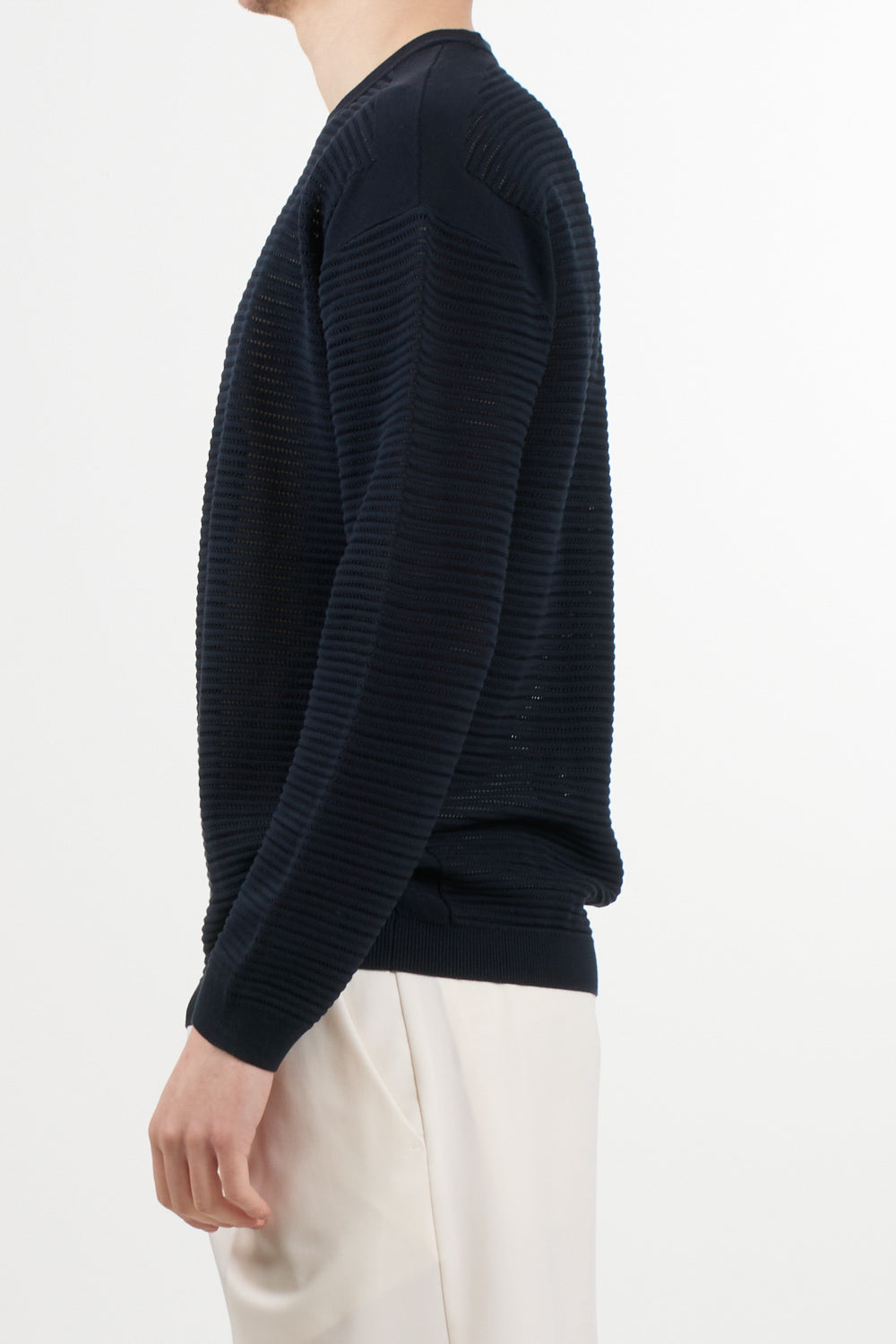 Long-sleeved sweater with an essential and sophisticated style, signed by Emporio Armani. Made of pure cotton, it features a particular perforated striped workmanship that gives the garment lightness and a refined texture. A must-have for the spring/summer season.