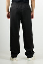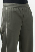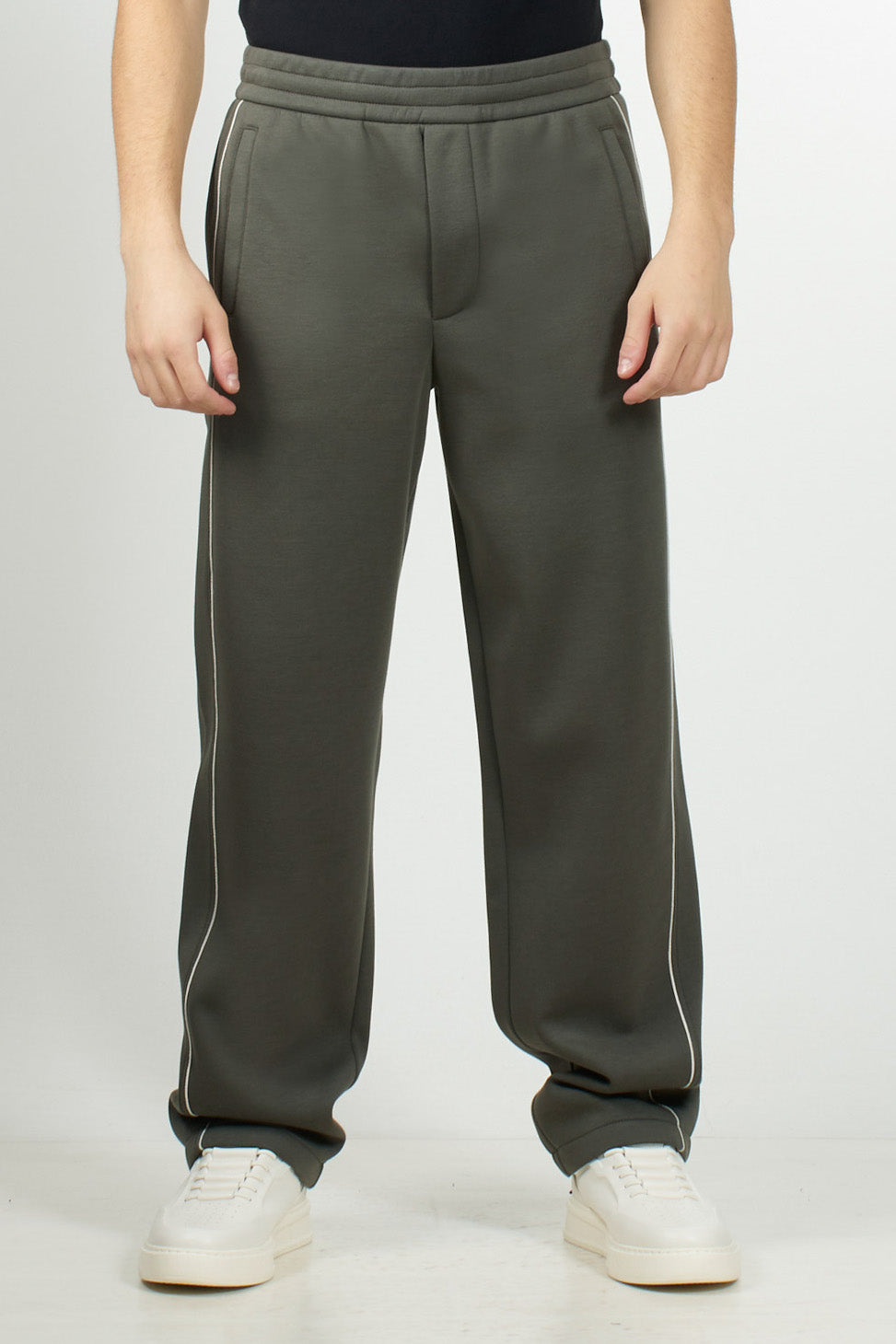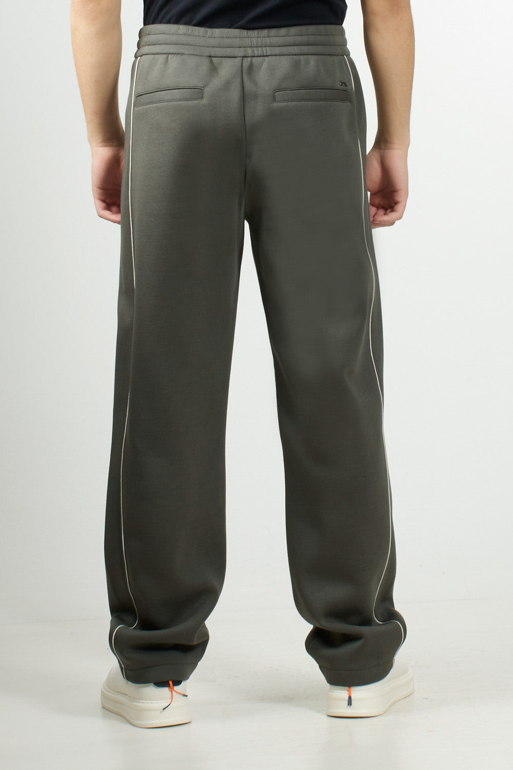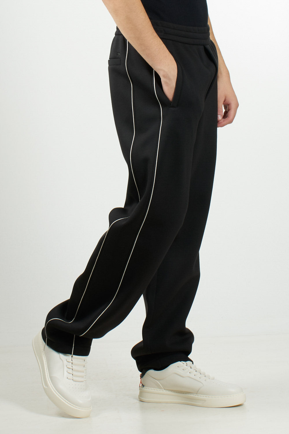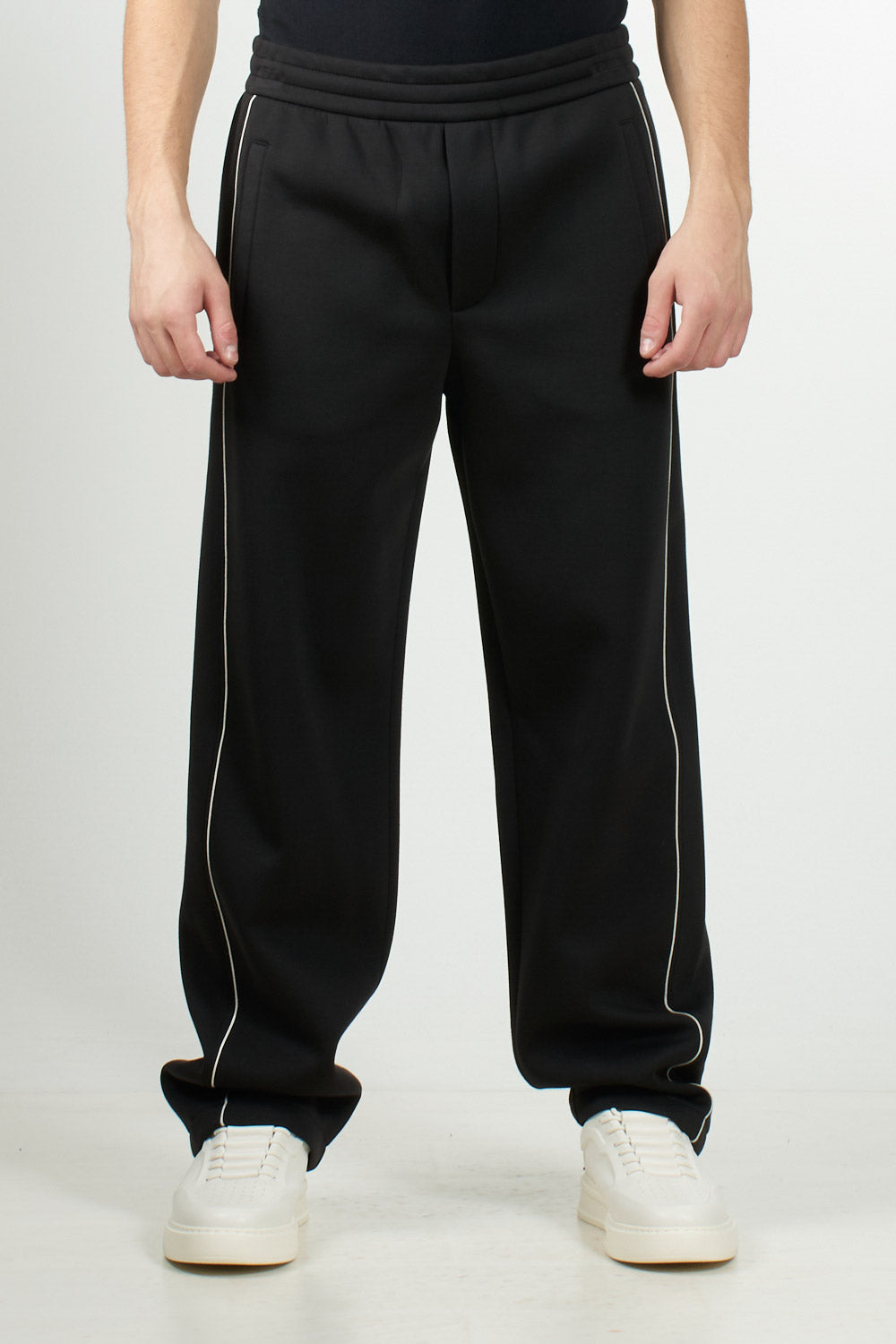 Emporio Armani double jersey trousers. The elastic waistband with internal drawstring and a concealed faux zip ensure comfort and practicality. The design is completed by side and back welt pockets, decorative piping, and the EA logo plaque that marks the piece.