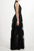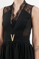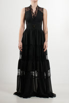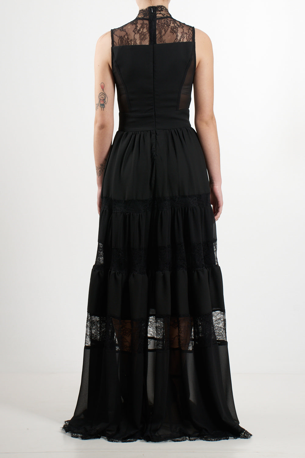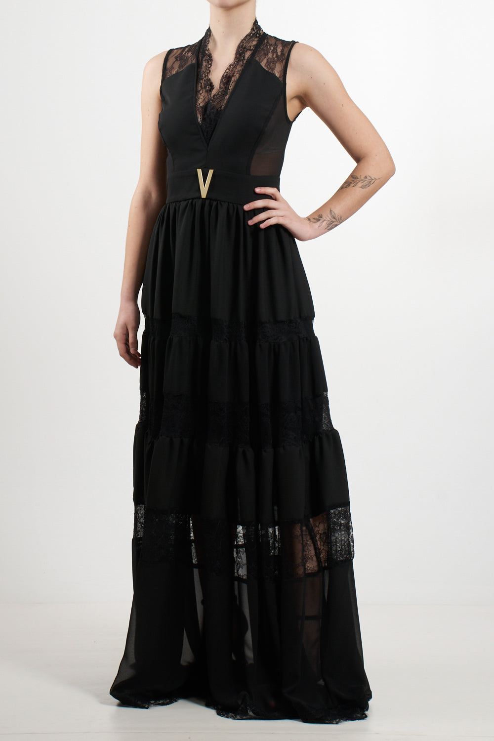 Elegant long dress with sleeveless bodice and V-neckline finished in lace that extends to the shoulders. The waist is highlighted by a belt with a gold metal 'V' buckle, while the wide and fluid skirt is composed of alternating layers of fabric and transparent lace inserts. Ideal for elegant occasions, such as gala dinners, evening events or formal ceremonies.
