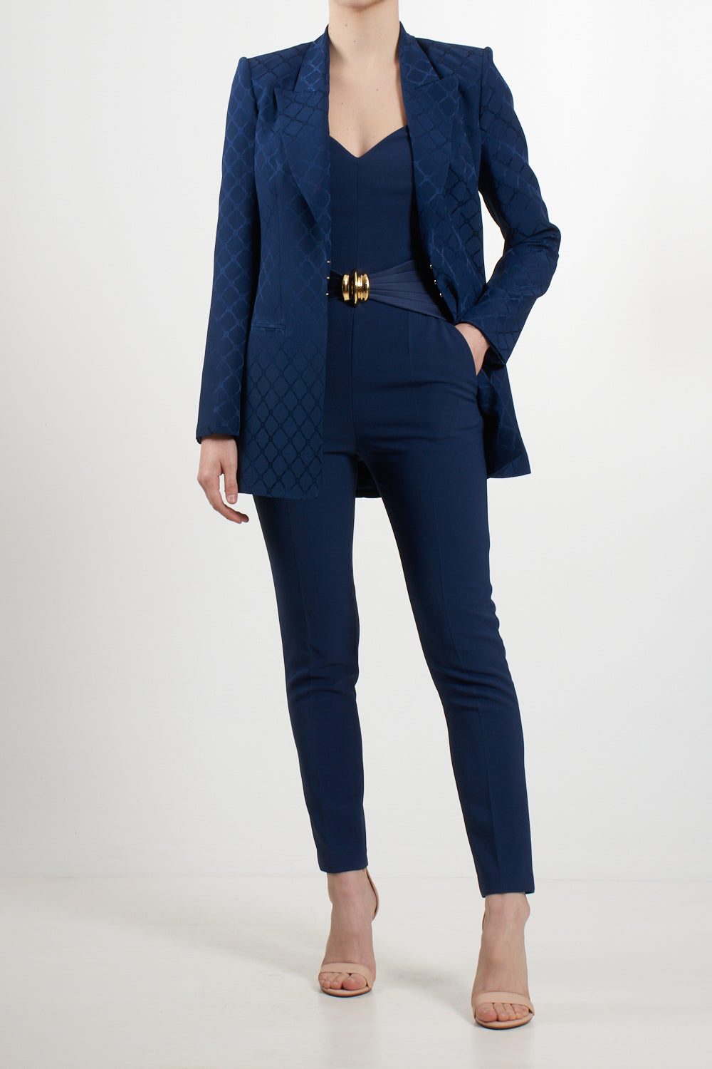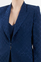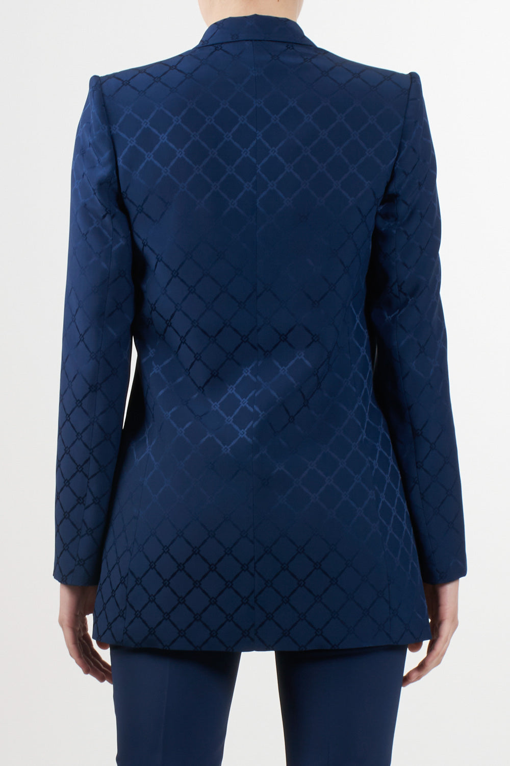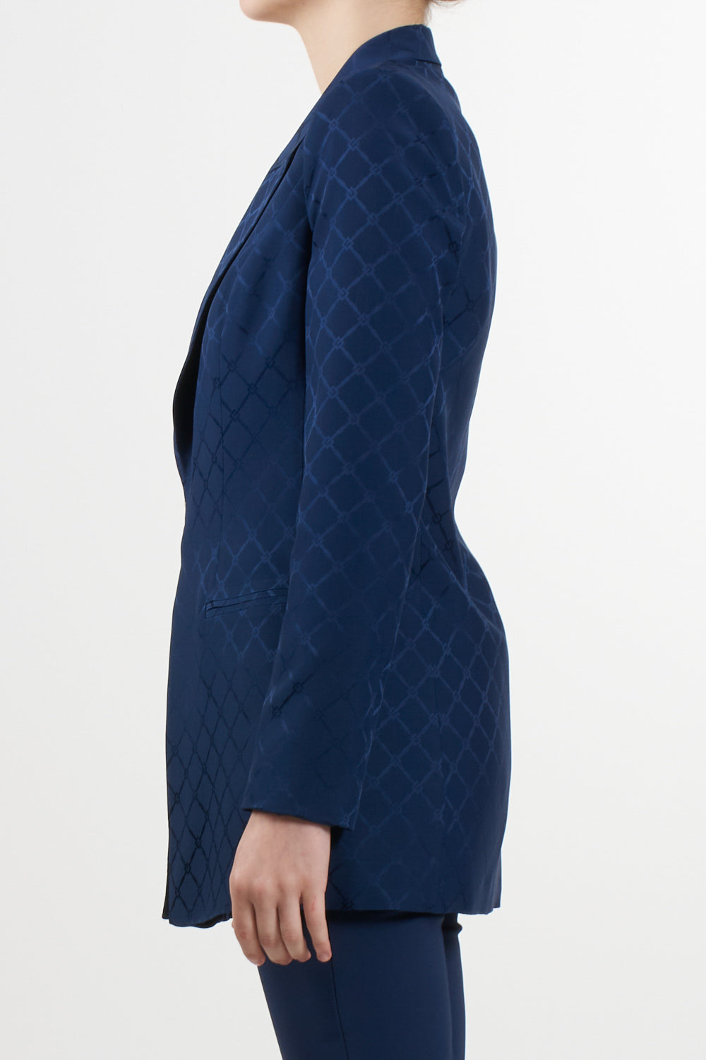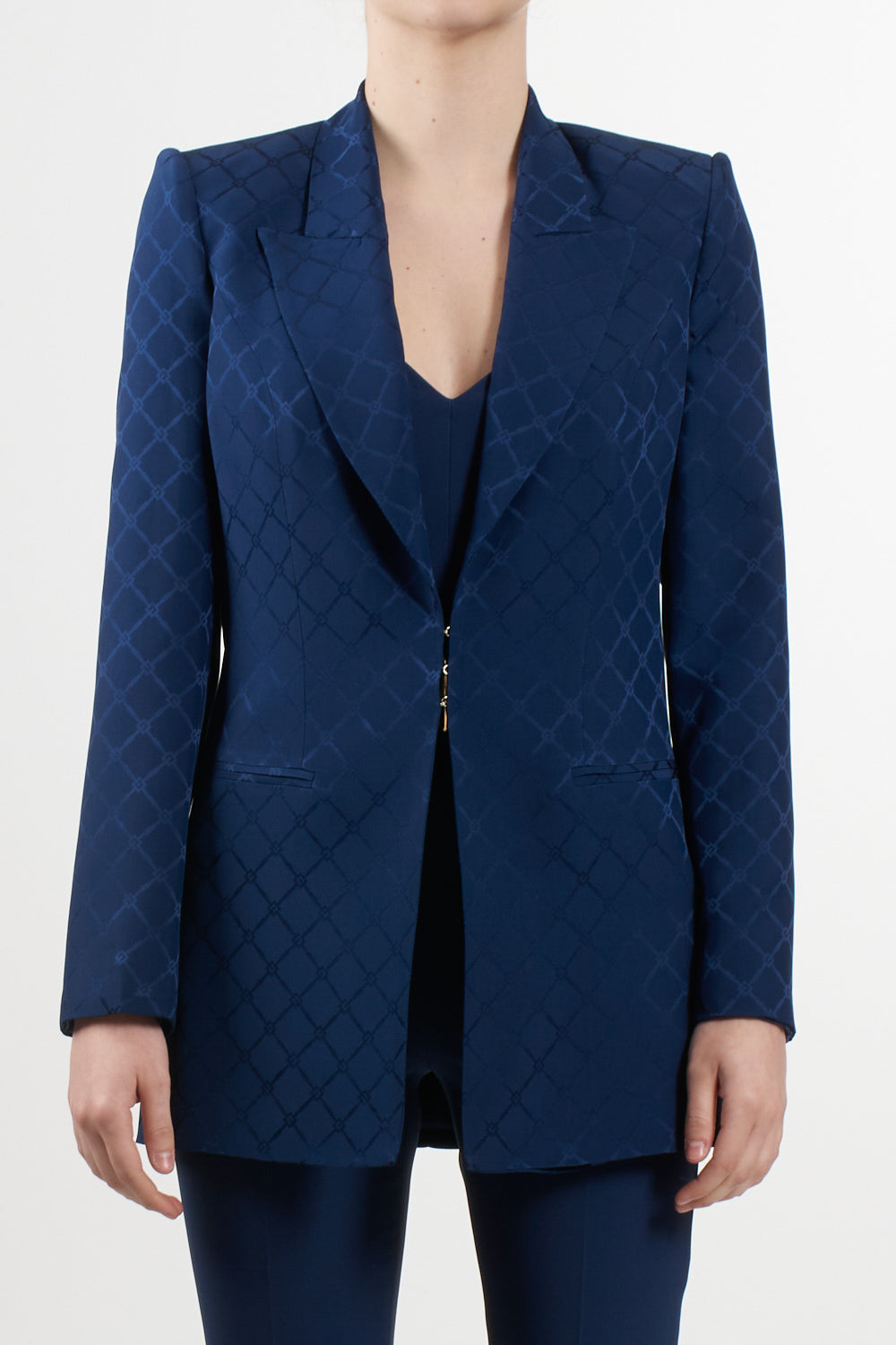 Elegant satin jacket with all-over diamond jacquard workmanship, featuring padded shoulders and peak lapels. The model features hook closure and satin lining, offering a regular fit and a sophisticated look.