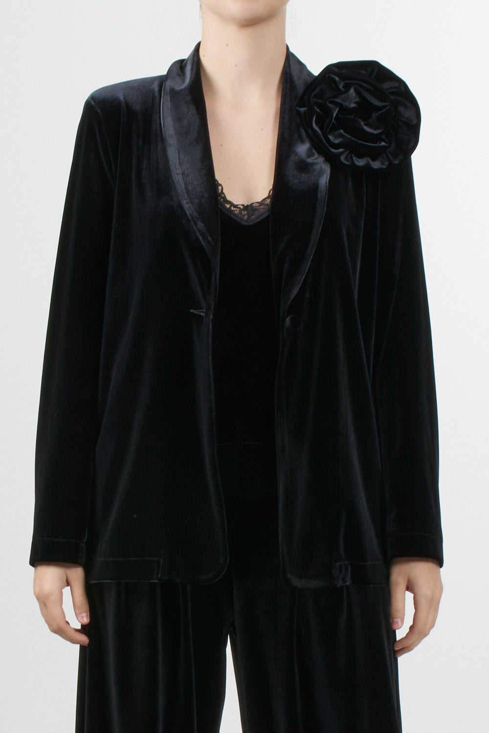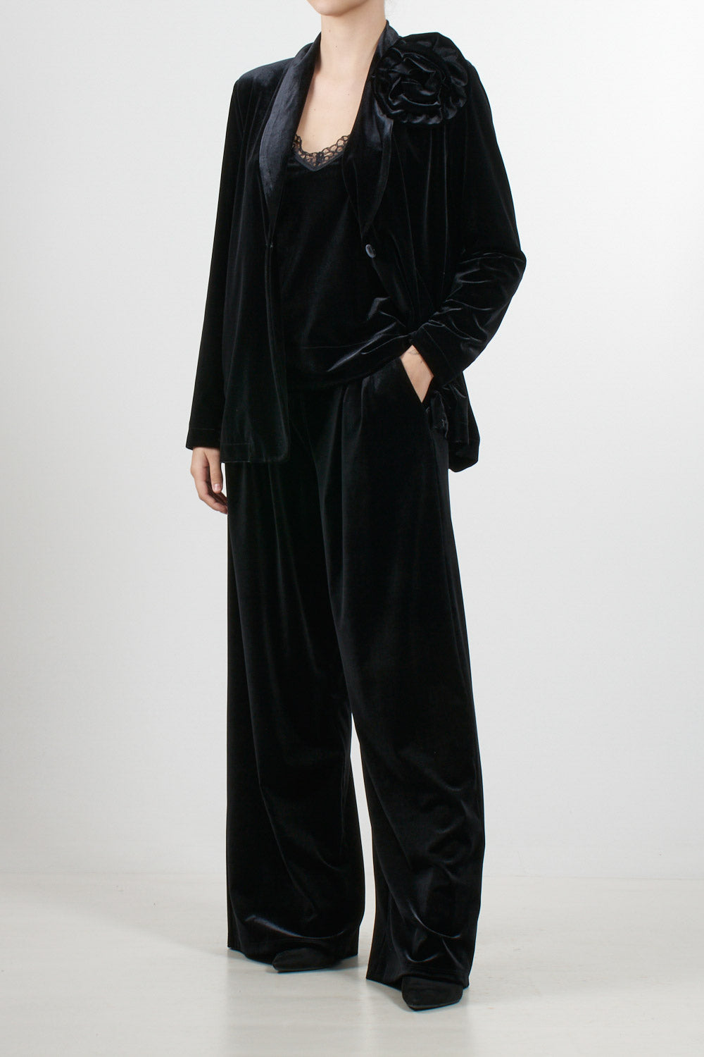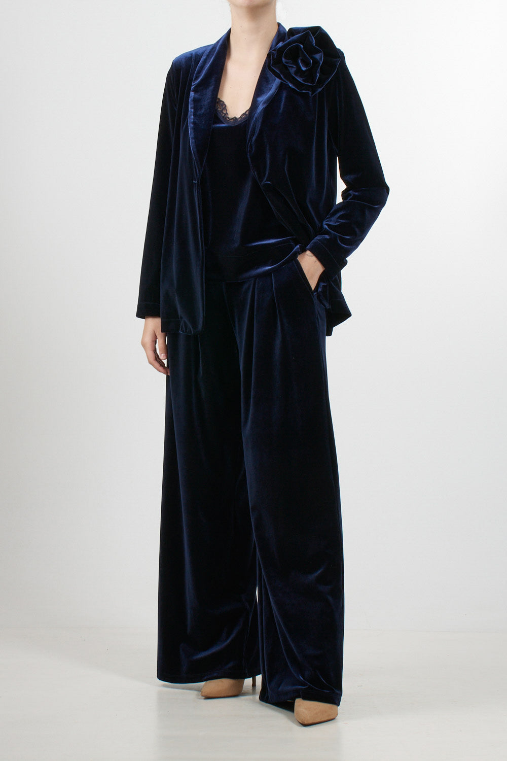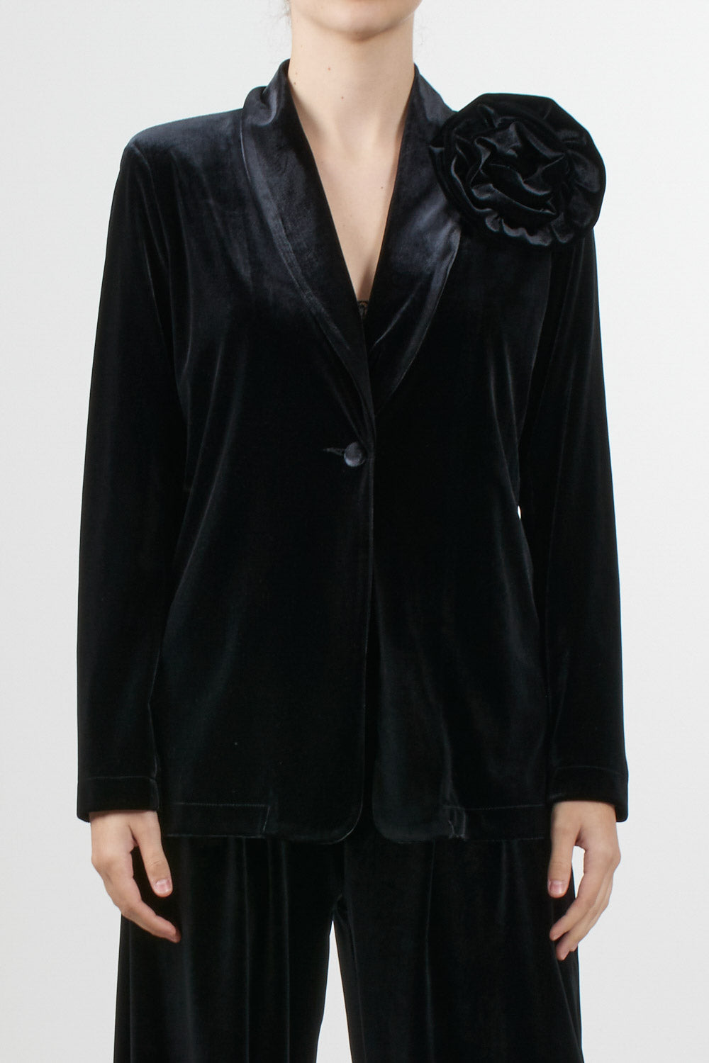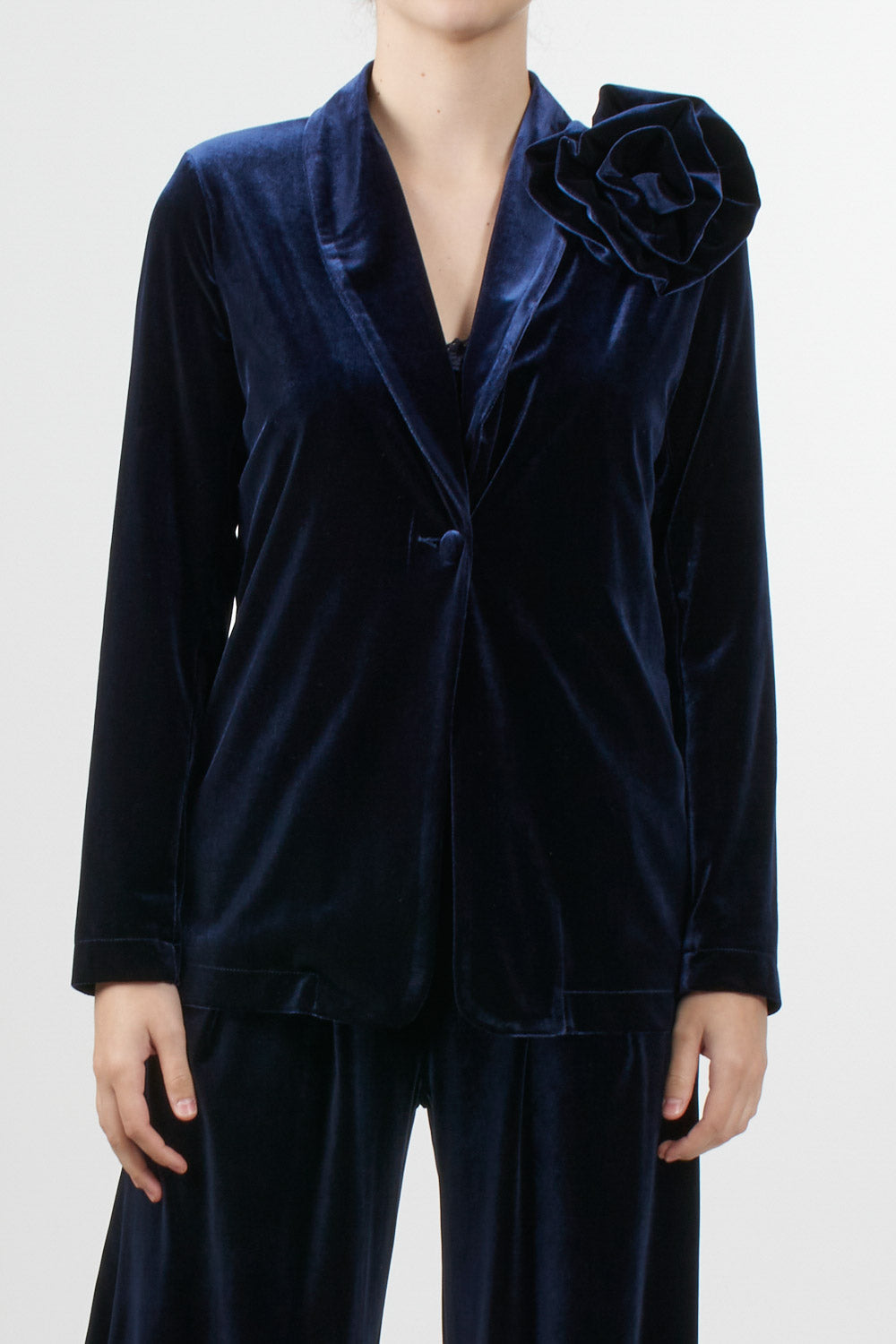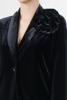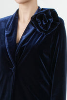 Tensione In velvet jacket, single-breasted design with notch lapels and a removable rose-shaped floral applique on the shoulder. The velvet fabric has a relaxed fit, ideal for formal occasions or a refined evening look.