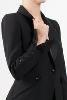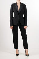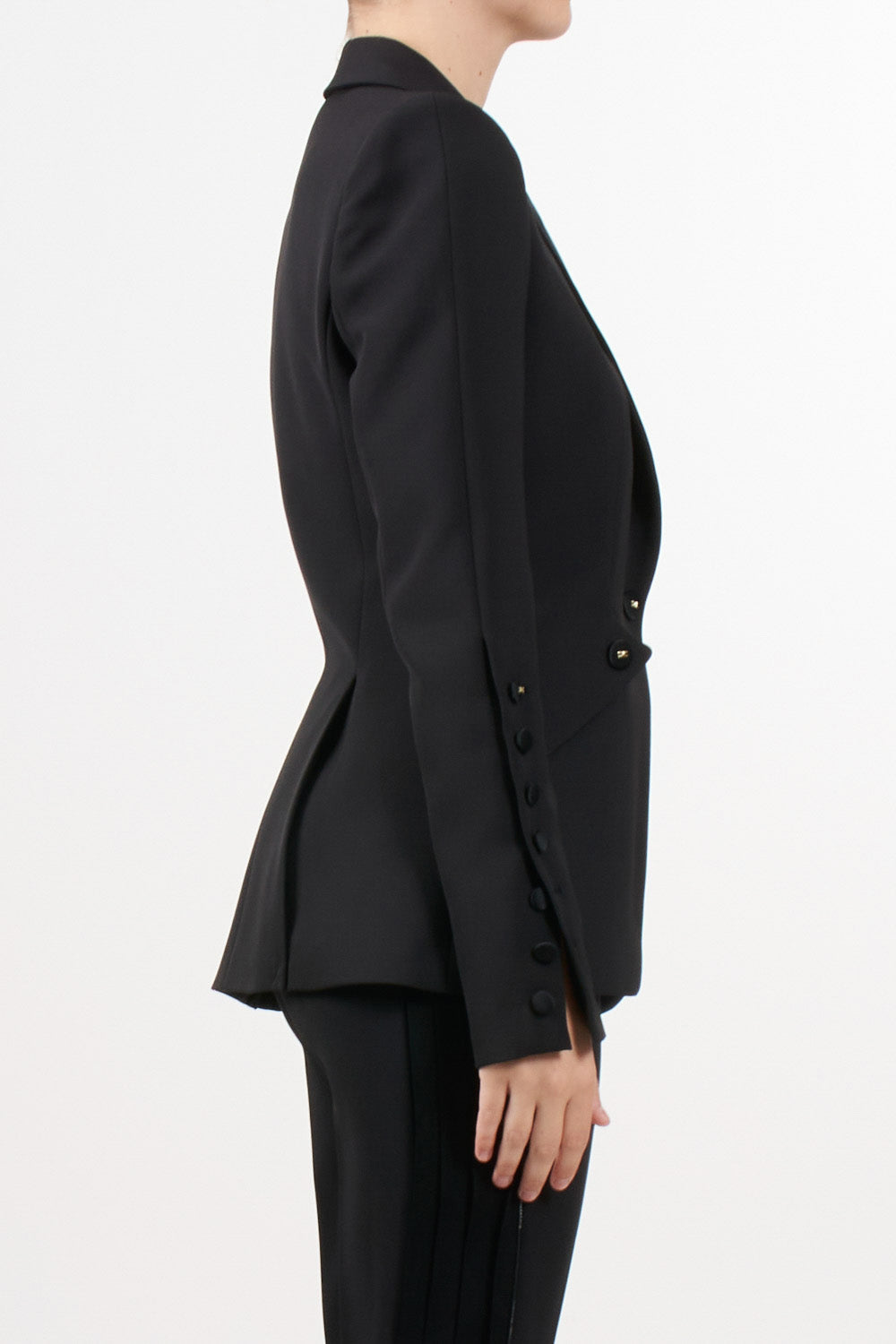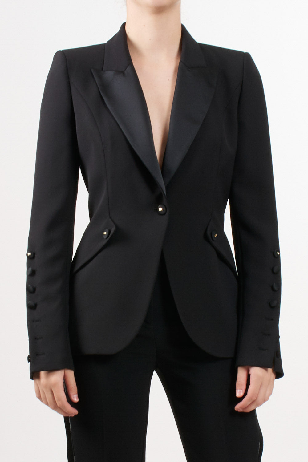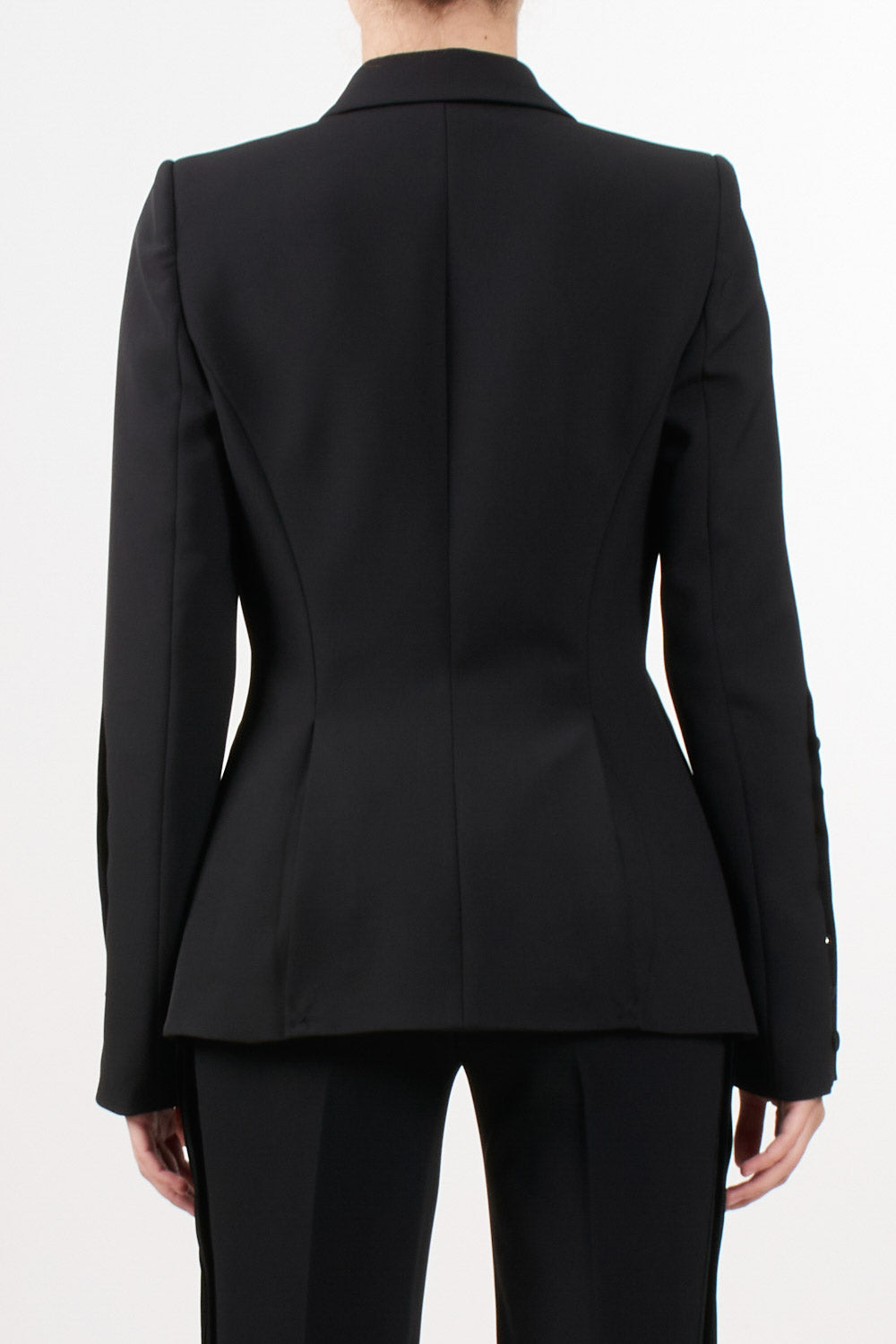 Single-breasted jacket in lightweight crepe with a slim fit. Padded shoulders, satin peak lapels, and matching buttons. The sleeves feature wide snap-button vents. Monogrammed satin lining.