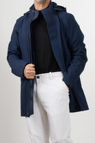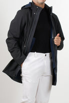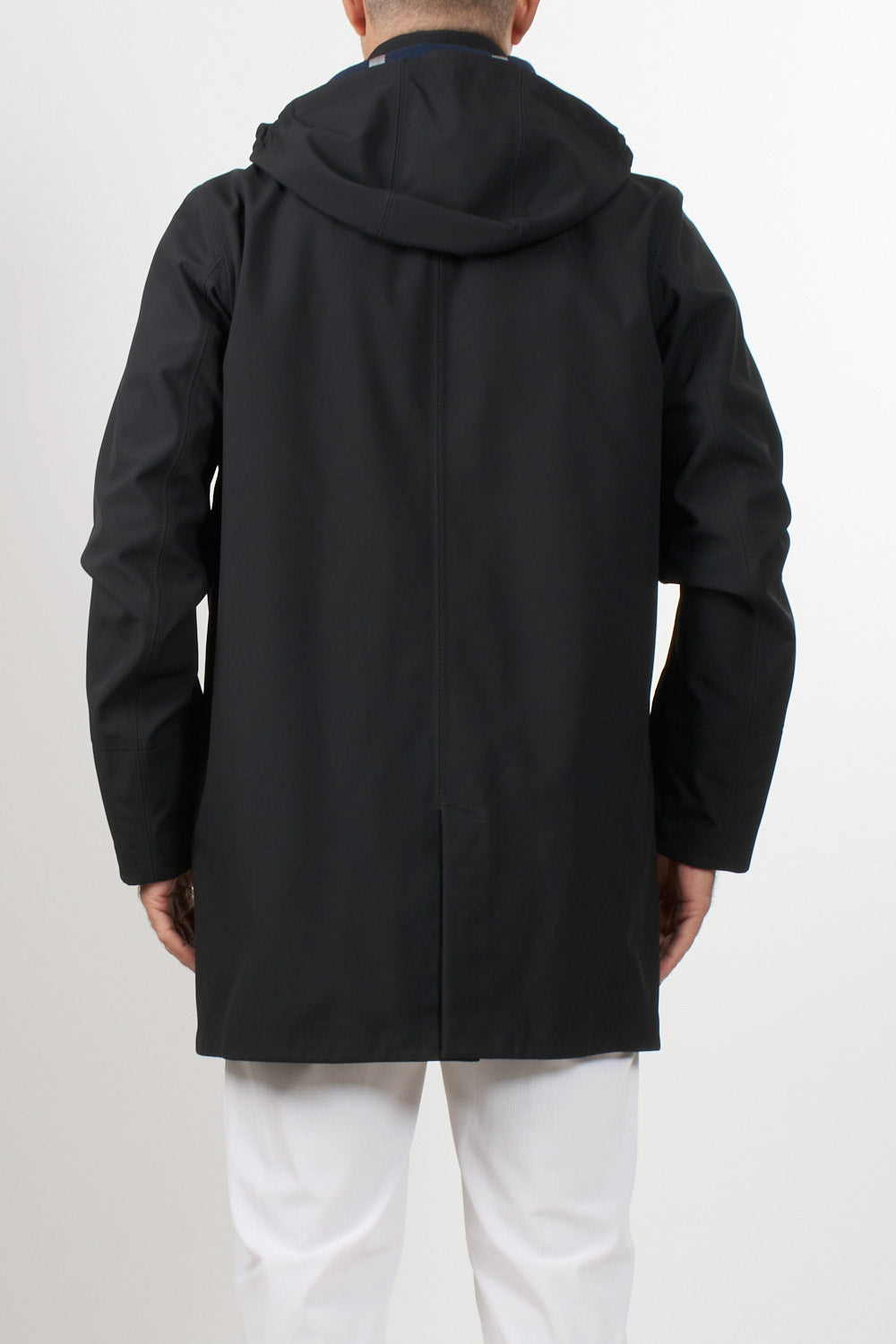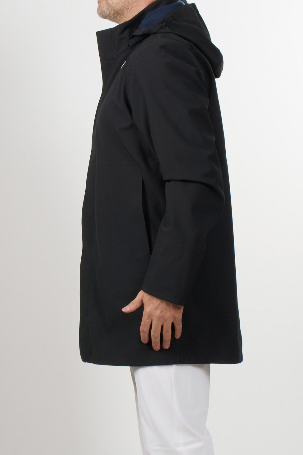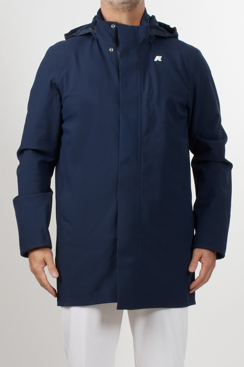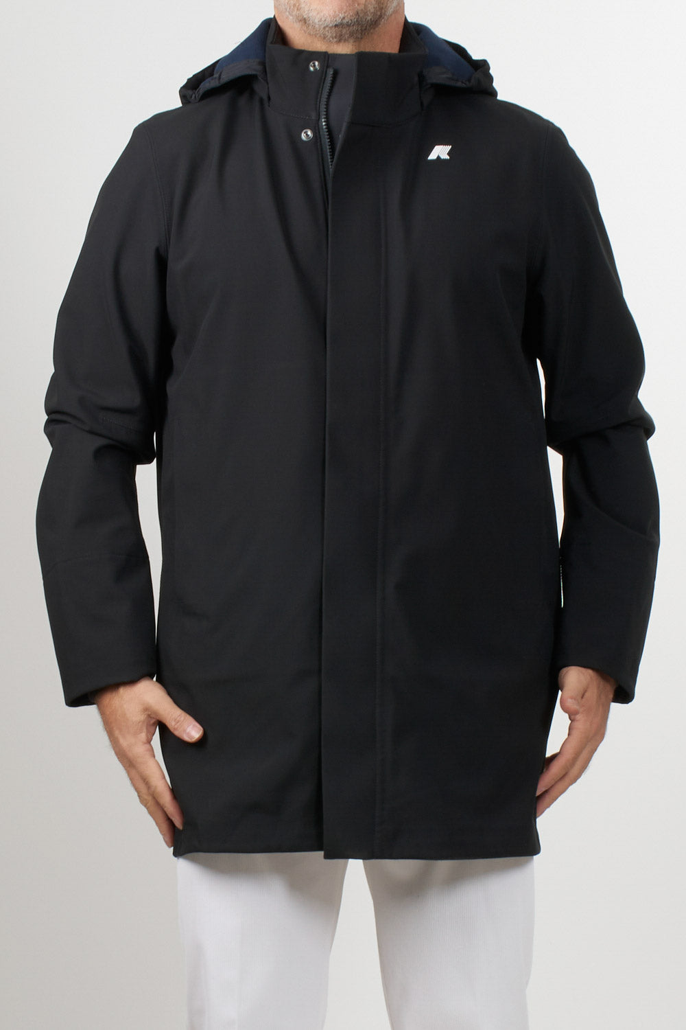 This three-quarter-length K-way parka features a straight fit and versatile cut, making it ideal for transitional weather. Crafted from a 3-layer technical fabric, it combines a waterproof nylon exterior with an insulating membrane and a fleece lining. The detachable, adjustable hood, covered zip, and heat-sealed seams ensure optimal protection and comfort.