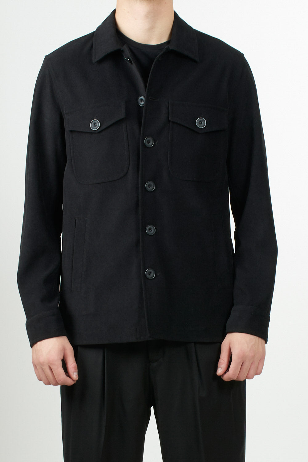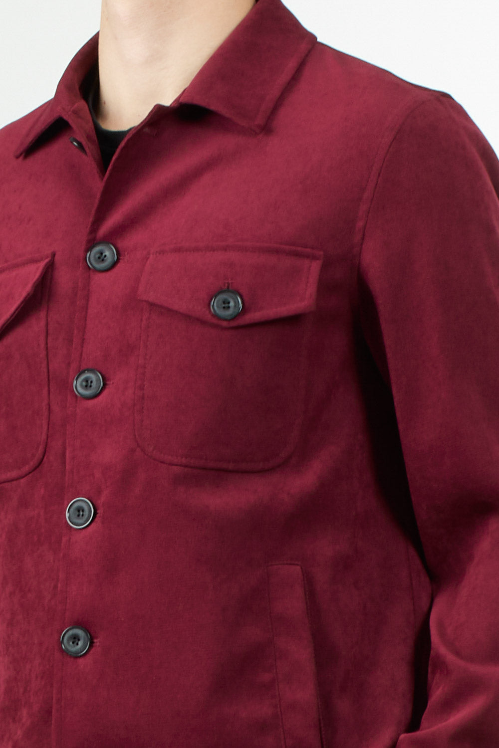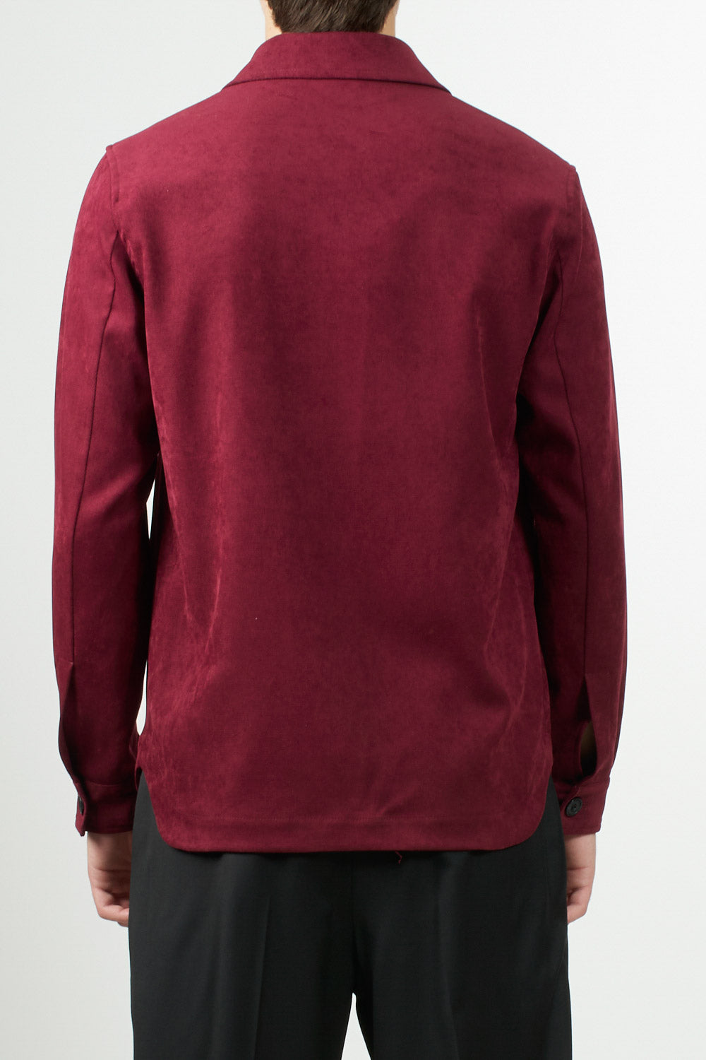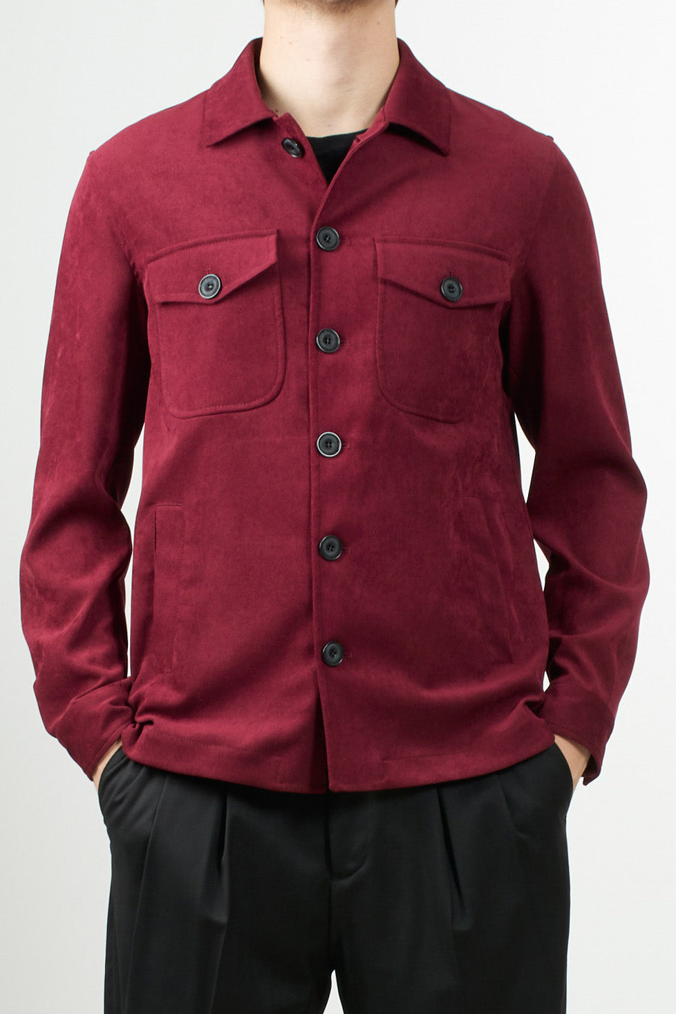 A modern-cut jacket with a button closure and front flap pockets. Crafted from soft synthetic suede, it combines style and practicality.