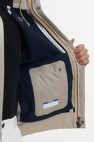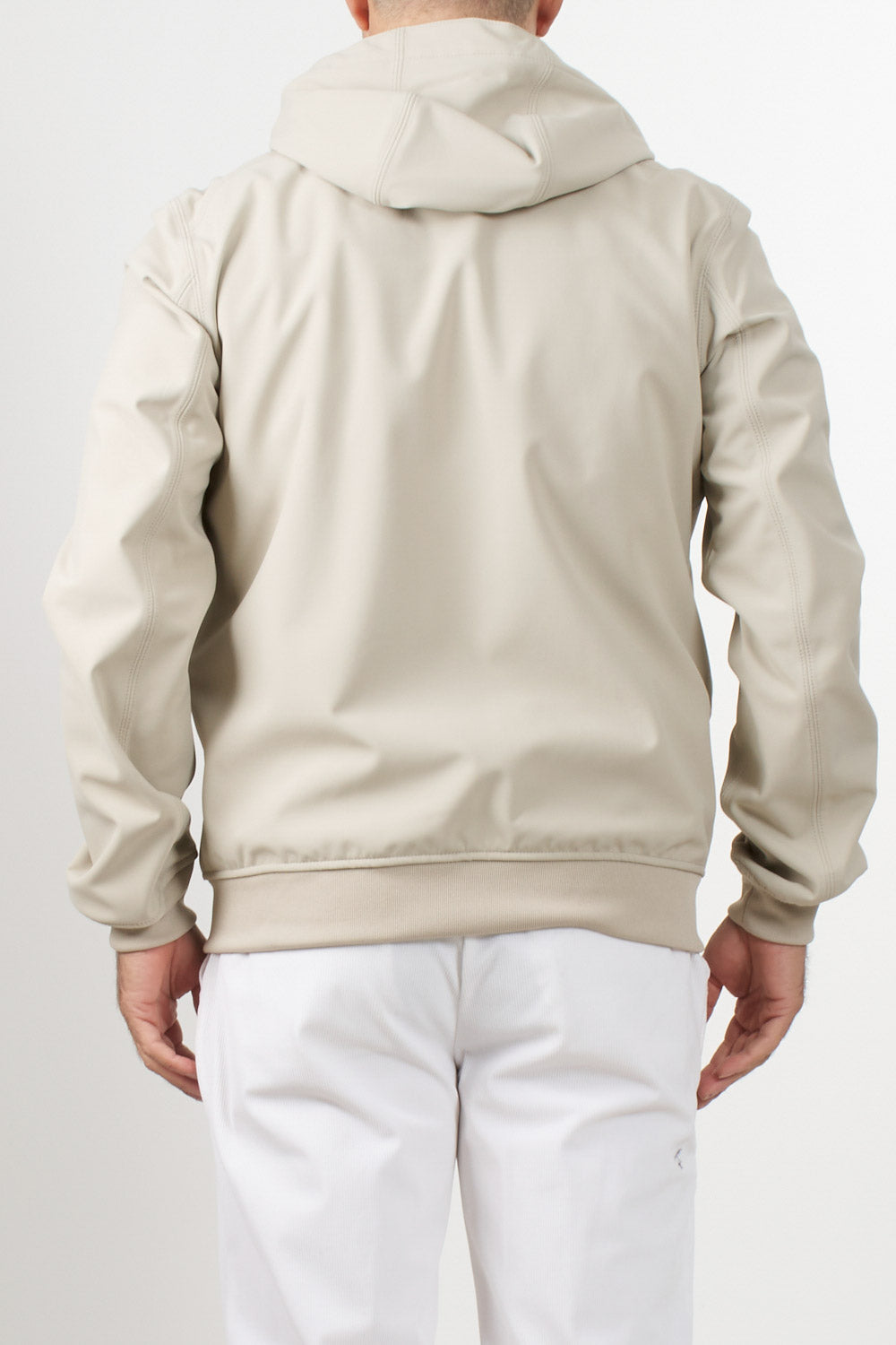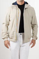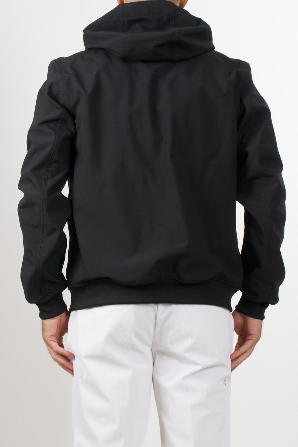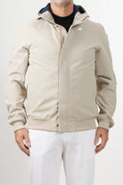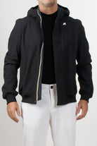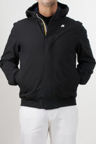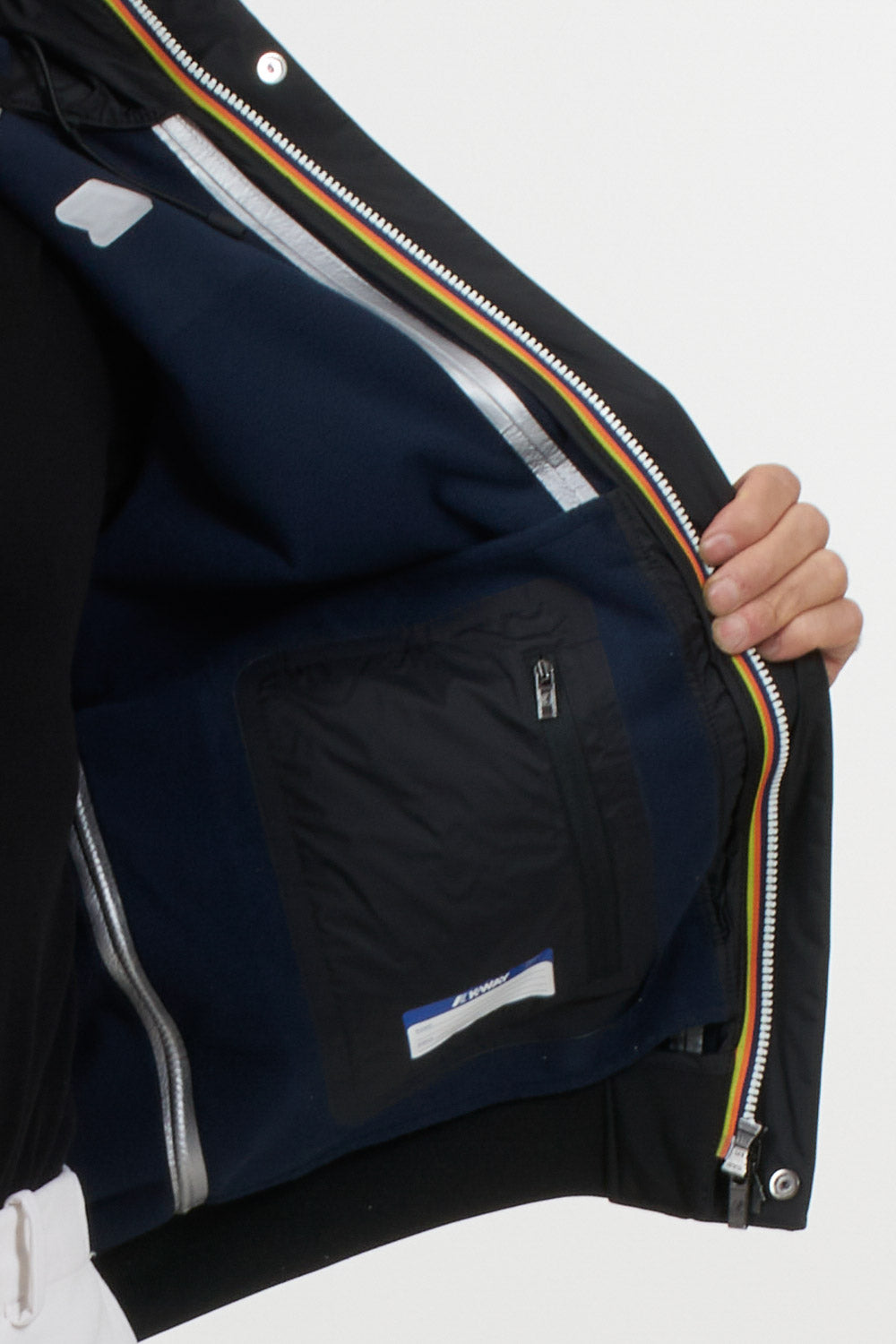 This short K-way jacket features a slim fit and functional design, perfect for transitional weather. Made from a triple-layer fabric, it combines a waterproof and windproof stretch nylon exterior with an insulating membrane and a soft microfleece interior. Technical details such as heat-sealed seams, an adjustable hood, and a concealed zip ensure protection and comfort. A white silicone logo on the chest completes the look.