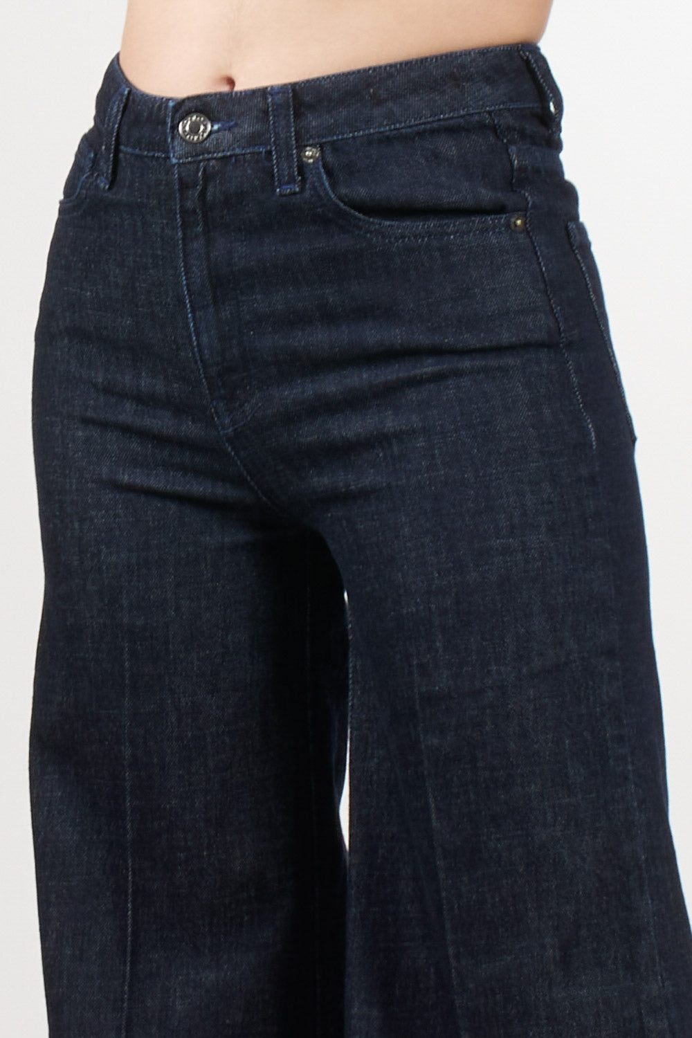 Dark denim palazzo jeans from Vicolo, high-waisted to enhance the leg, side pockets, metal button fastening, back finished with patch pockets and eco-leather label detail with embossed logo.