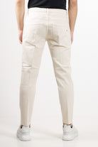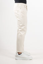 Slim-fit five-pocket jeans with a regular waist, a front zip and button closure, tone-on-tone stitching, and exposed metal details. The iconic Dondup logo is featured on the back, along with a small metal monogram on the back pocket.