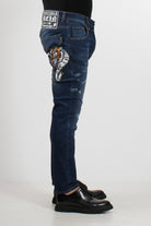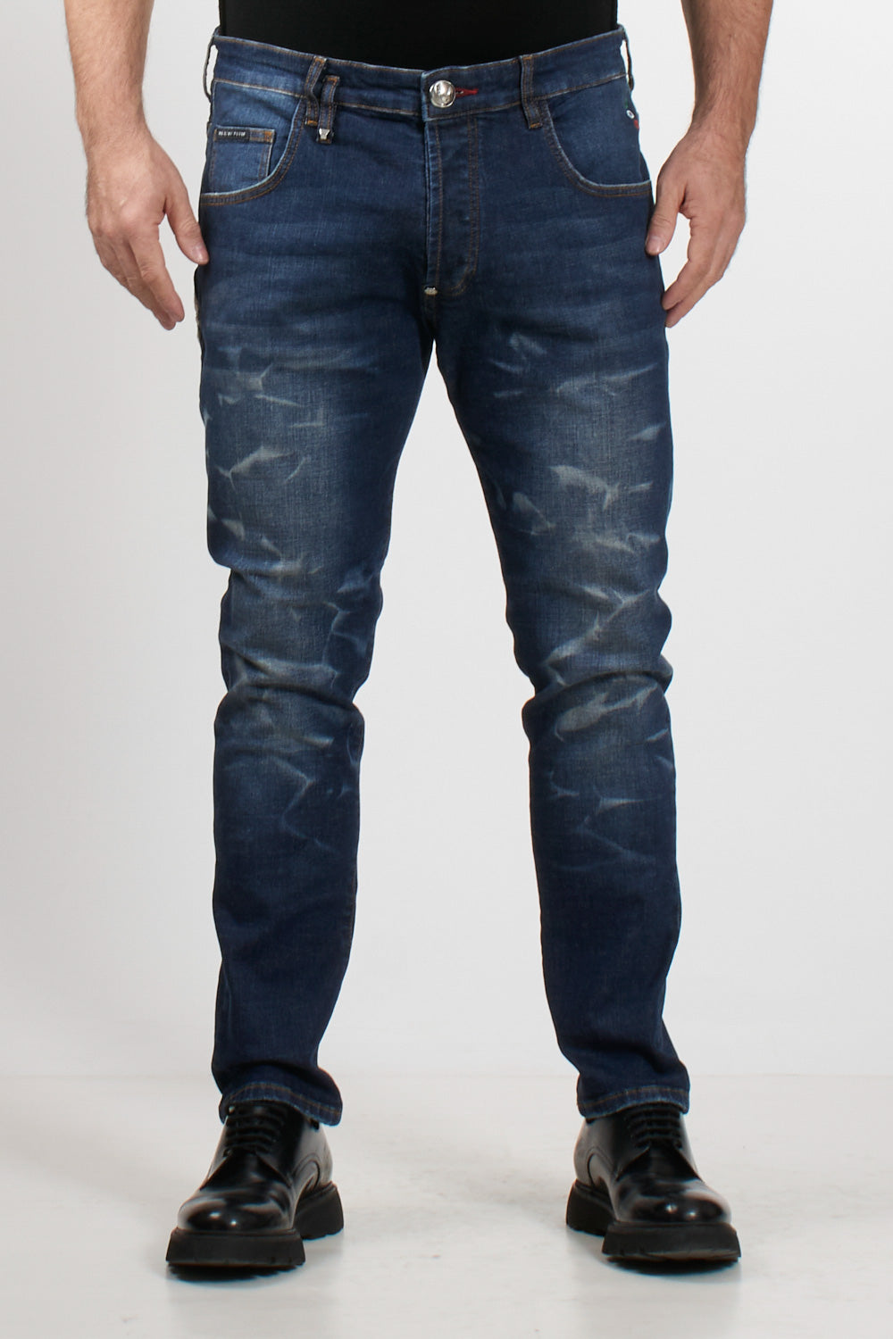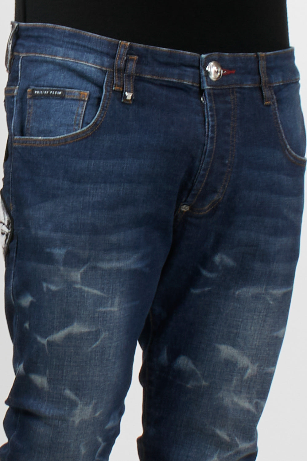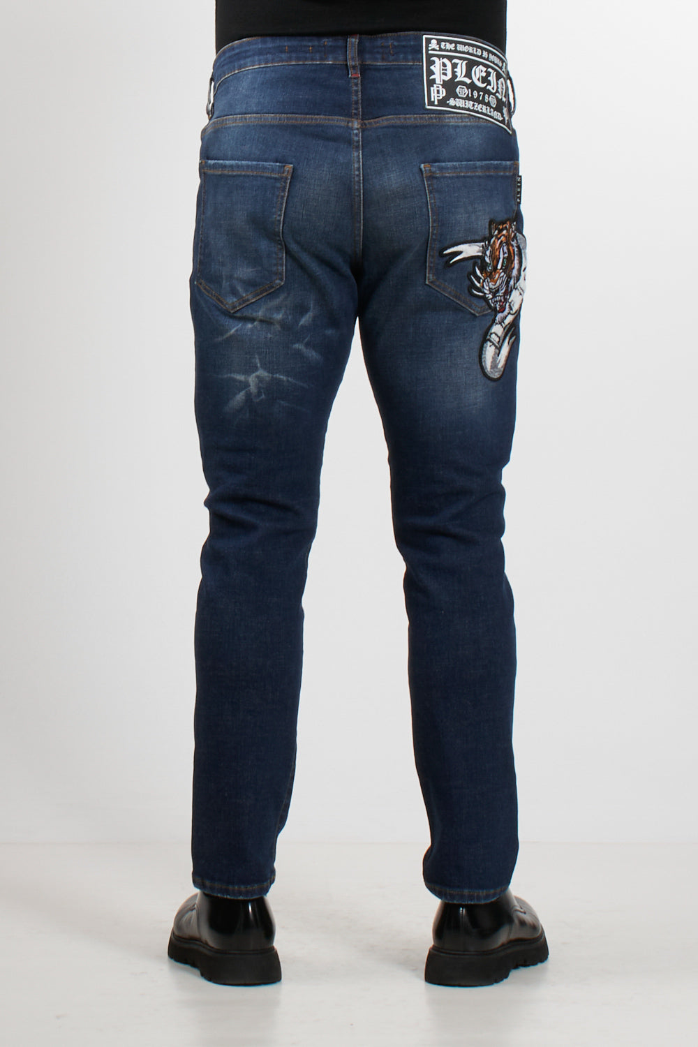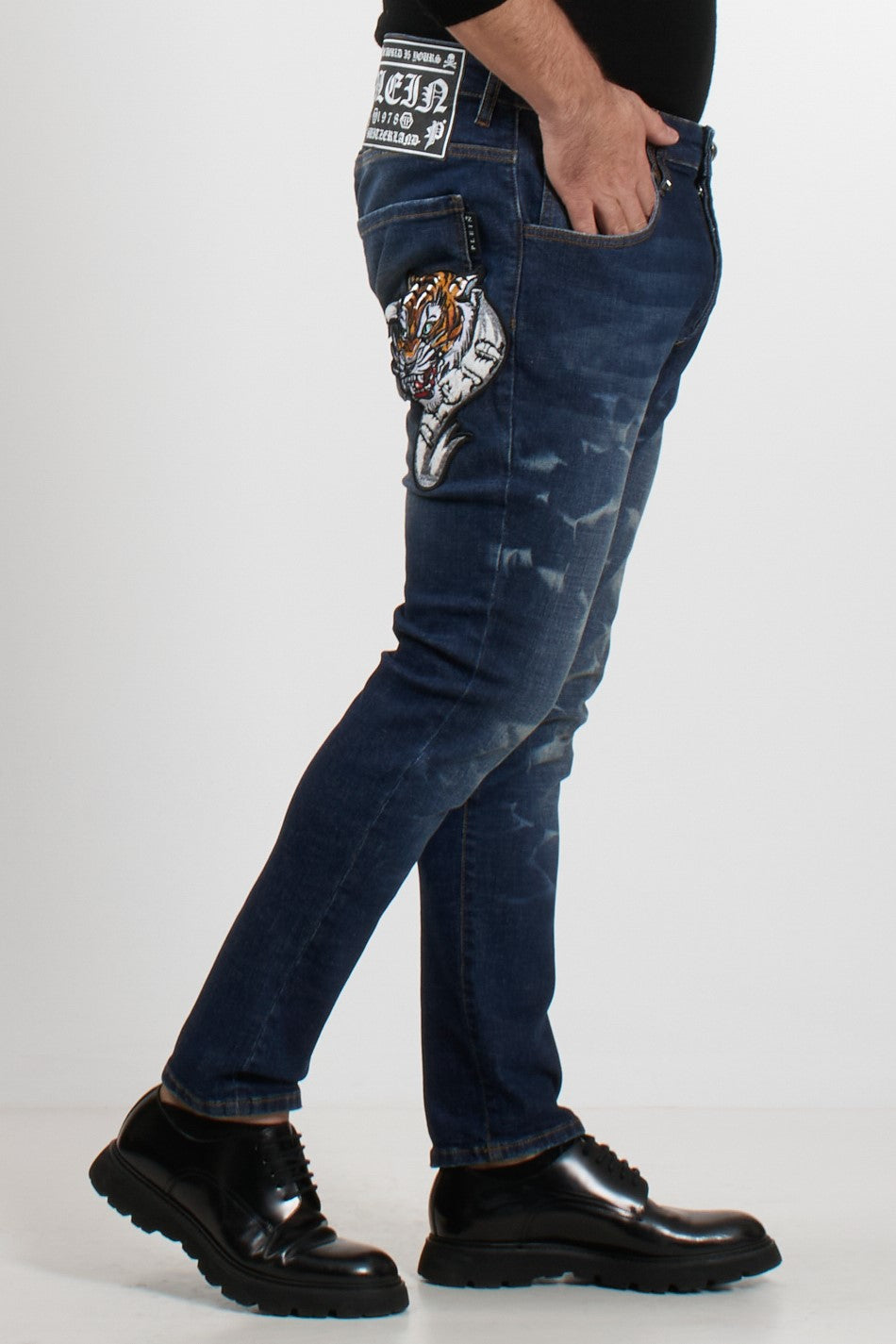 Philipp Plein skinny jeans, five pockets, belt loops, front button fastening, side tiger, maxi logo patch