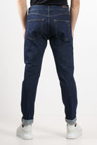 The Icon model by Dondup is a five-pocket jeans, featuring a single button and zip fastening, contrasting stitching, and a metal micro logo applied on the back pocket.