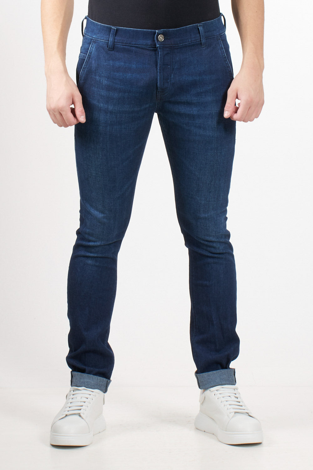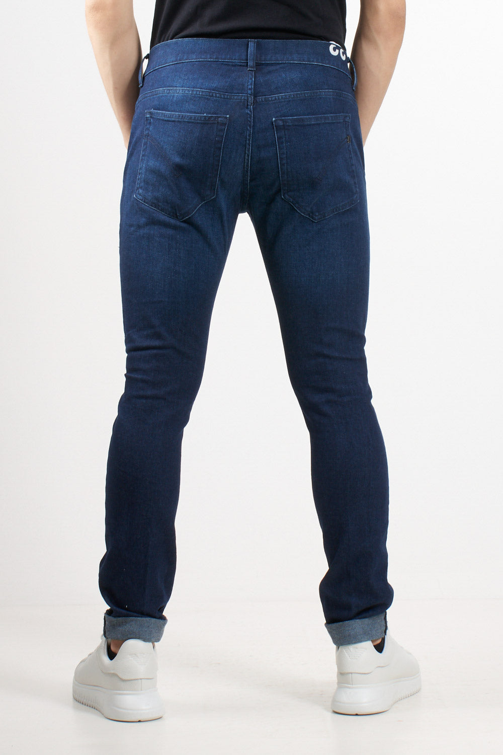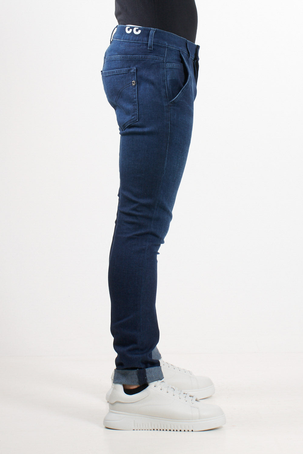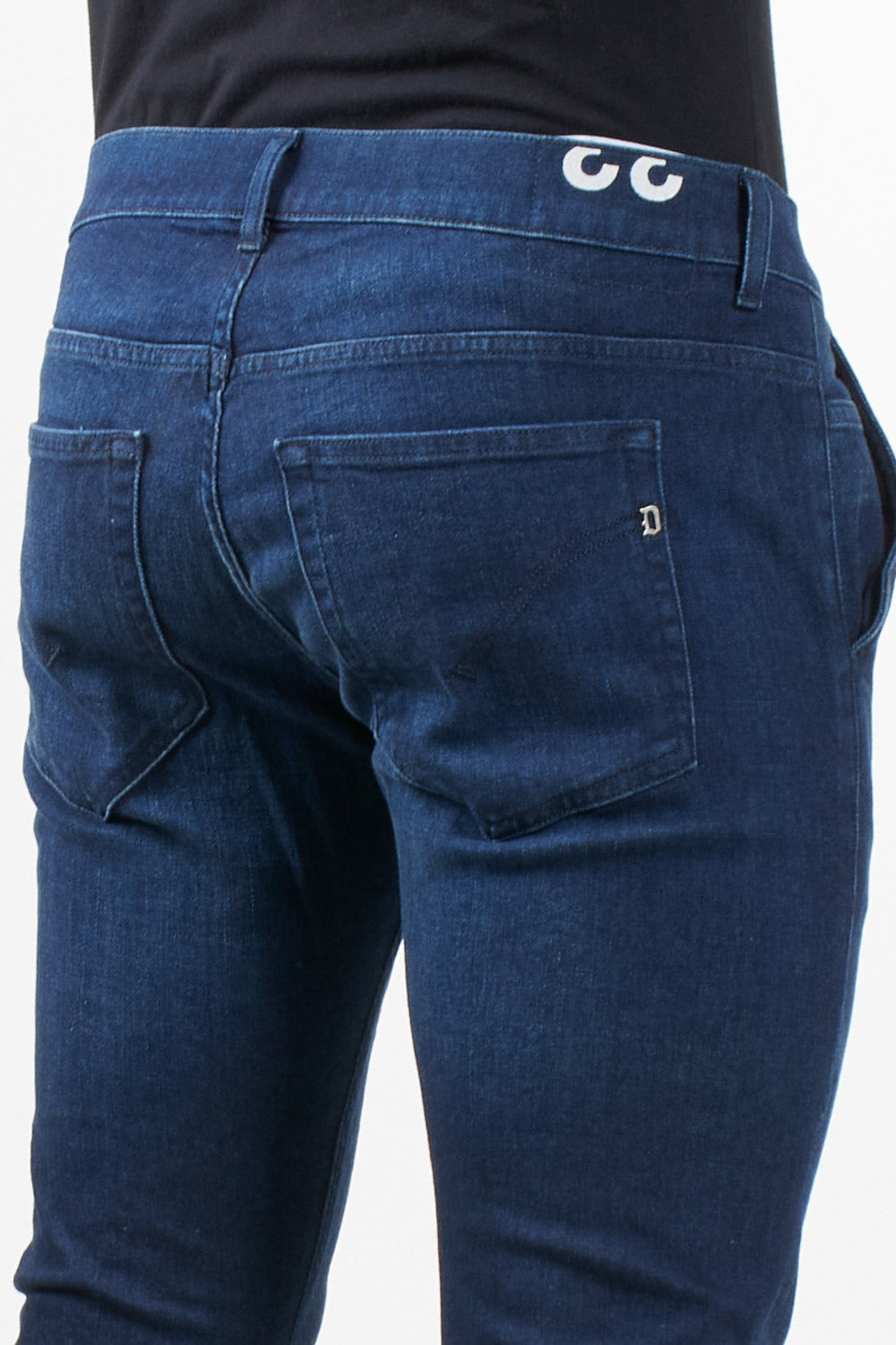 Slim-fit jeans with a slanted pocket. The Konor model stands out for its mid-rise, minimal details, and slim silhouette. The medium-blue wash gives the garment a clean, urban finish, perfect for everyday wear. Dondup logo printed on the waistband and metal "D" detail on the back.