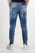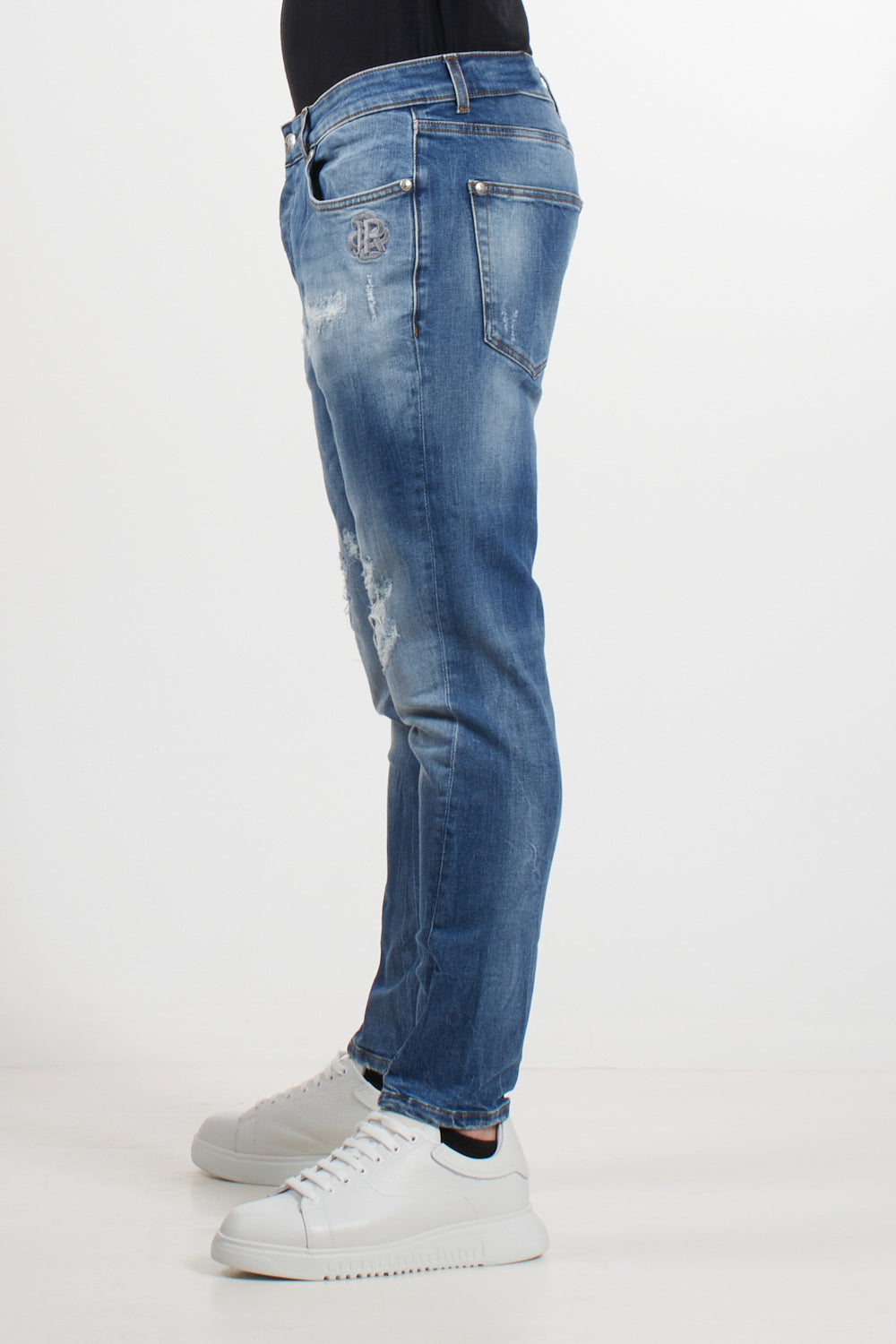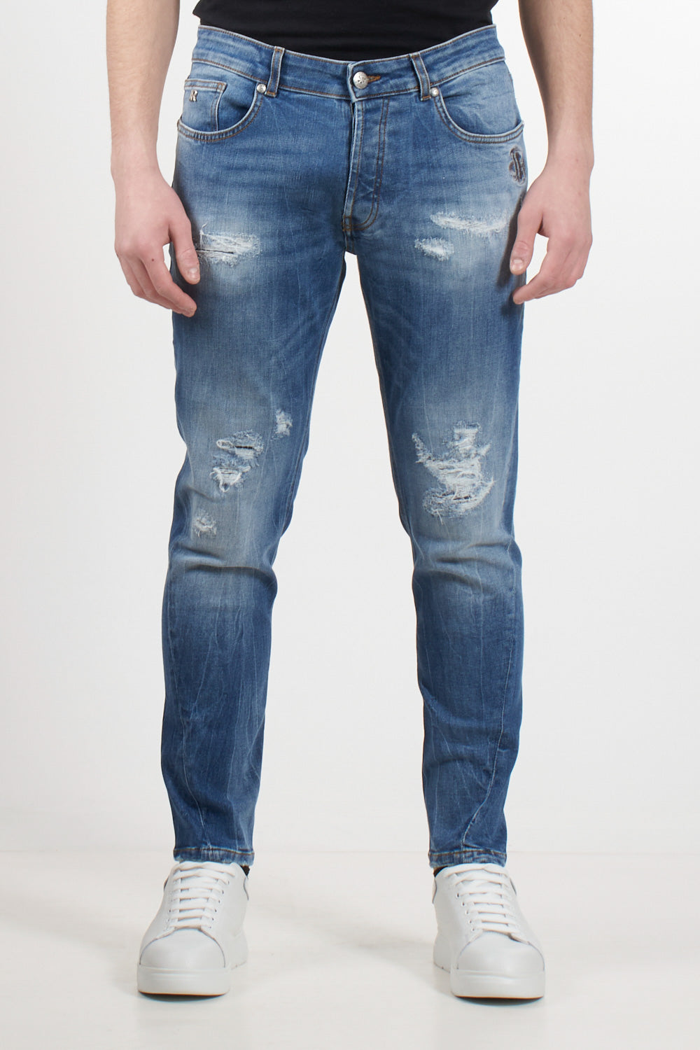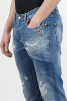 John Richmond five-pocket jeans, belt loops, front button fastening, metal micro logo on the front, logo patch on the back