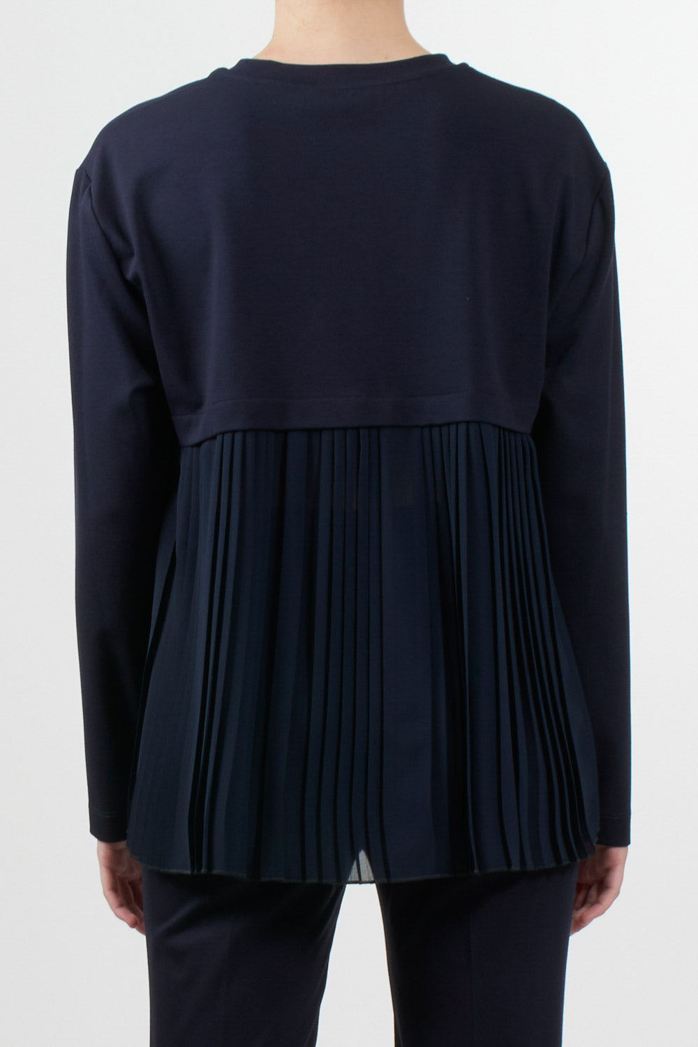 Jijil blouse with long sleeves, a round neckline, and a relaxed fit. The distinctive detail is the pleated insert on the front and back, adding movement and a feminine touch. Ideal for casual-chic looks or to complete any outfit with elegance.