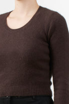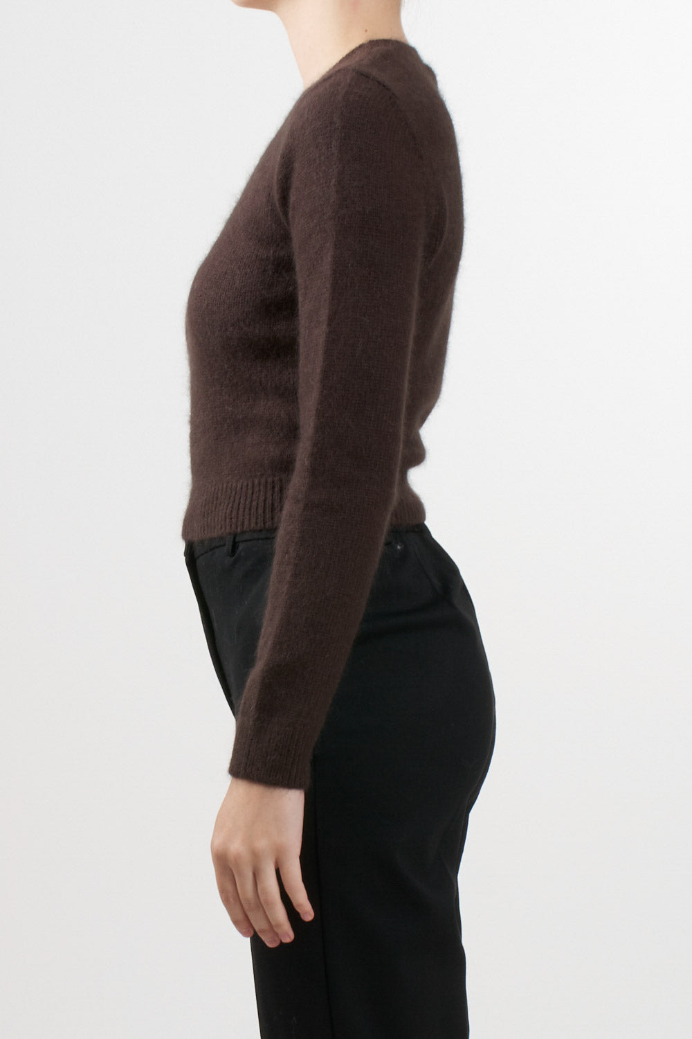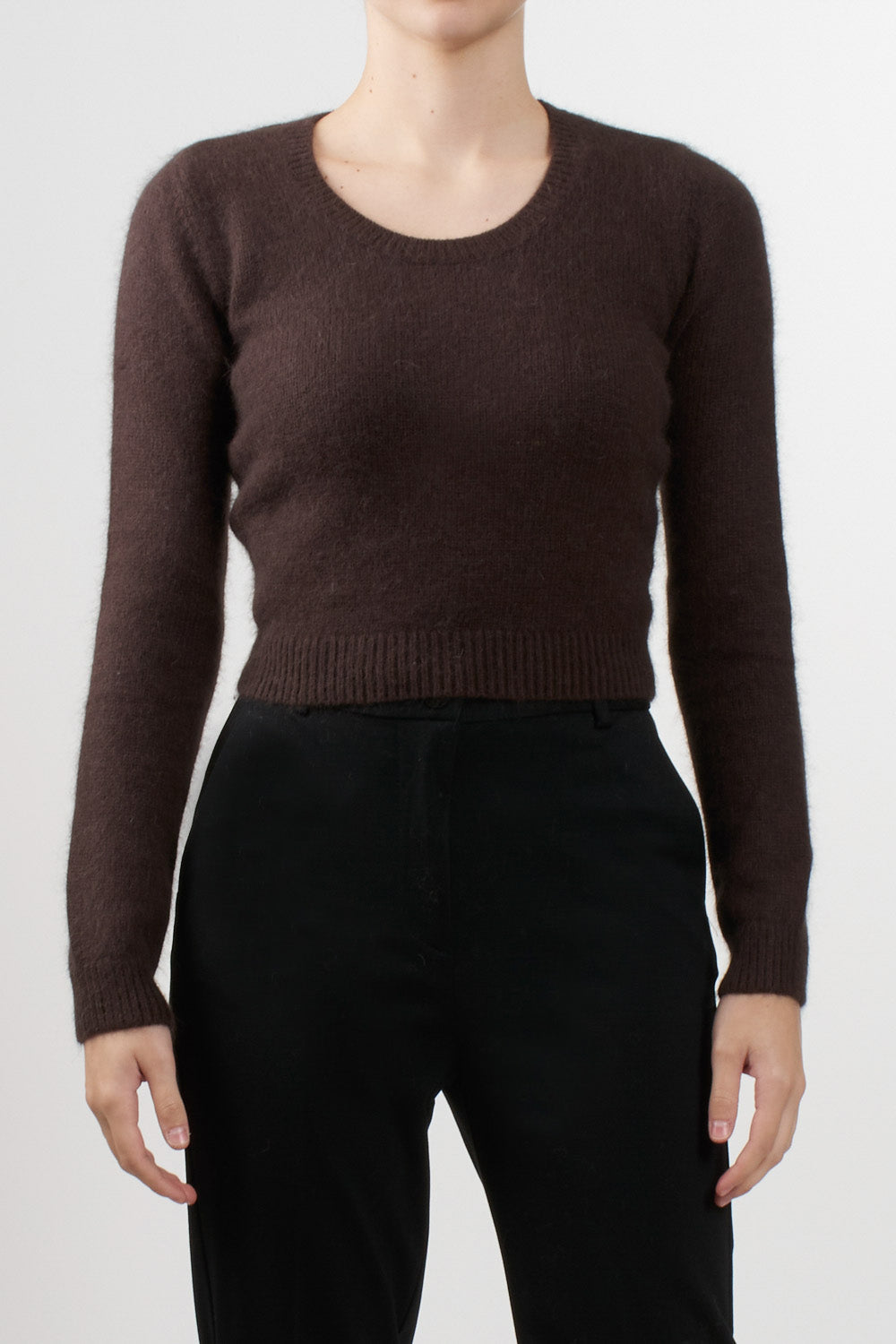 Essential sweater made of Angora wool blend yarn, round neck, long sleeves and ribbed finishes on the bottom and cuffs. Slim fit and slightly cropped length.