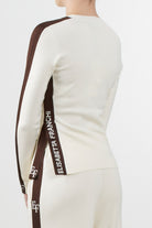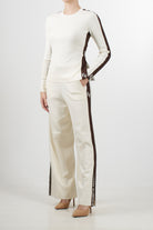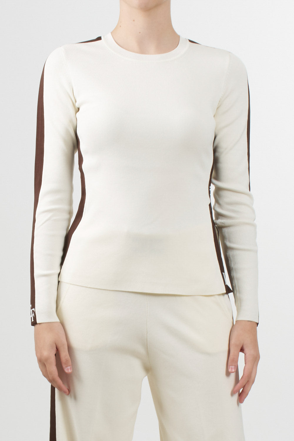 Viscose sweater with a slim fit, crew neck, long sleeves, shiny viscose bands, inlaid logos in contrasting colors, side slit reveals a discreet logo detail, completing the garment with elegance.