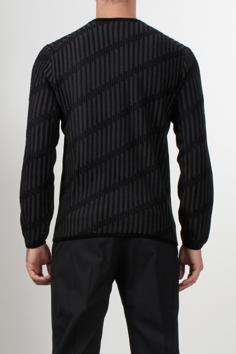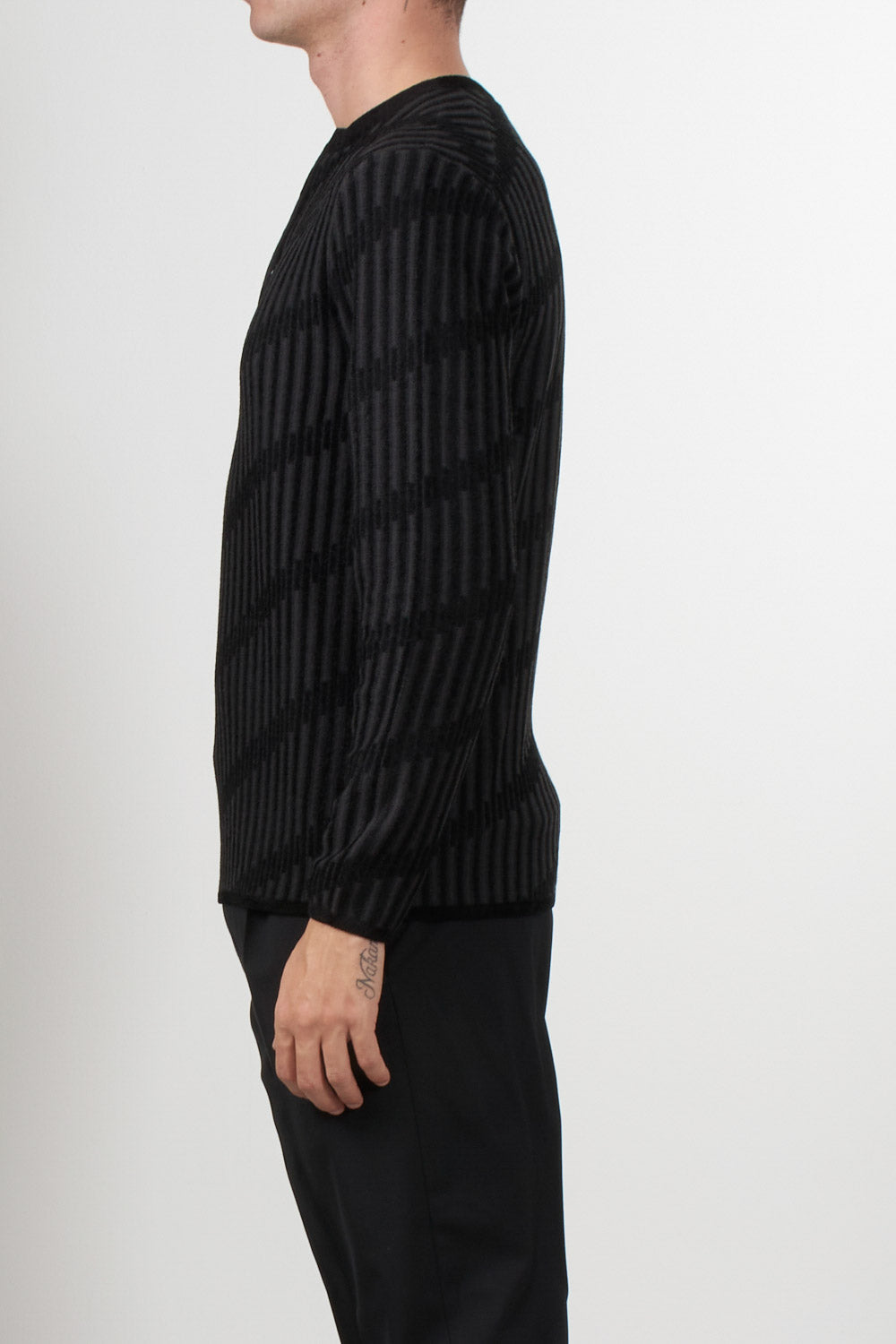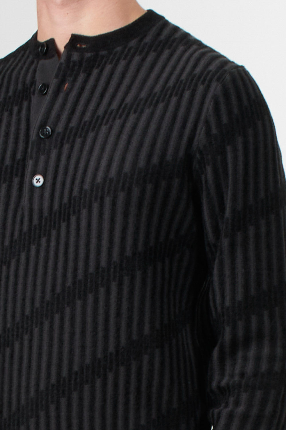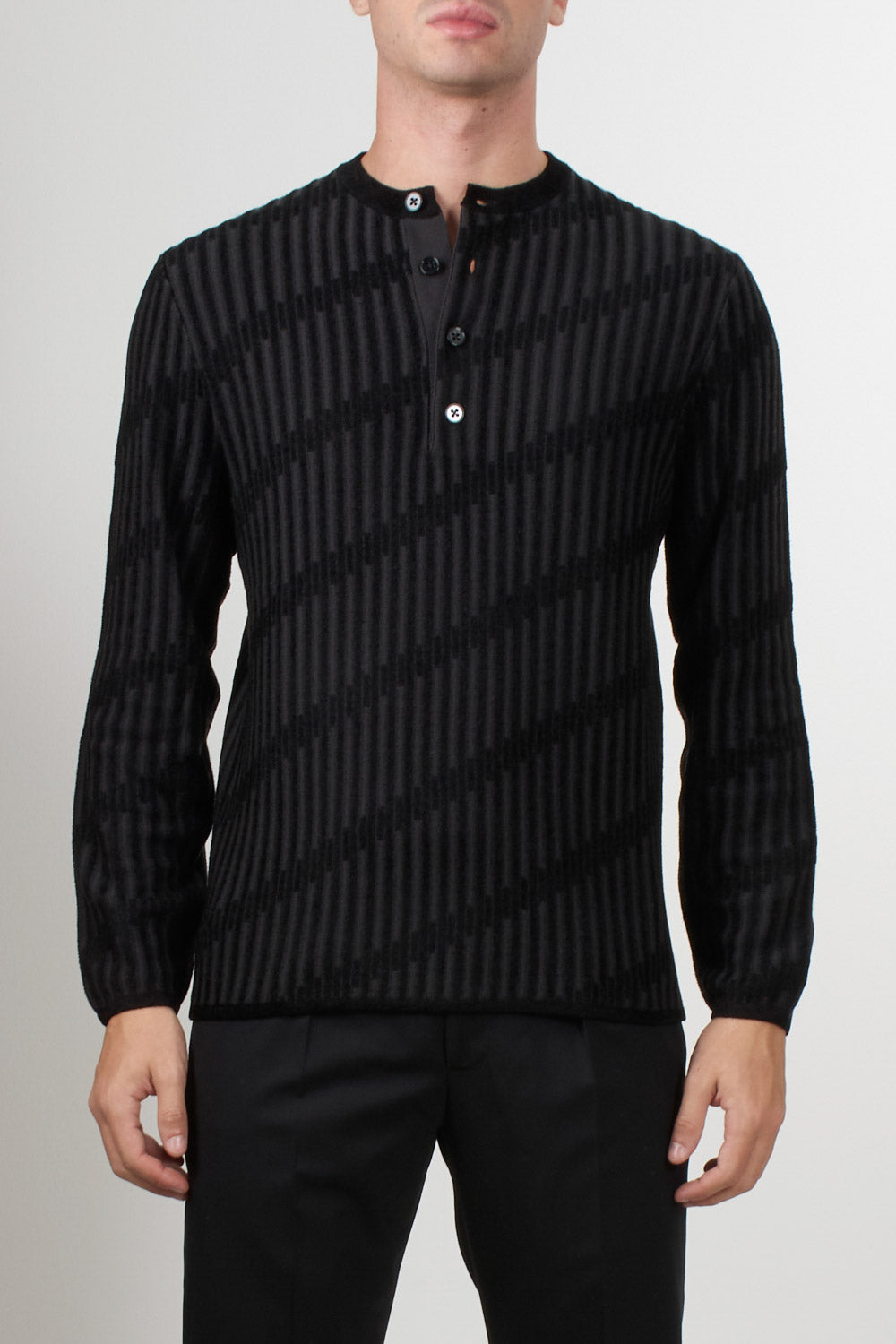 Emporio Armani sweater crafted from premium virgin wool with a two-tone jacquard weave and embellished with soft chenille details. Featuring a henley collar and ribbed trims, this sophisticated and versatile piece is ideal for enhancing both casual and refined looks.