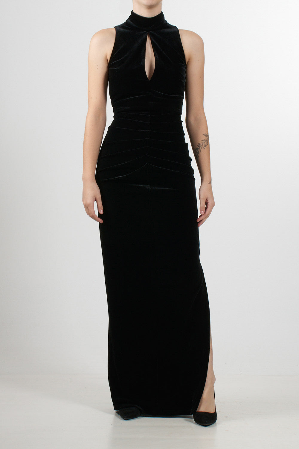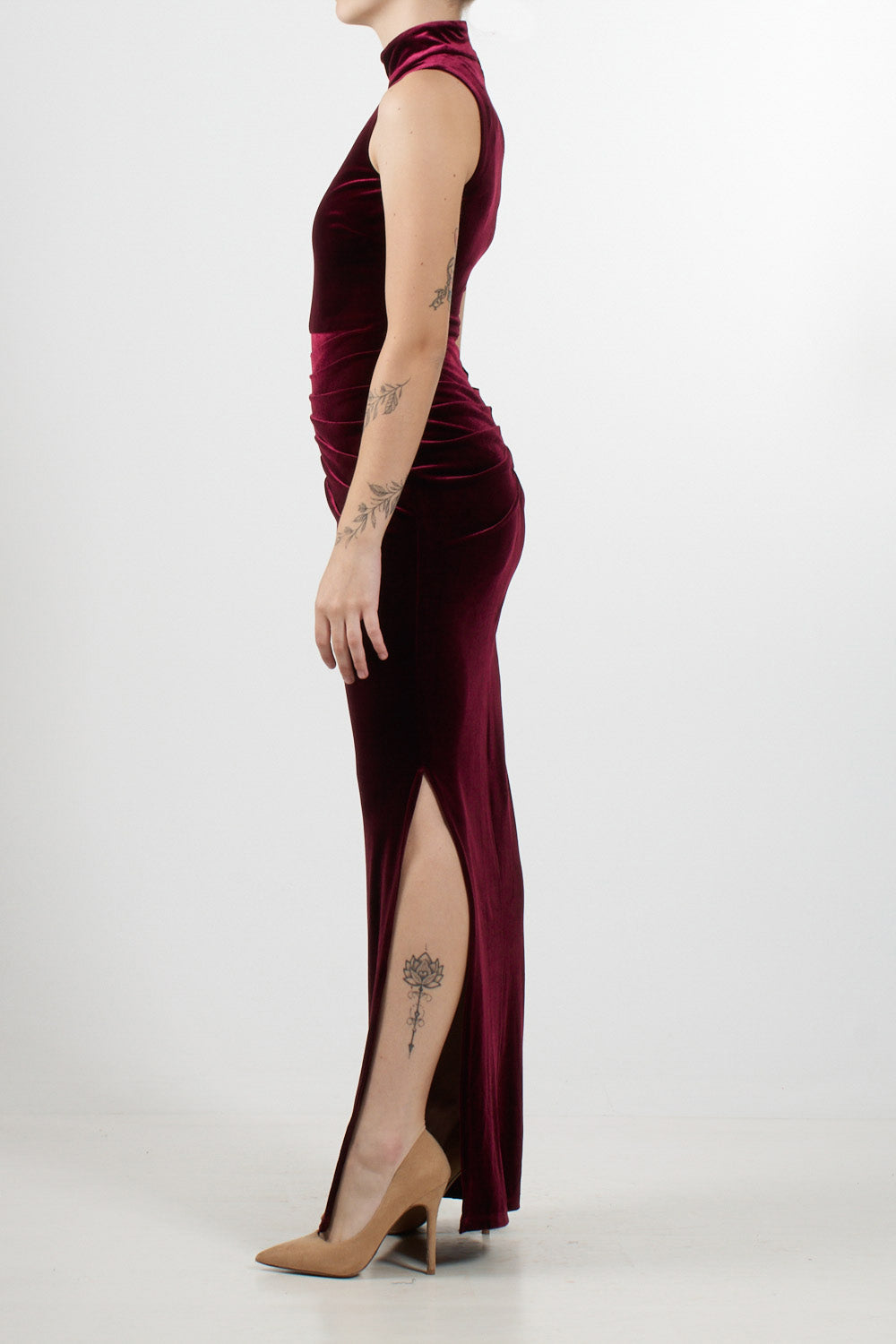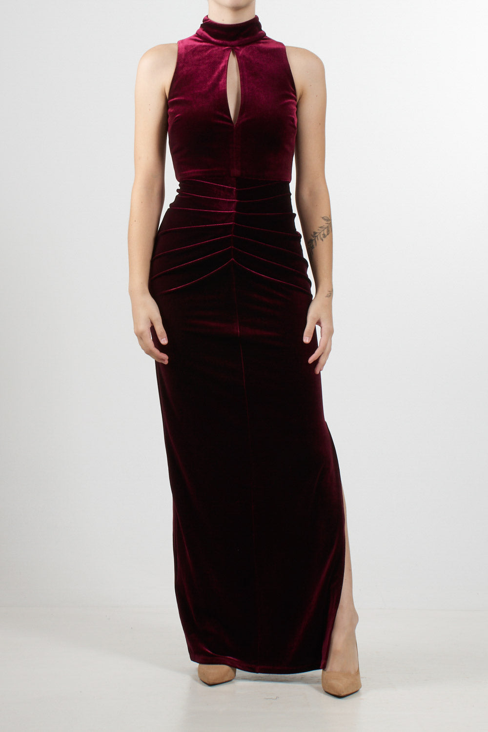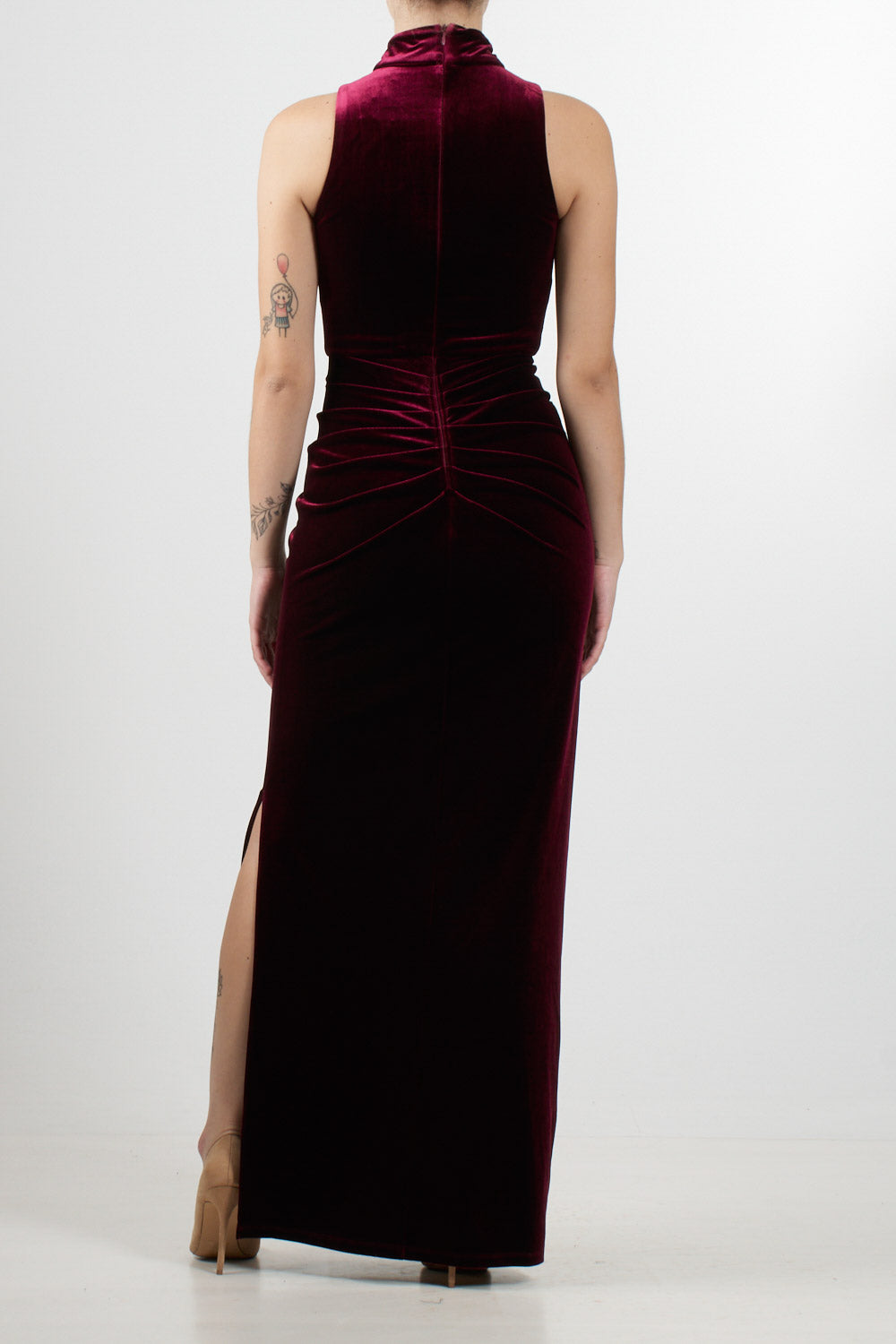 Velvet evening dress by No Secrets with a keyhole neckline and high neck. The fitted silhouette is enhanced by draped details at the waist that accentuate the silhouette, while the side slit adds movement and femininity. A sophisticated piece, ideal for elegant occasions.