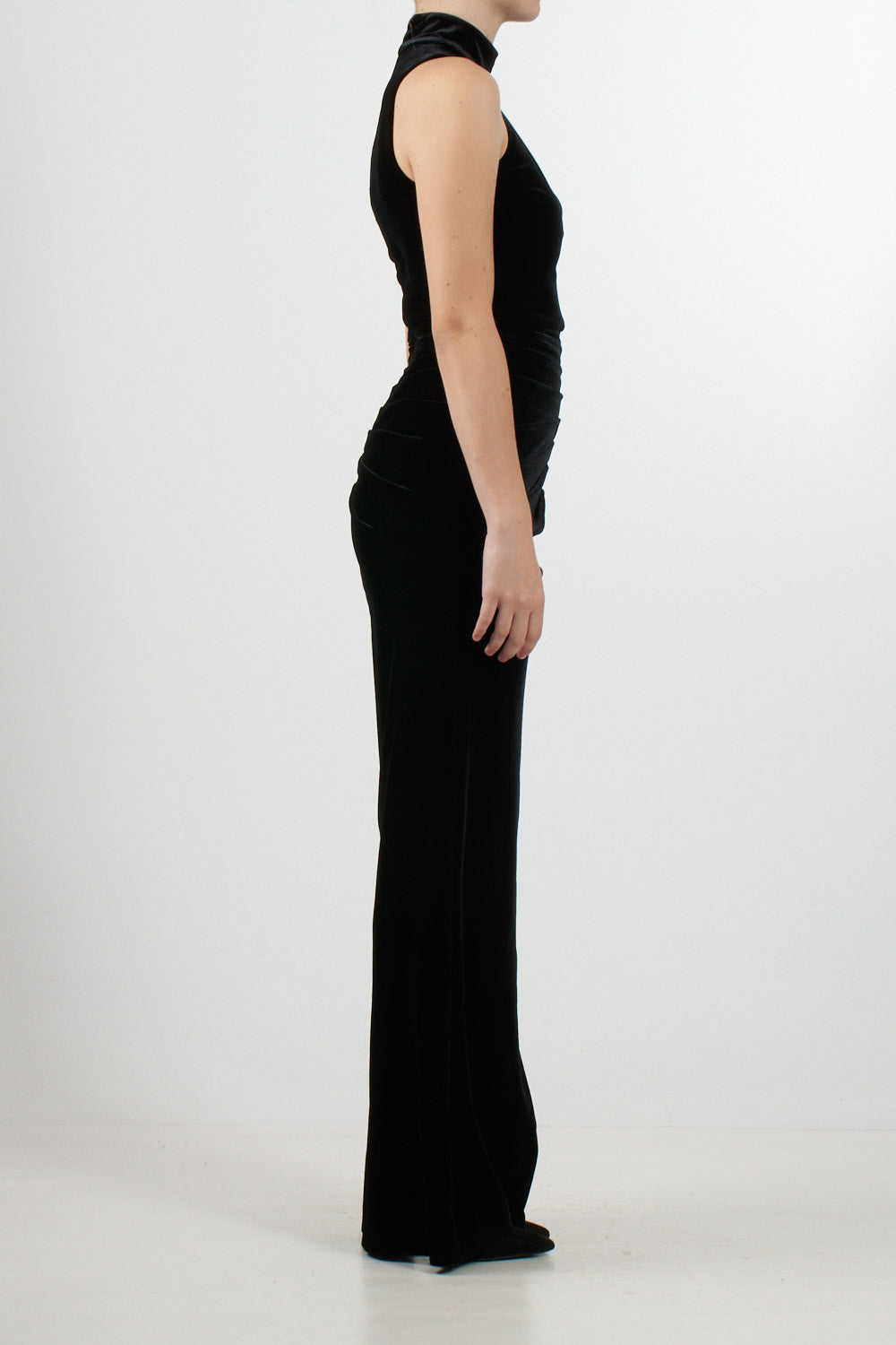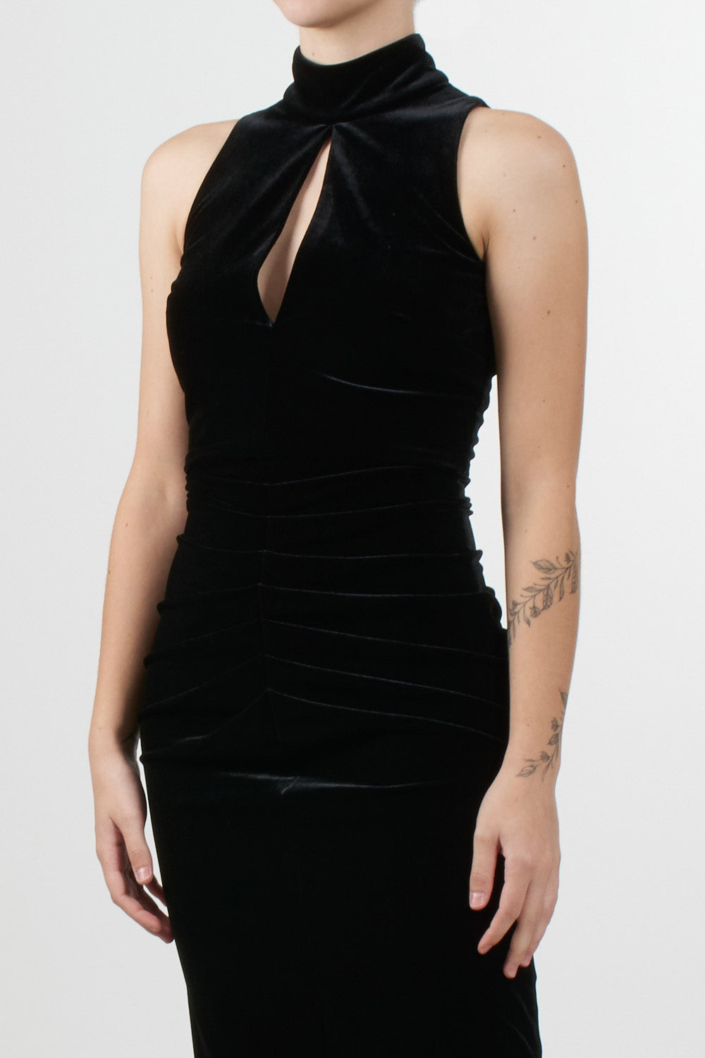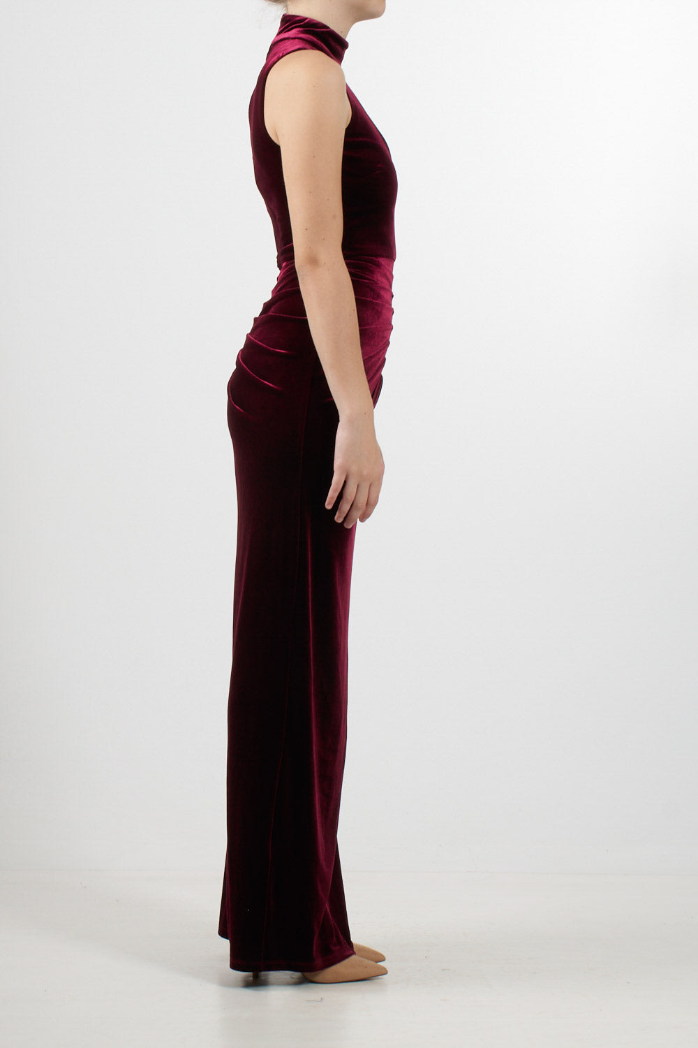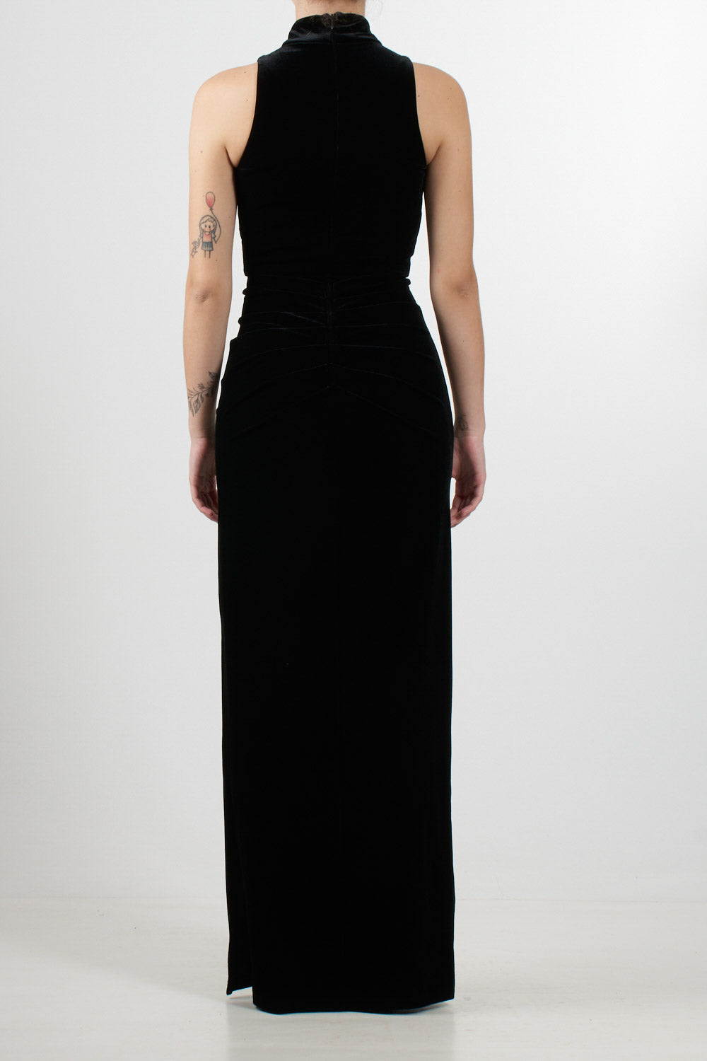Velvet evening dress by No Secrets with a keyhole neckline and high neck. The fitted silhouette is enhanced by draped details at the waist that accentuate the silhouette, while the side slit adds movement and femininity. A sophisticated piece, ideal for elegant occasions.