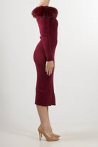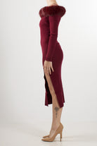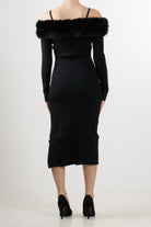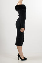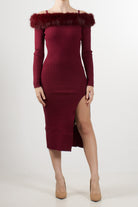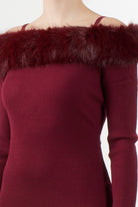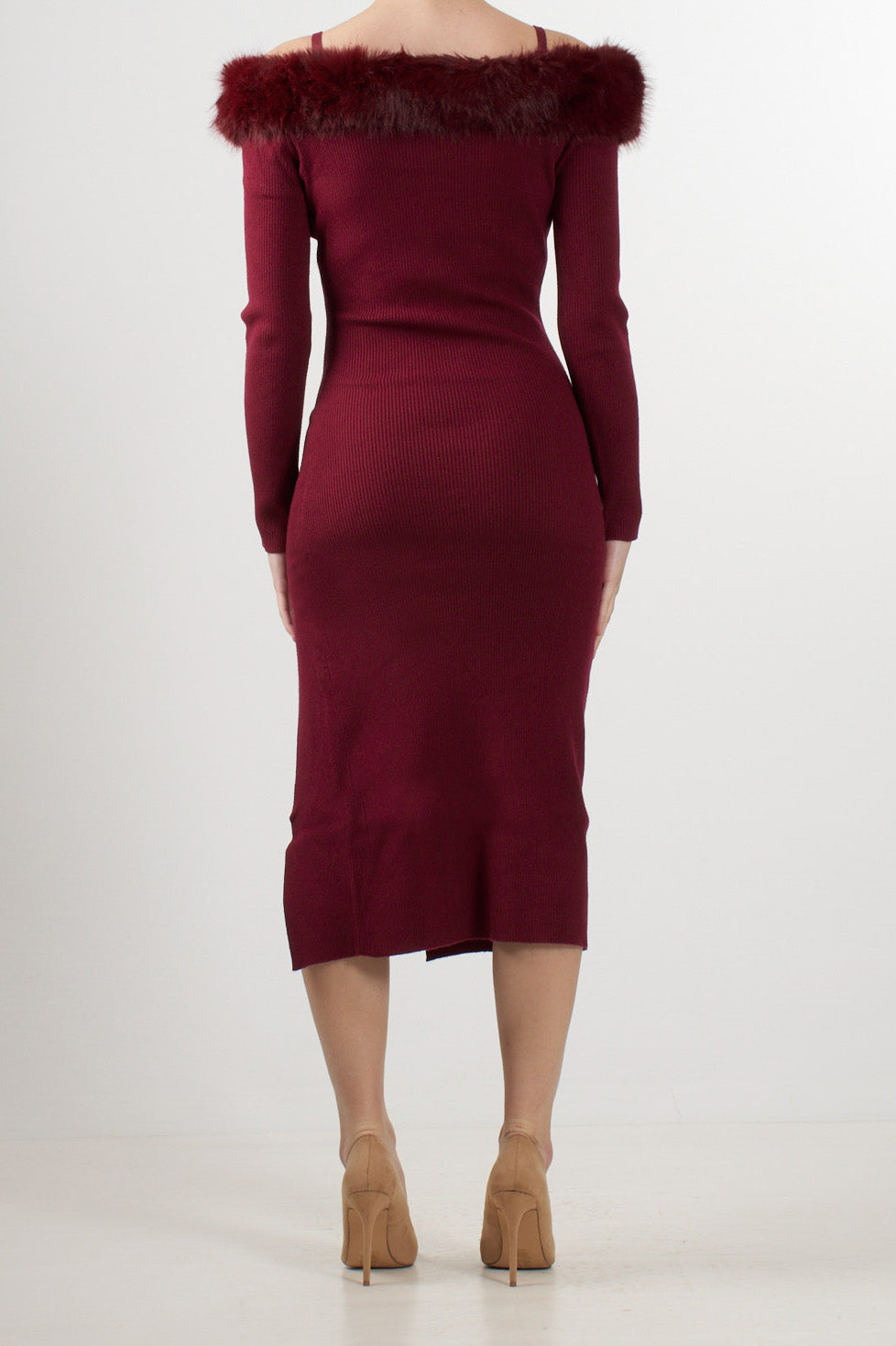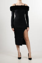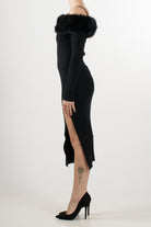 Long, fitted ribbed knit dress featuring an off-the-shoulder neckline with a matching faux fur trim. The design features long sleeves, thin shoulder straps, and a side slit that accentuates the silhouette with an elegant, contemporary touch. A sophisticated piece perfect for winter and evening occasions.