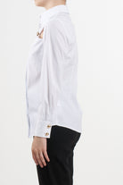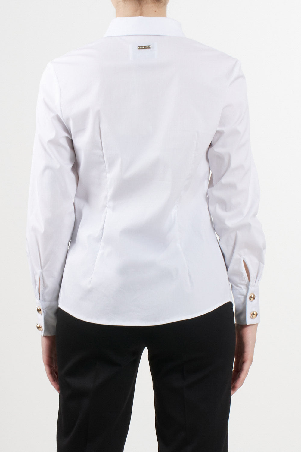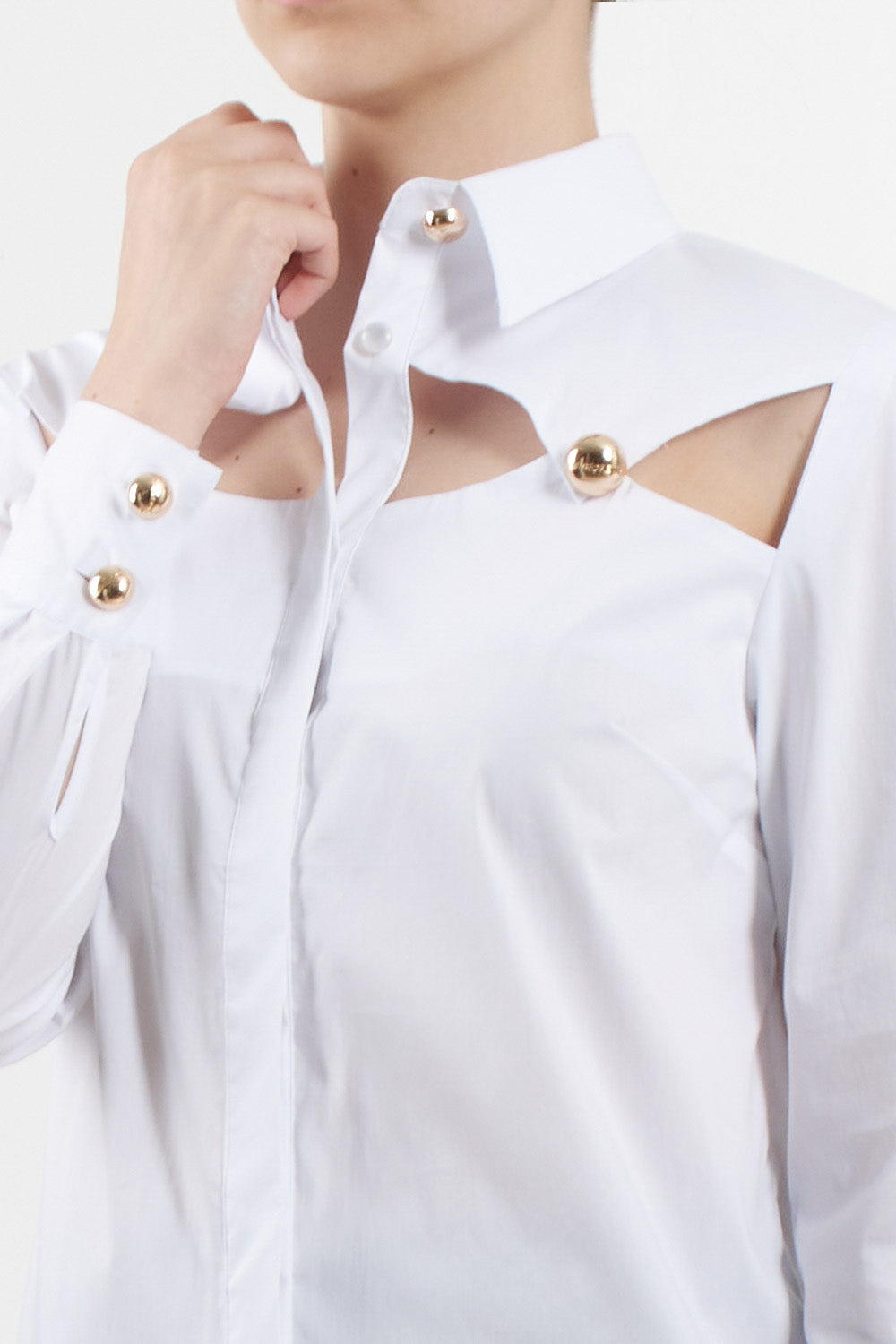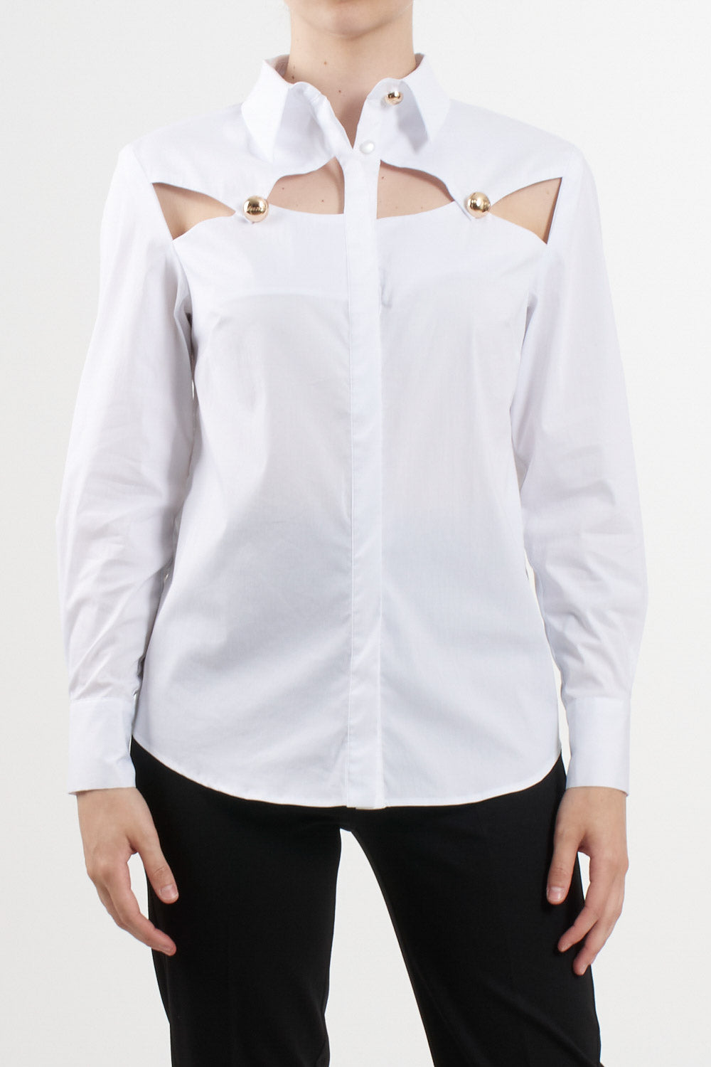 No Secrets white long-sleeved shirt, the model features a front opening with covered buttoning and decorative cut-outs under the collar, embellished with gold jewel-effect buttons.