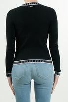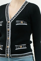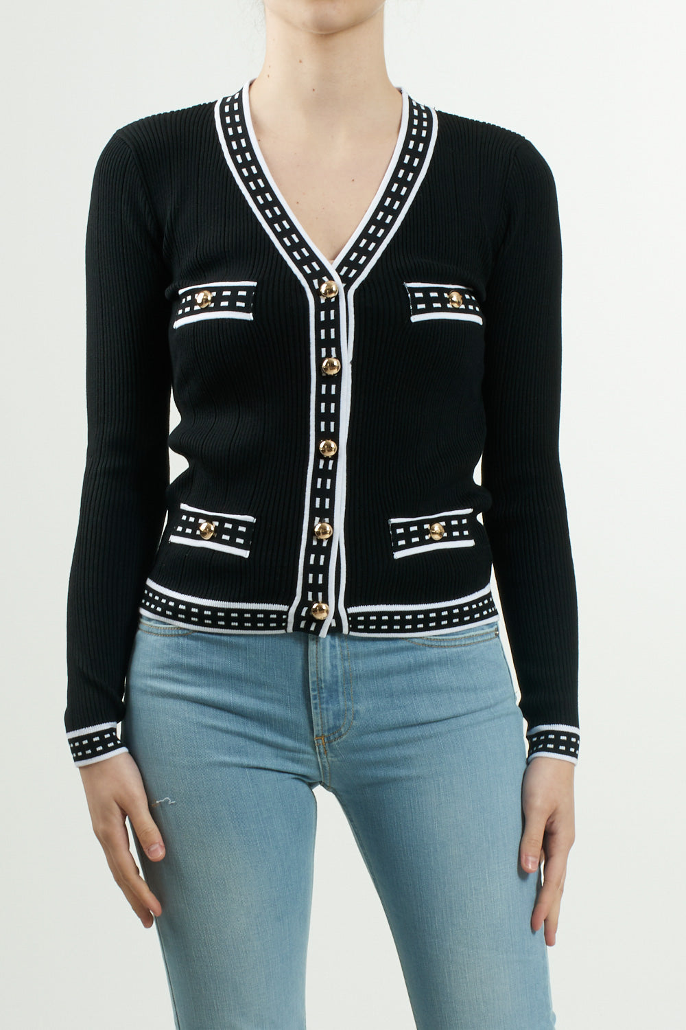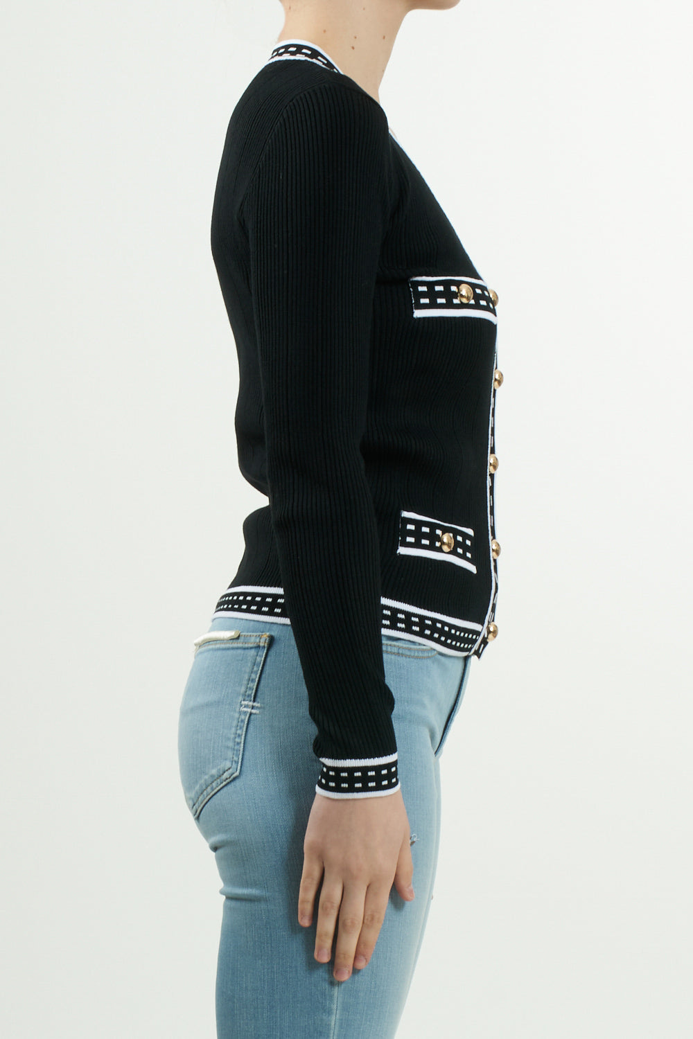 Ribbed knit cardigan with contrast trim and gold jewel-effect buttons. The fitted design with faux front pockets adds a touch of class, perfect to wear both open and closed for a versatile and refined style.
