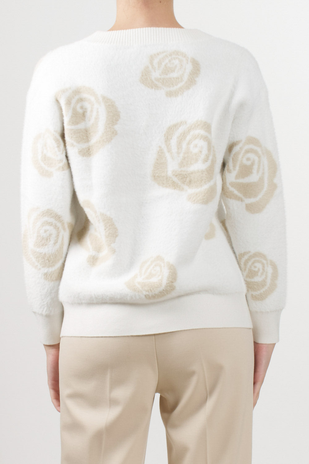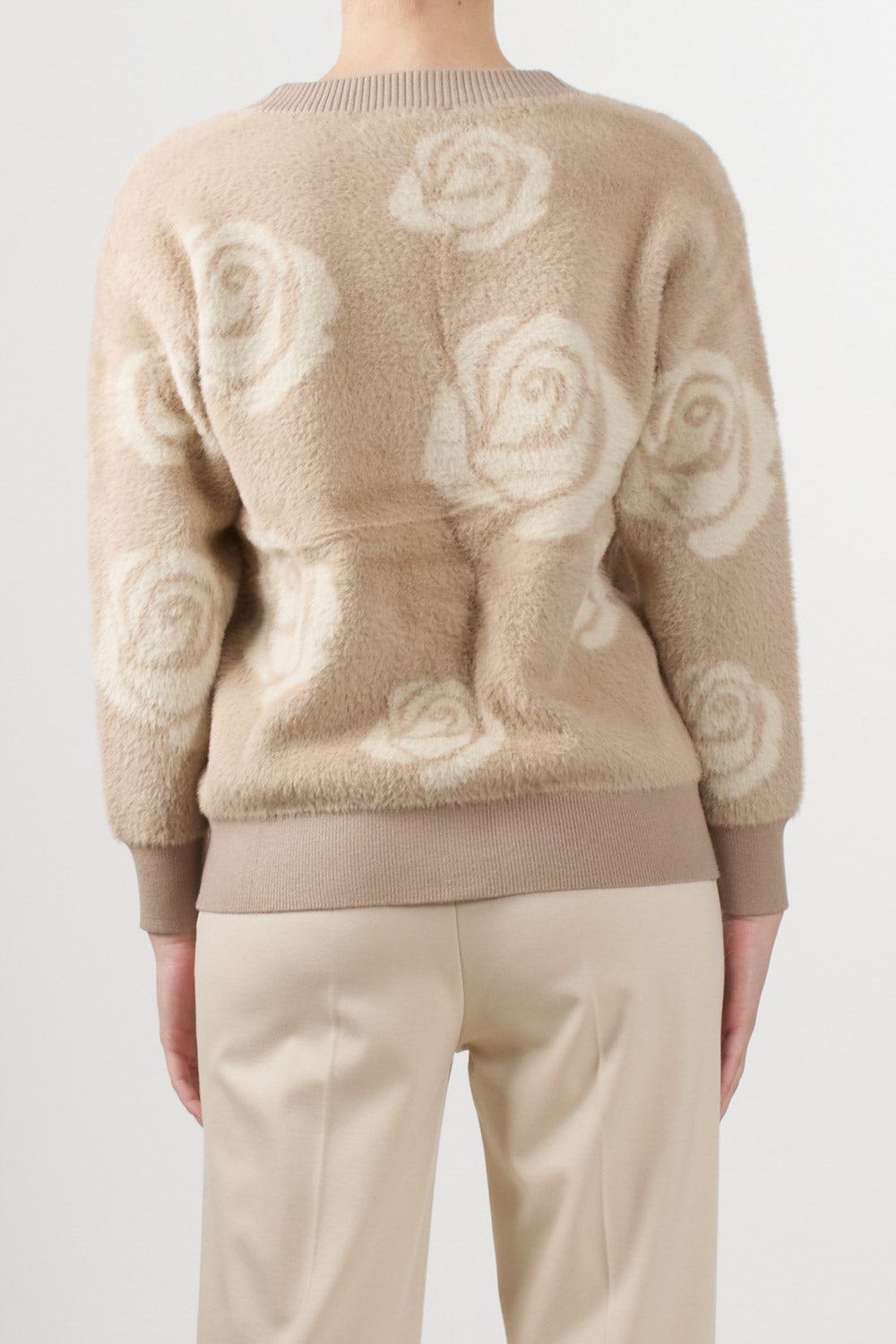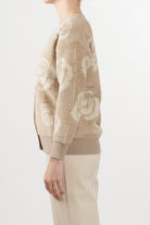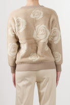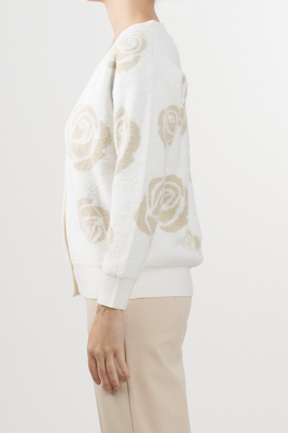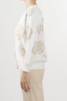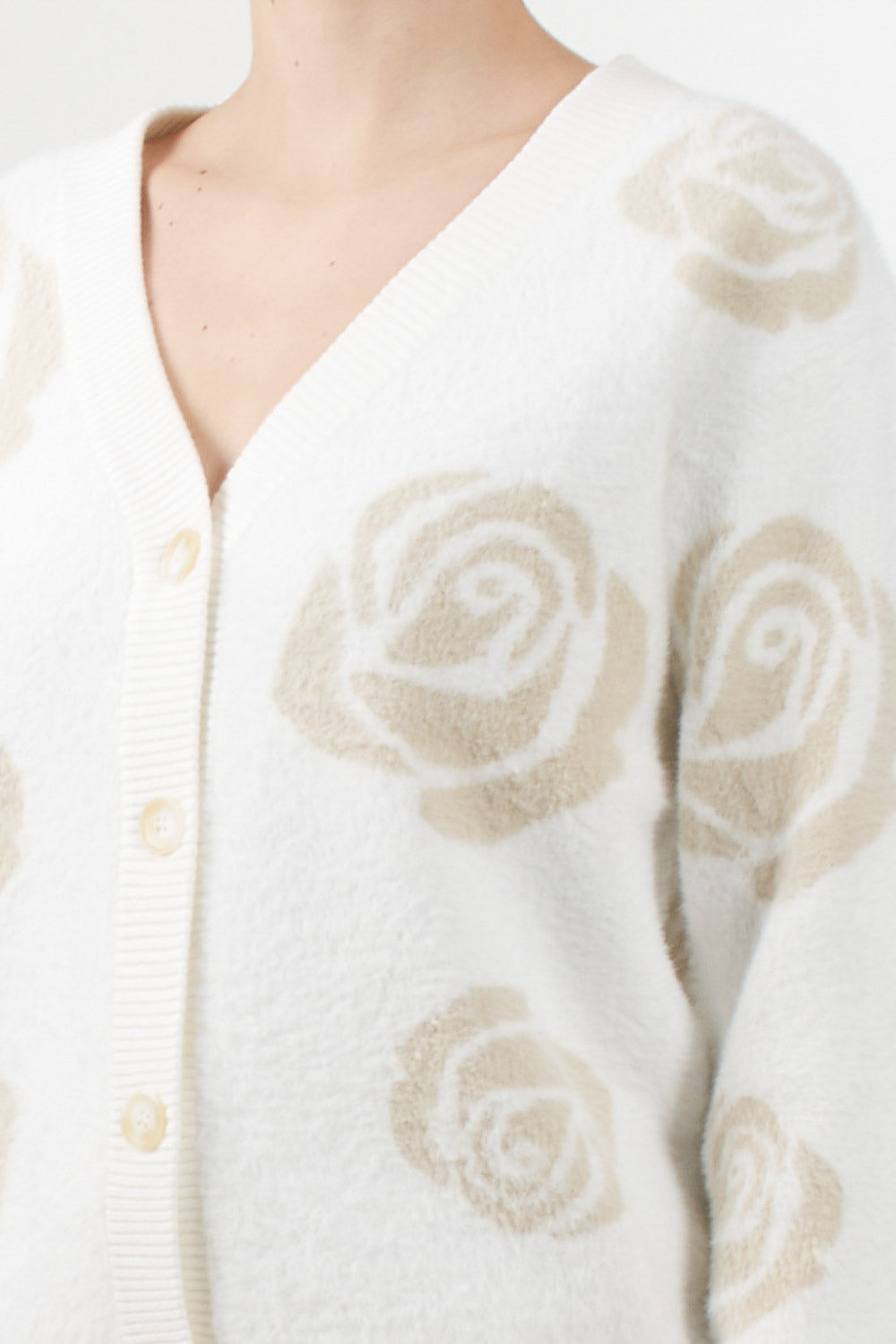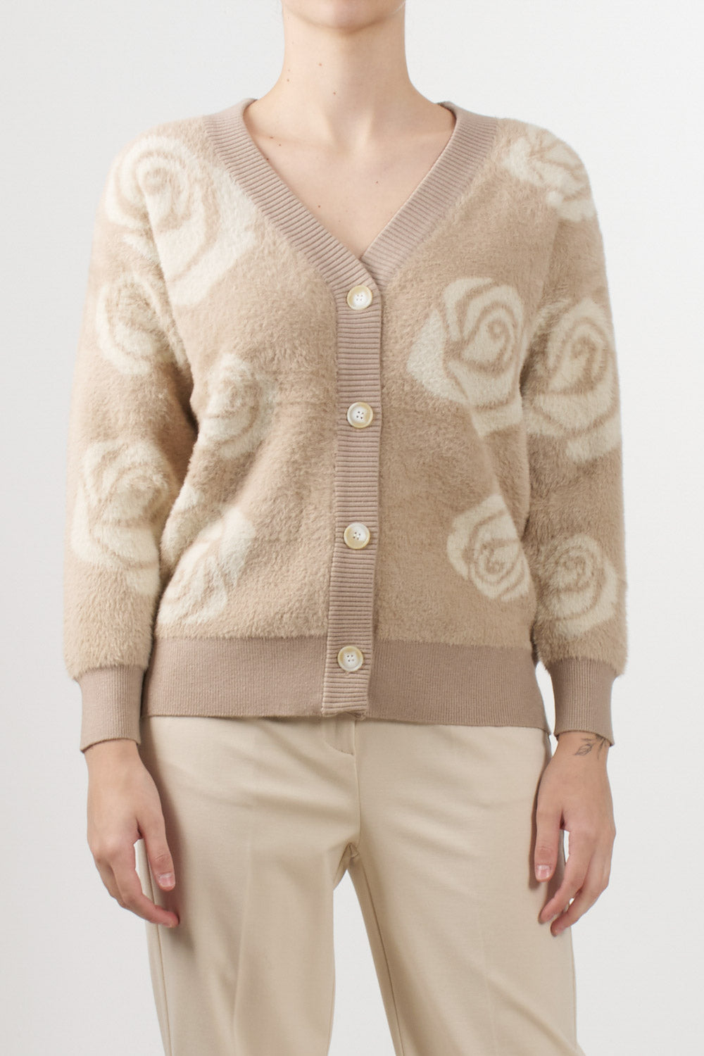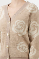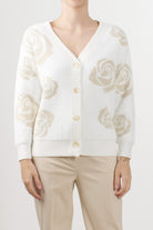 No Secrets cardigan with a jacquard rose motif in neutral tones, V-neck, front button fastening, and ribbed edges on the bottom and cuffs.