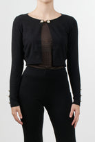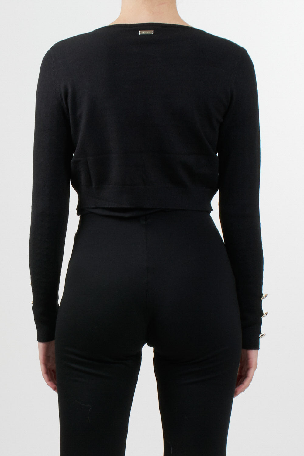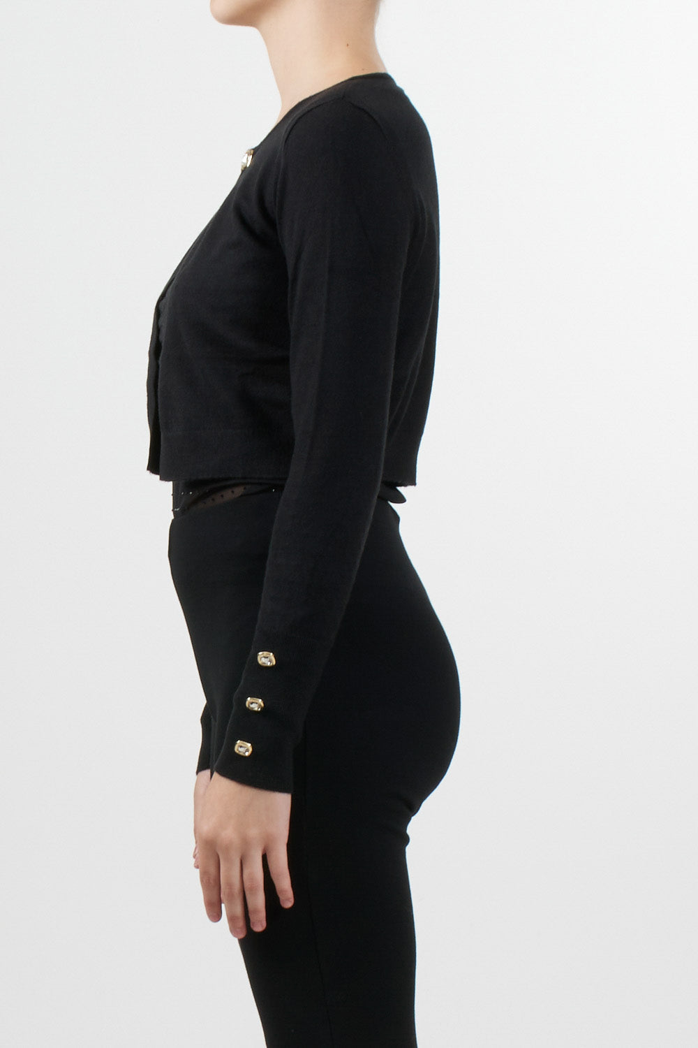 This long-sleeved cardigan features a front closure with jeweled buttons and decorative buttons at the cuffs. Perfect for layering over tops and dresses, it stylishly completes both casual and sophisticated looks.