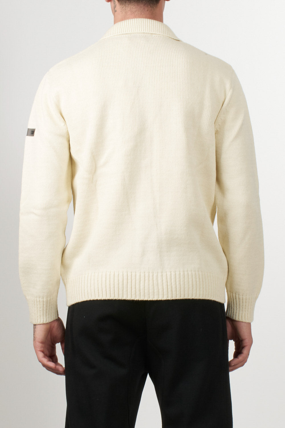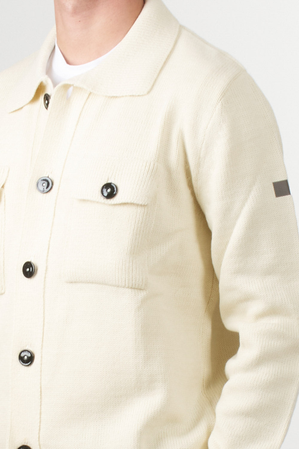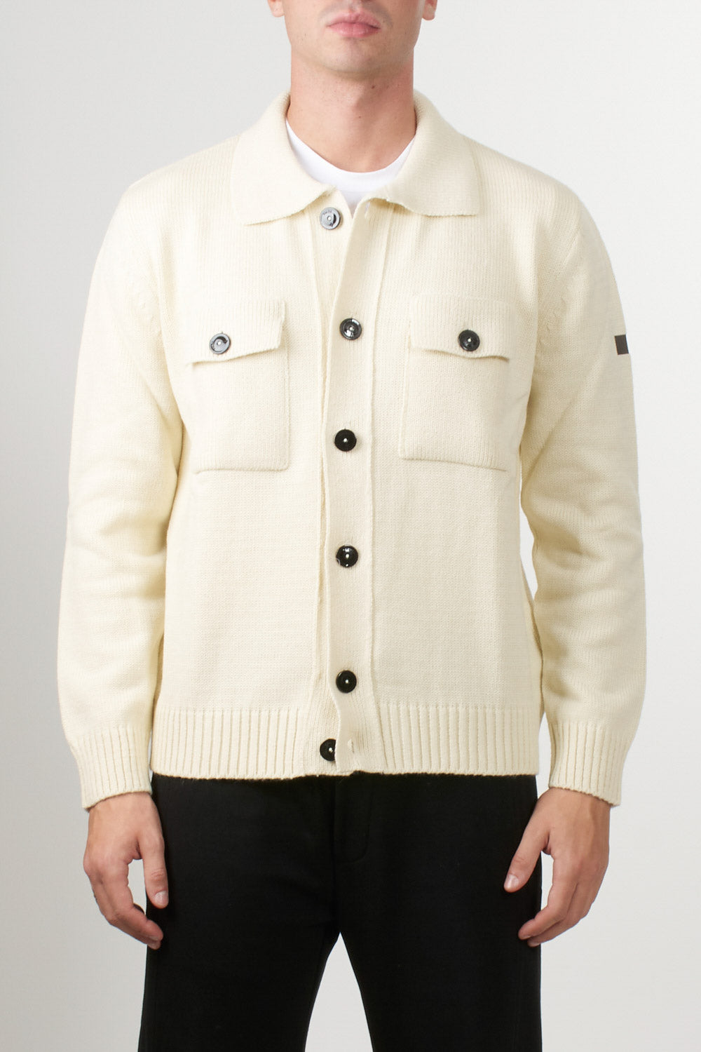 Pmds long-sleeved knitted cardigan with a classic collar and front button closure. The model features two patch pockets on the chest with flaps and buttons, and ribbed finishes on the cuffs and hem.