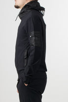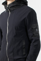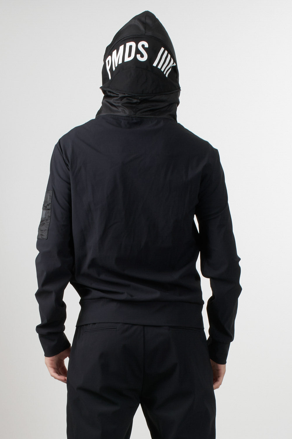 PMDS sweatshirt with a sporty, urban design, made of stretch technical fabric, an adjustable hood with PMDS logo print on the back, a two-way metal zip closure, and side pockets with flaps and buttons. A snap-button pocket with a tone-on-tone logo is located on the left sleeve. Elasticated hem and cuffs.