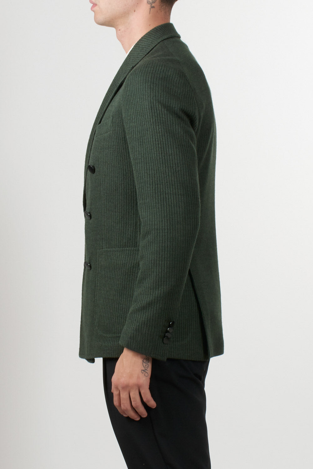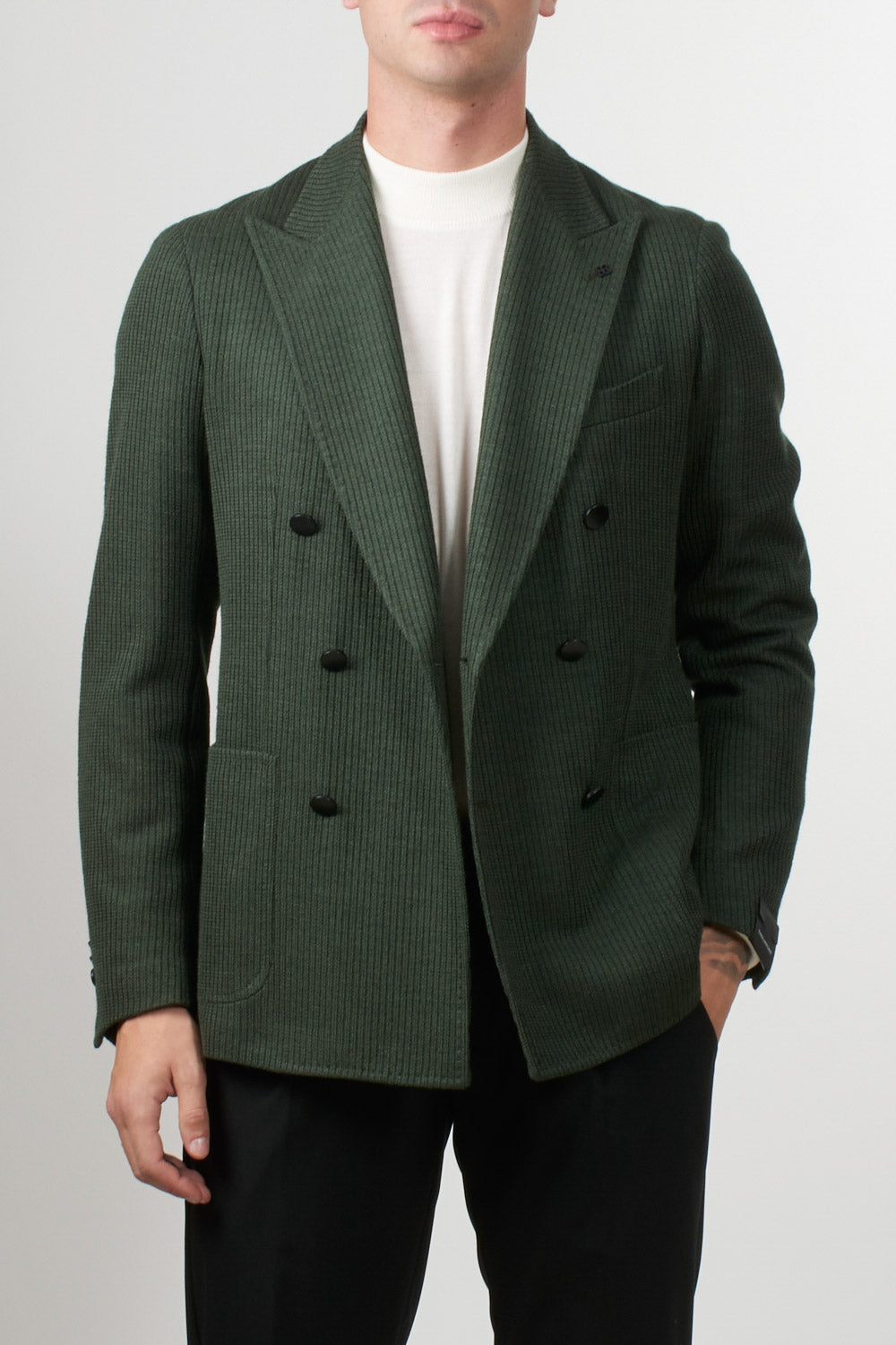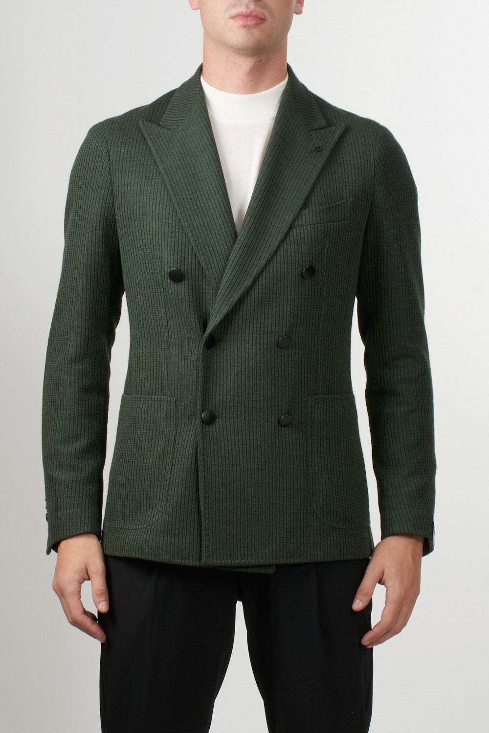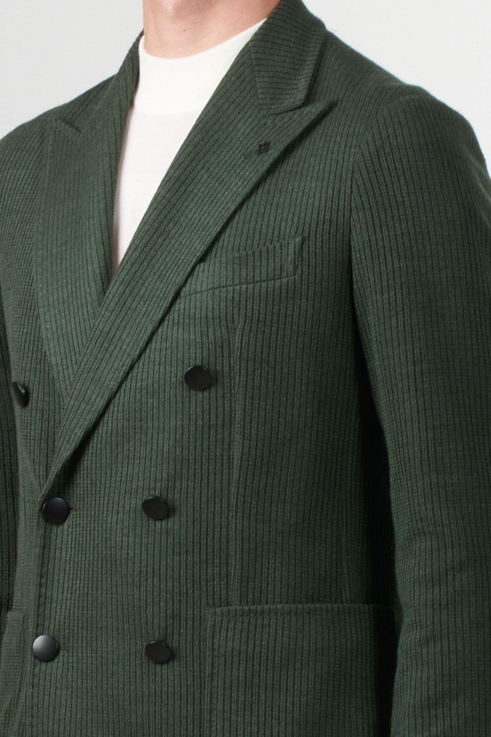 Giacca doppiopetto a sei bottoni realizzata a costine. Presenta rever a lancia con micrologo sul petto, taschino sul petto e tasche applicate, perfetta per look raffinati con un tocco contemporaneo.