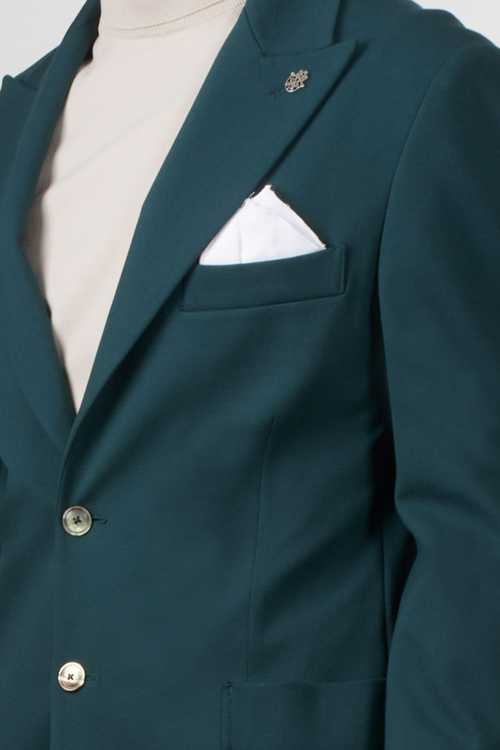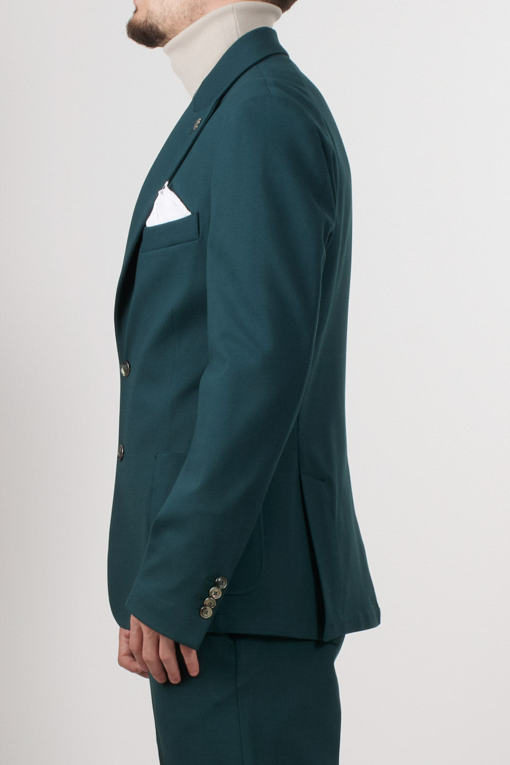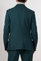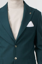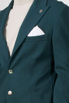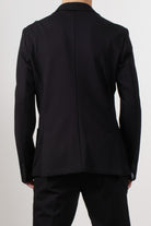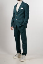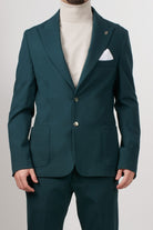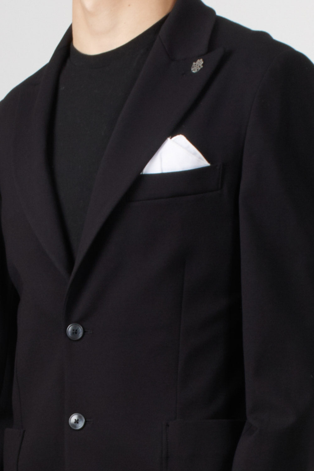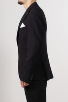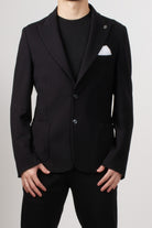 Single-breasted jacket in stretch technical fabric, with a modern and clean style. The design features two front buttons, classic lapels, and patch pockets, perfectly balanced for a contemporary and refined look.