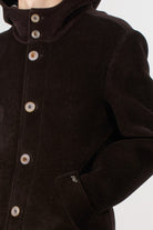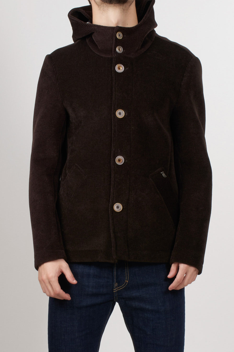 Stretch corduroy jacket with a structured hood, zip and button front closure, and side patch pockets. A versatile and refined piece, perfect for the cold season thanks to its construction and simple yet distinctive design.