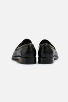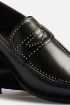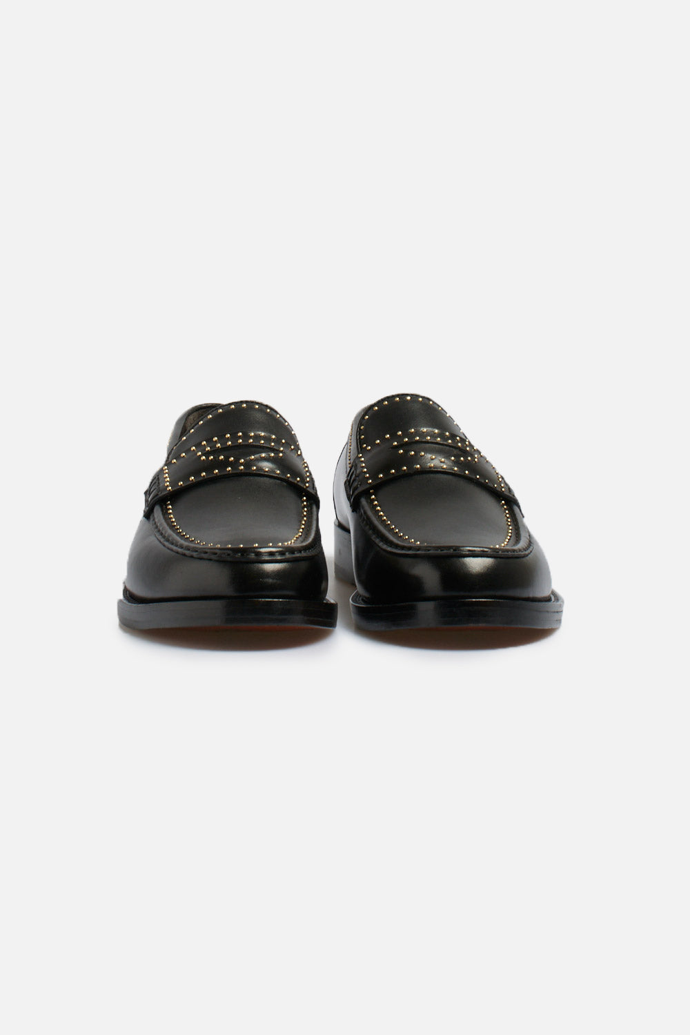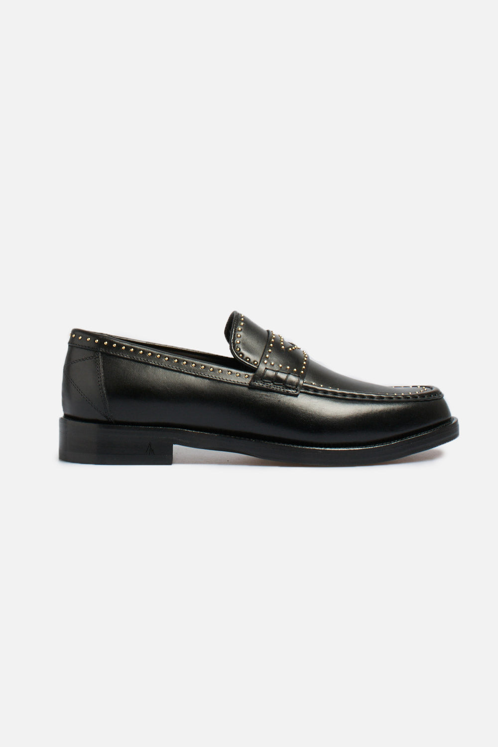Smooth leather loafer by Morgillo, featuring a profile and front strap decorated with gold micro studs. Handcrafted with a rounded toe, leather sole, and Blake construction. Perfect for completing formal looks or refined casual outfits.