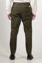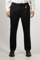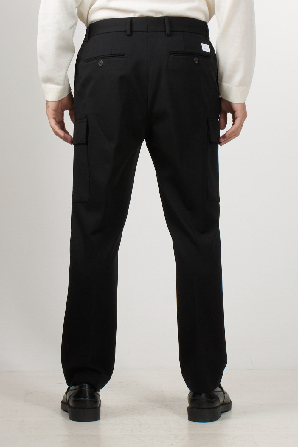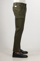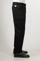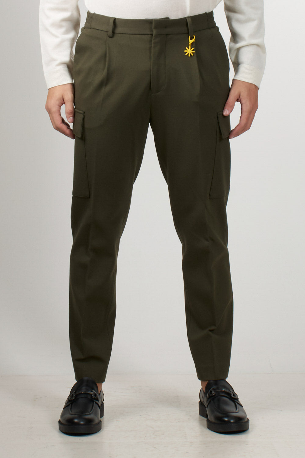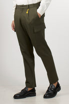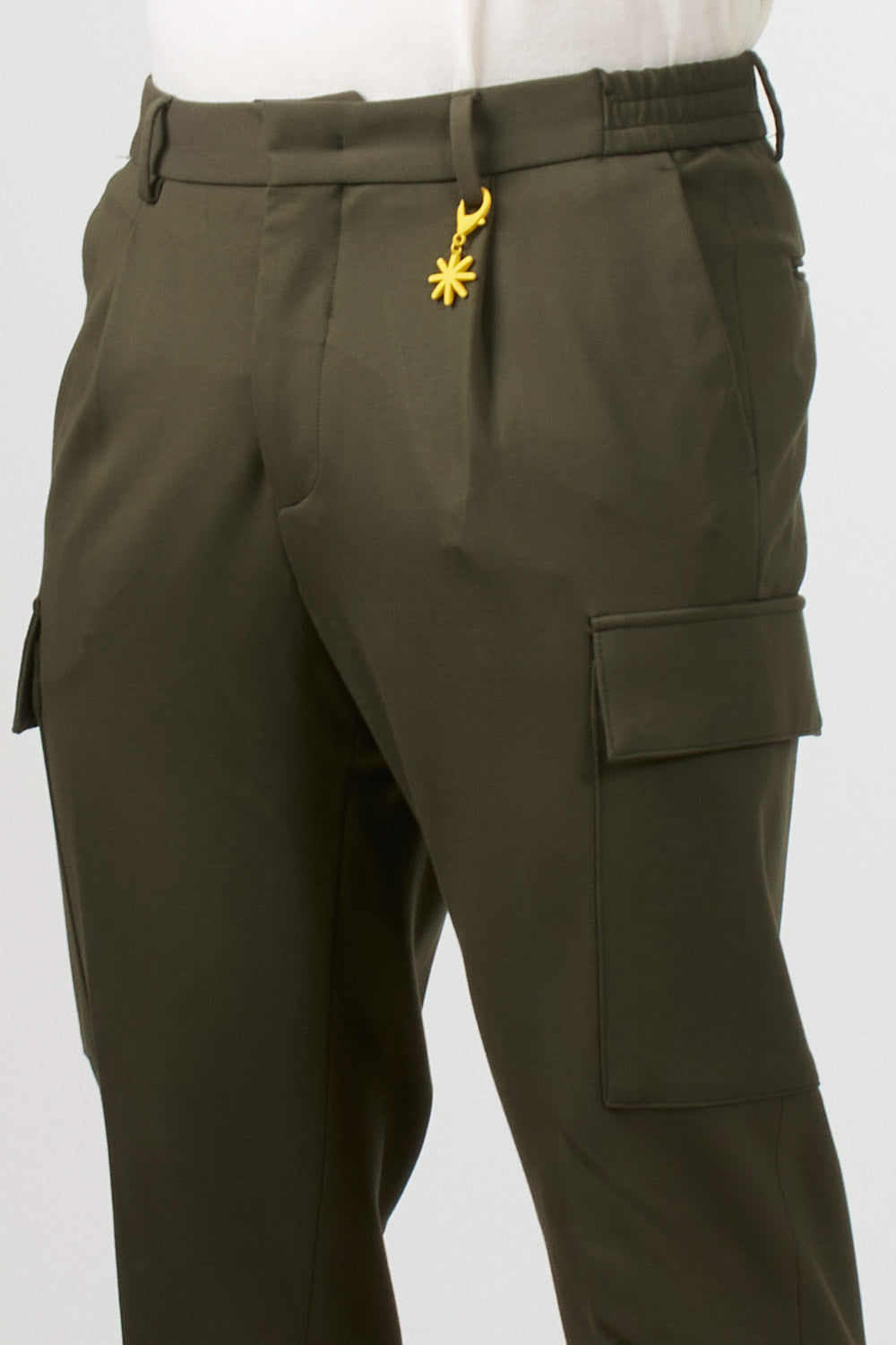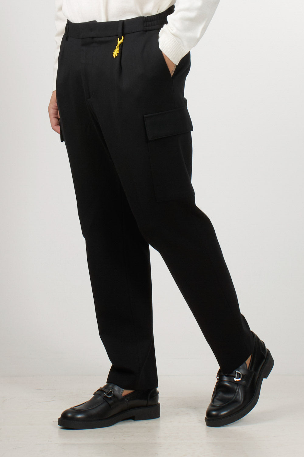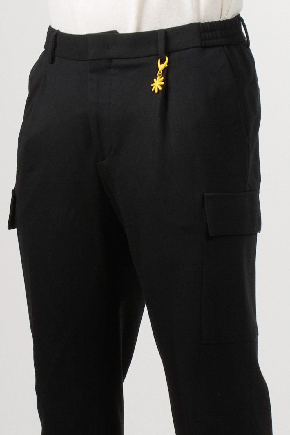 Manuel Ritz cargo pants, featuring a modern fit and functional details. They feature a belted waist, a front zip and button closure, side slant pockets, buttoned back welt pockets, and large side flap pockets. They're finished with a distinctive yellow Manuel Ritz logo charm.