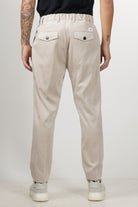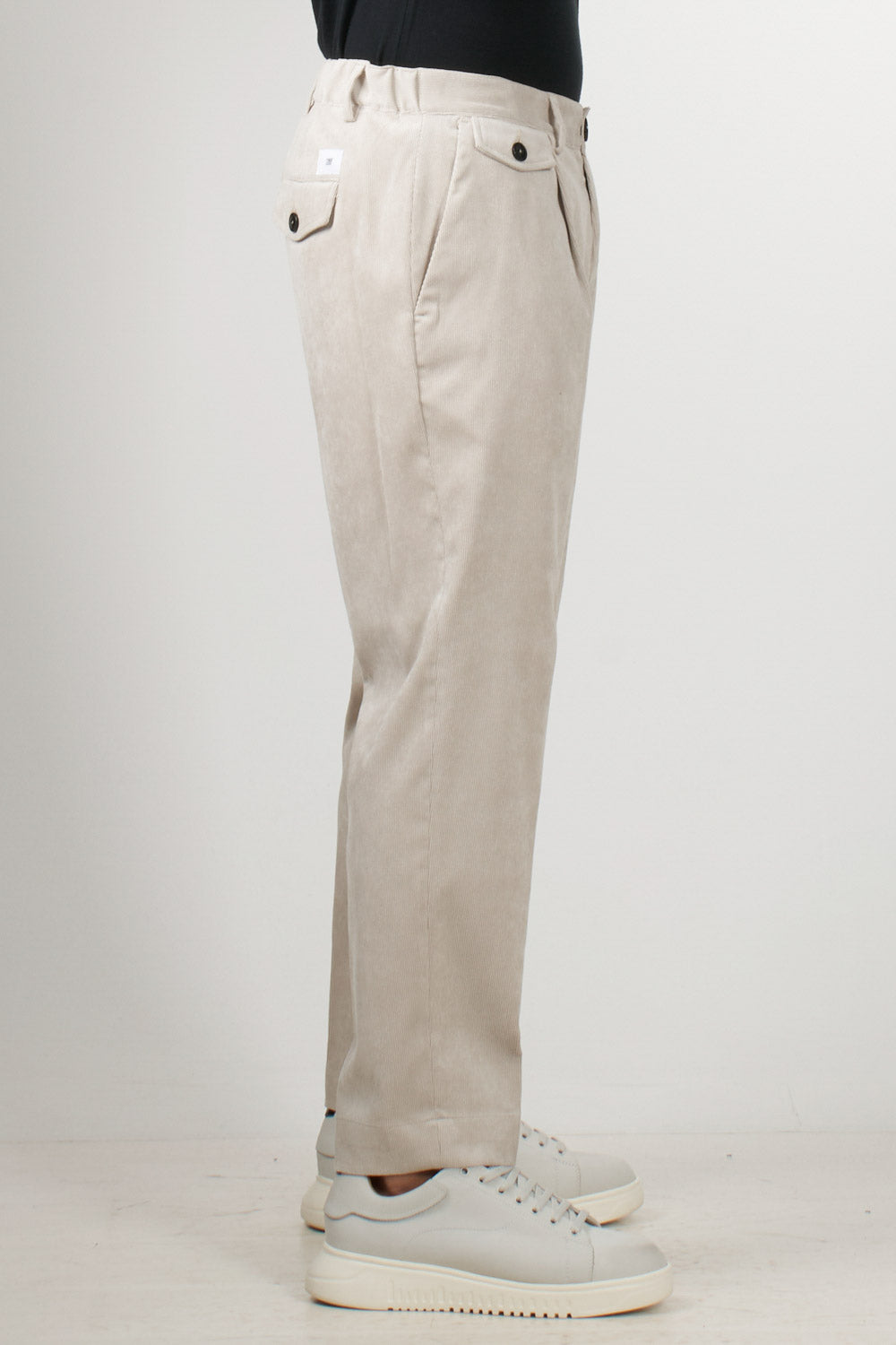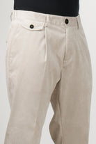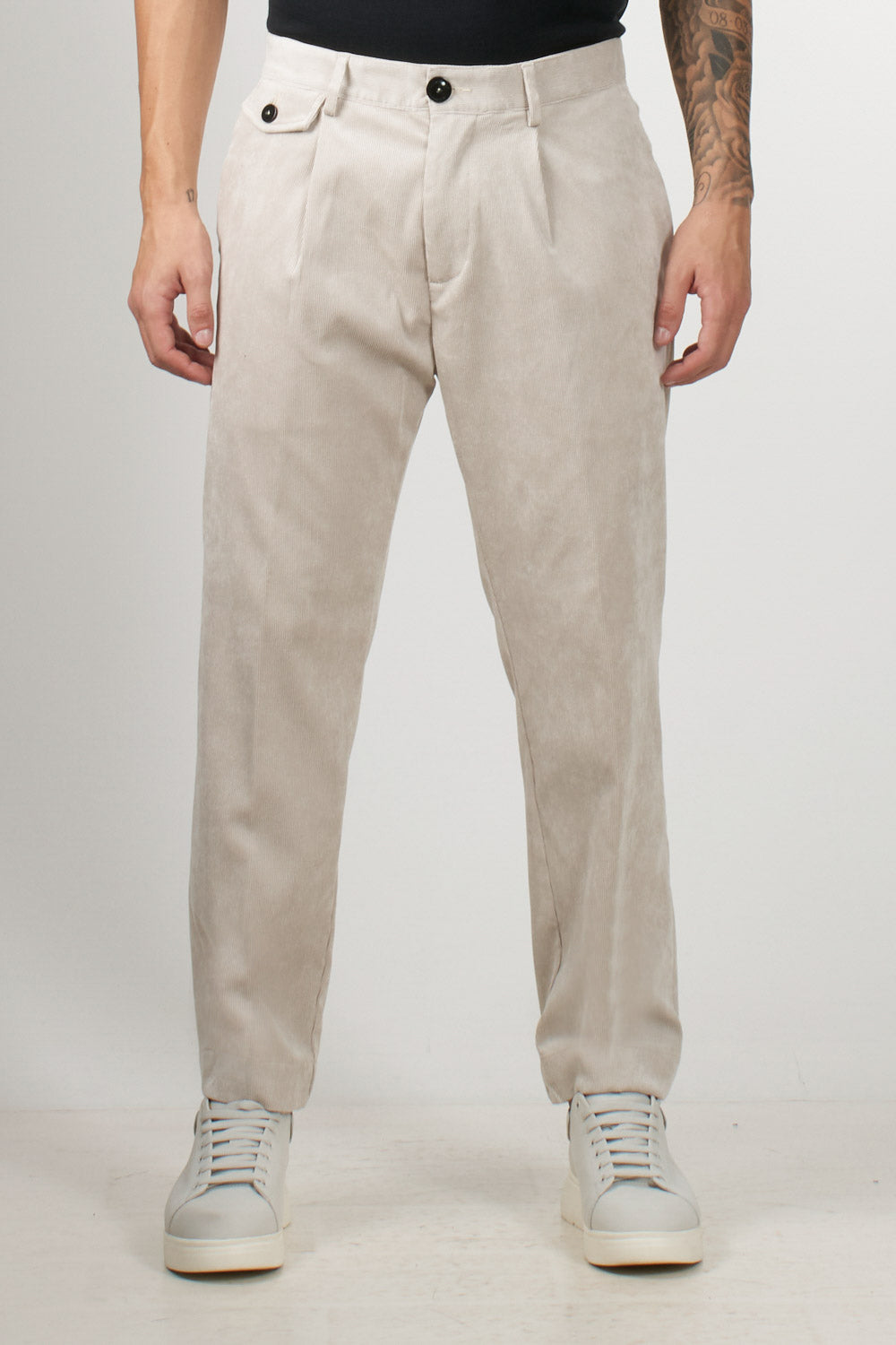 Pantalone in velluto PMDS con pinces frontali, chiusura con bottone e zip nascosta. Il modello presenta tasche laterali oblique e tasche posteriori a filetto con bottone. Linea morbida e comfort fit