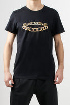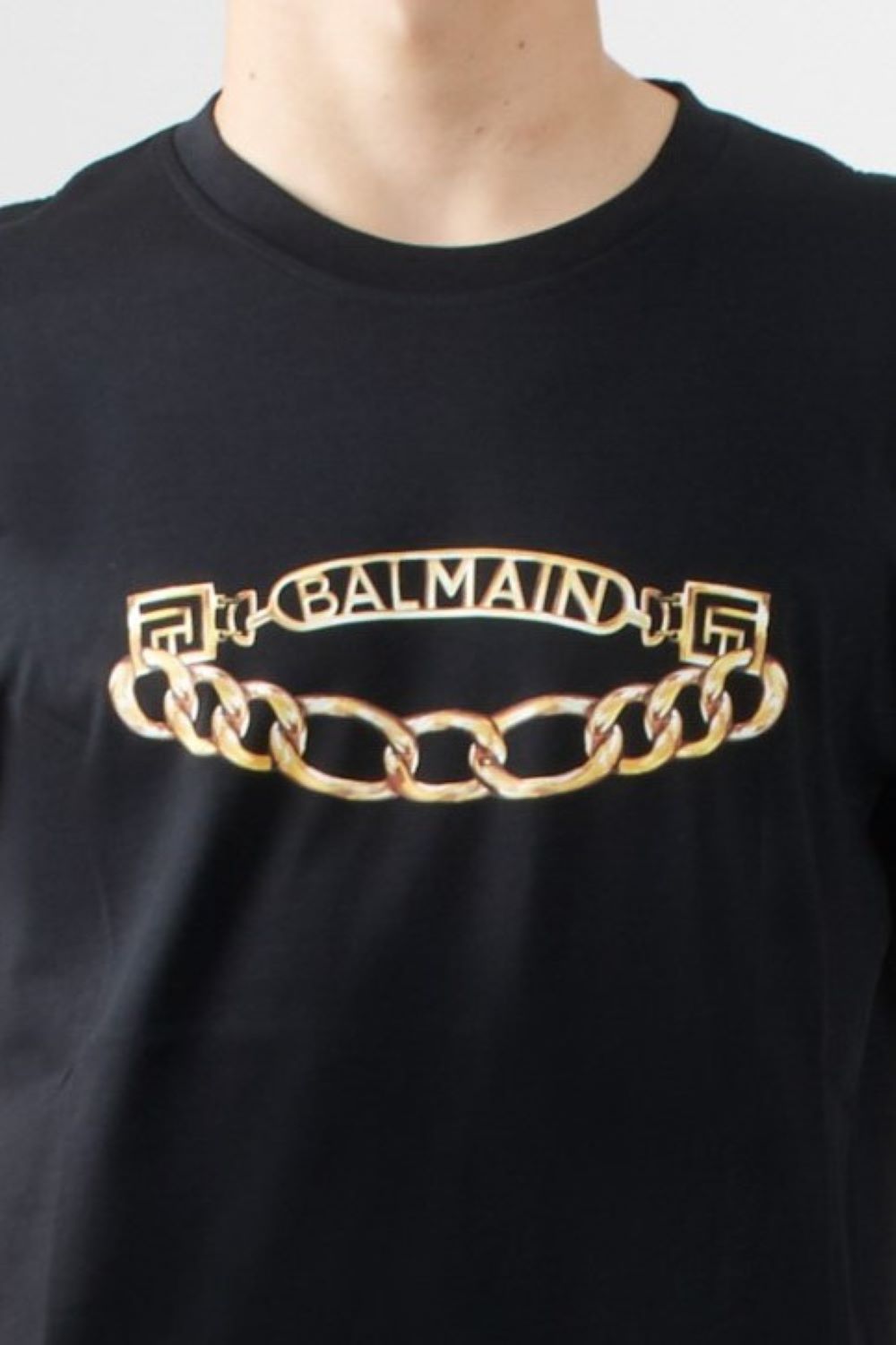 Slim-fit pure cotton T-shirt with iconic Balmain Paris logo print framed by contrasting chains on the front. Round neck and short sleeves.