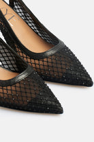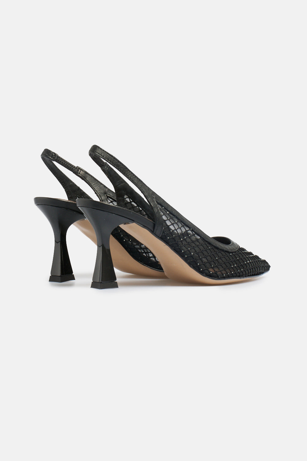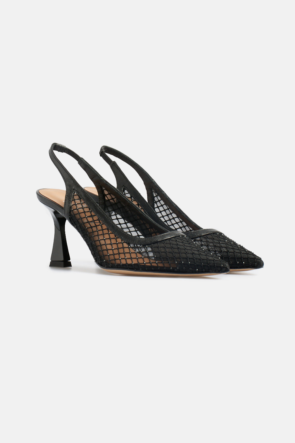 Elegant slingback made of transparent mesh with micro rhinestone details, featuring an adjustable ankle strap. The 7 cm heel gives momentum to the silhouette, while the combination of materials gives a sophisticated and contemporary touch.