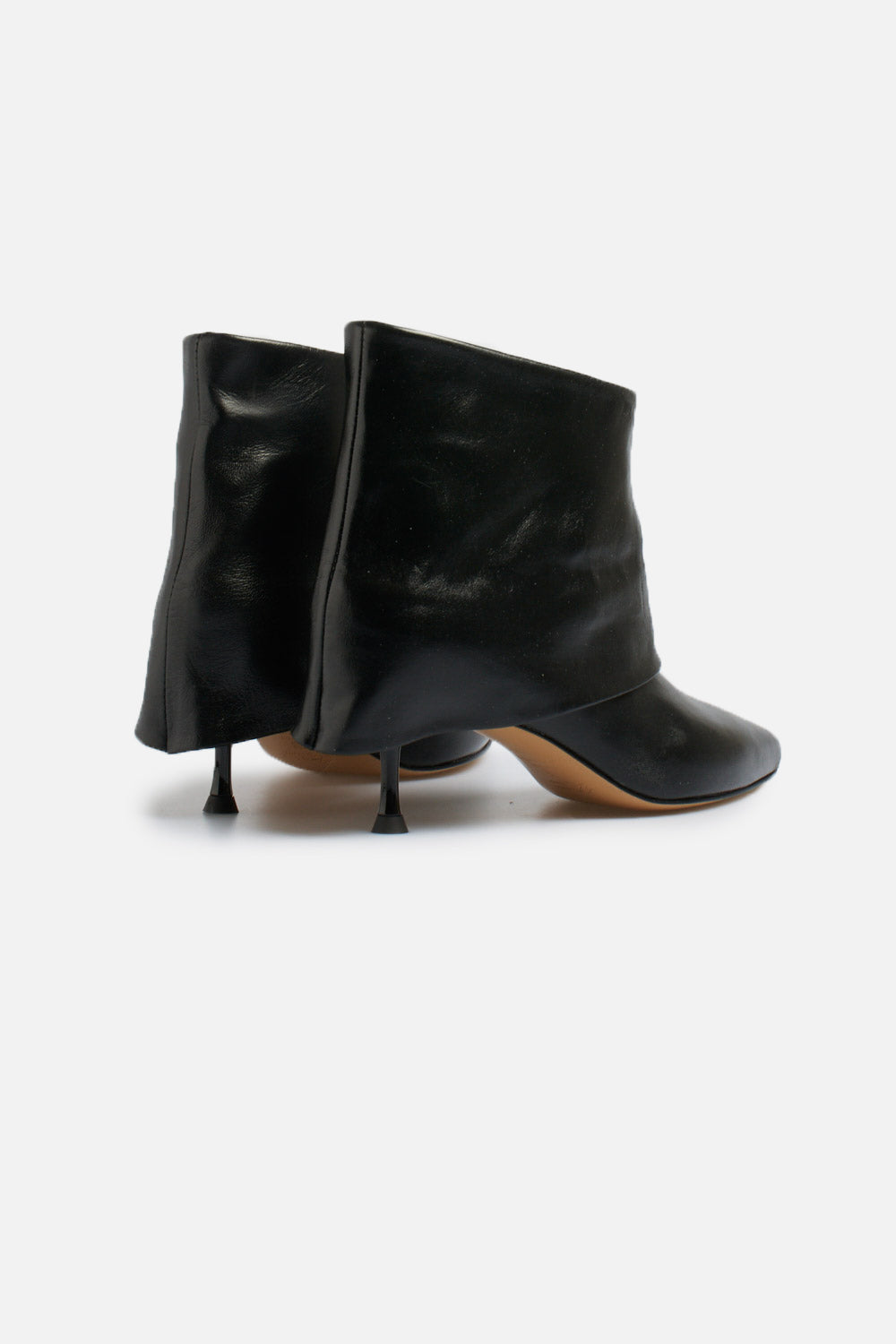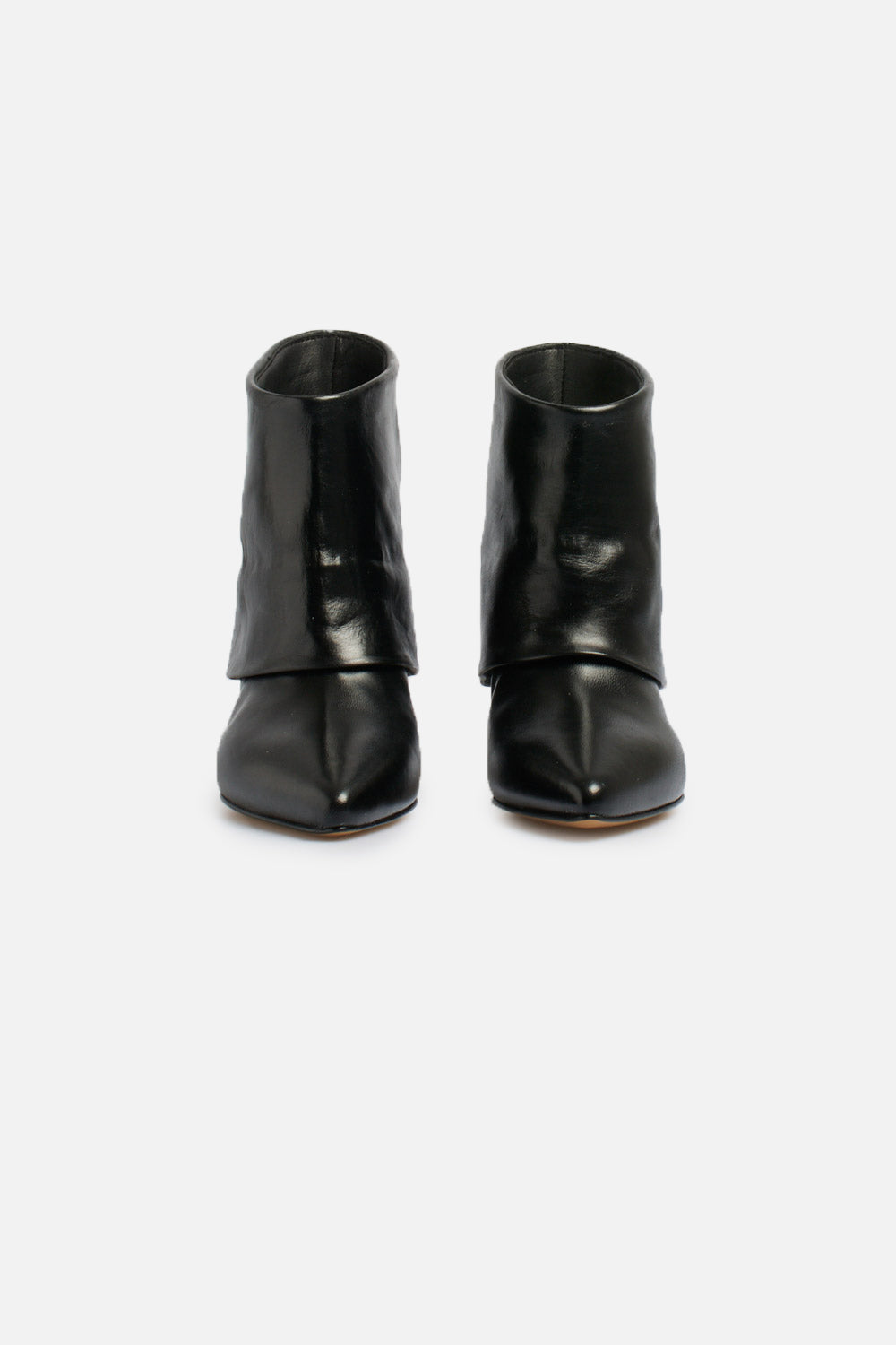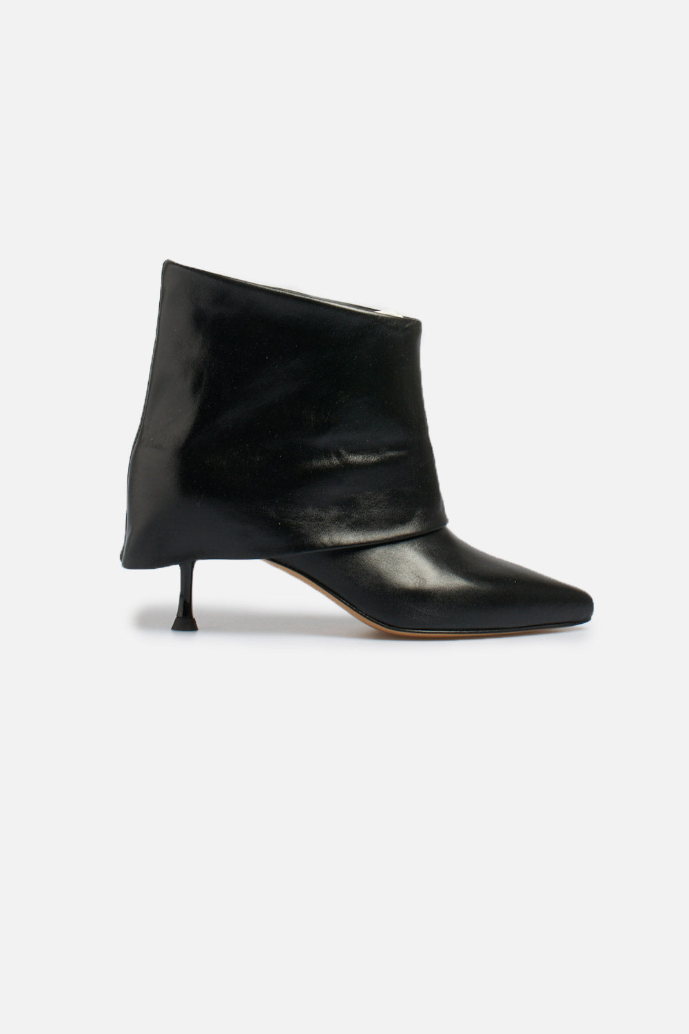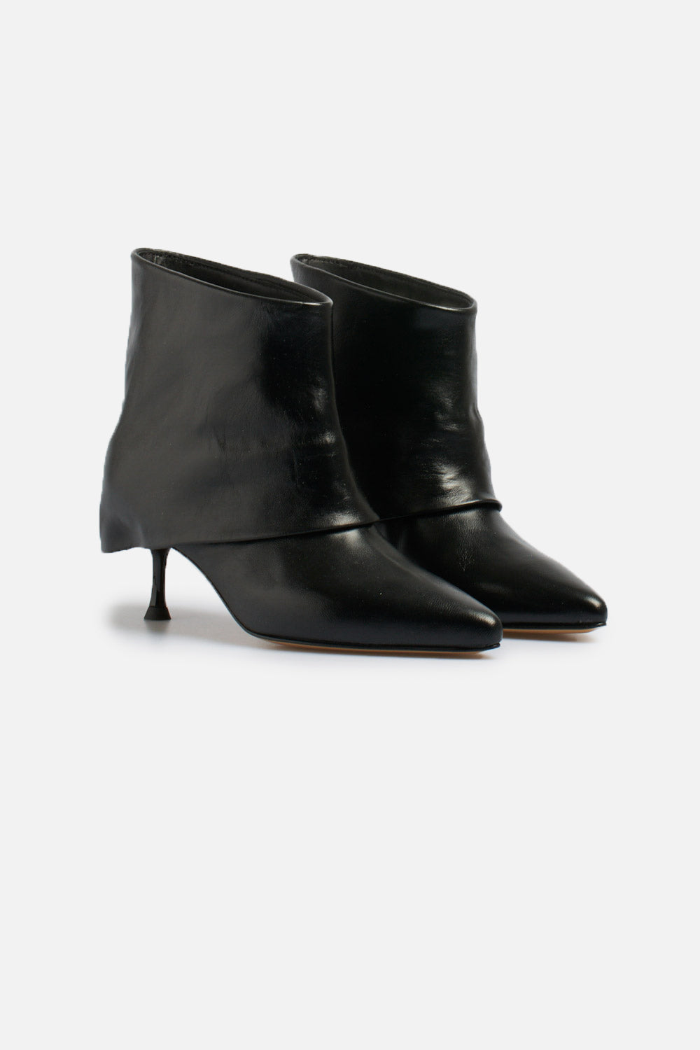 Elegant ankle boot from Ovyè, featuring a pointed toe and a soft fold on the upper that wraps around the ankle with a draped effect. A slim, mid-height heel and clean silhouette create a sophisticated, contemporary look.